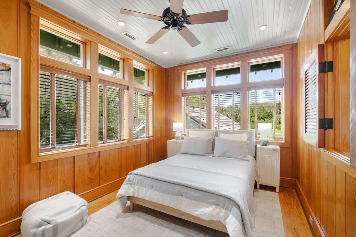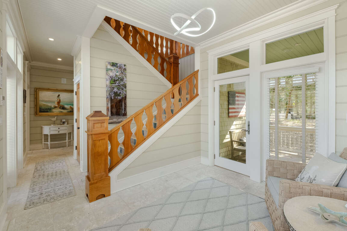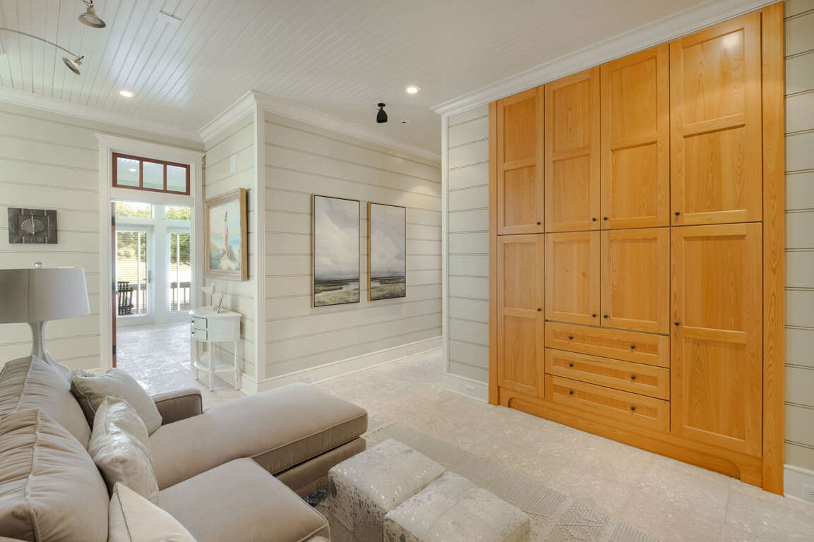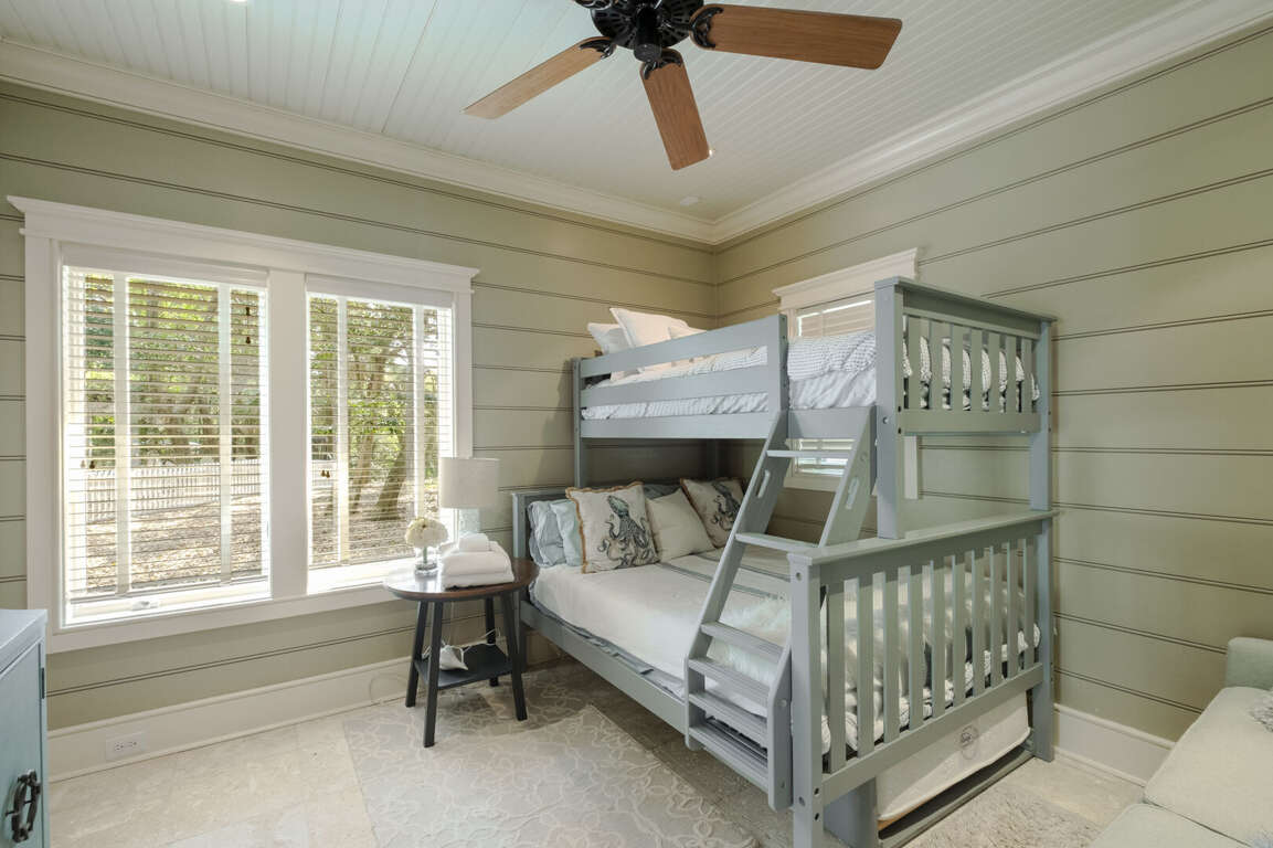 At the end of a winding, wooded road, on a very private double lot under a canopy of Live Oaks, this five-bedroom, five-bath executive sanctuary offers the serenity you seek just minutes from Bald Head Island's beaches, clubs, shops, and restaurants. Overlooking the BHI Club’s seventh green, 7th Heaven's covered front porch welcomes and beckons you to stop, sit, relax, and savor the sounds of ocean and bird song as well as the whispering of breezes through the palms. Alight here or just inside in the bright foyer-furnished for comfy conversation or a quiet read. Around the corner, a central living space with wall-to-ceiling built-ins offers a great alternative to the main living area to play a game or watch a movie. On this level, there are three pampering suites. The first is a sunny corner queen with a large closet, access to the covered back porch, and a beautifully appointed ensuite. The next is a cheery corner king with its own sitting area, a walk-in closet, access to the back porch, and a spa-like ensuite. The third is a bunkroom outfitted with a full and a twin, along with a couch, a large walk-in, and its own bath with a tub. The laundry completes this floor. <br />