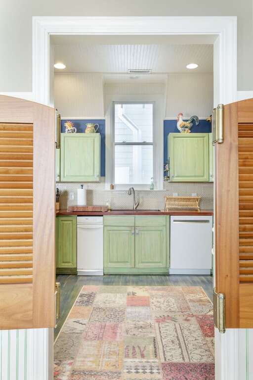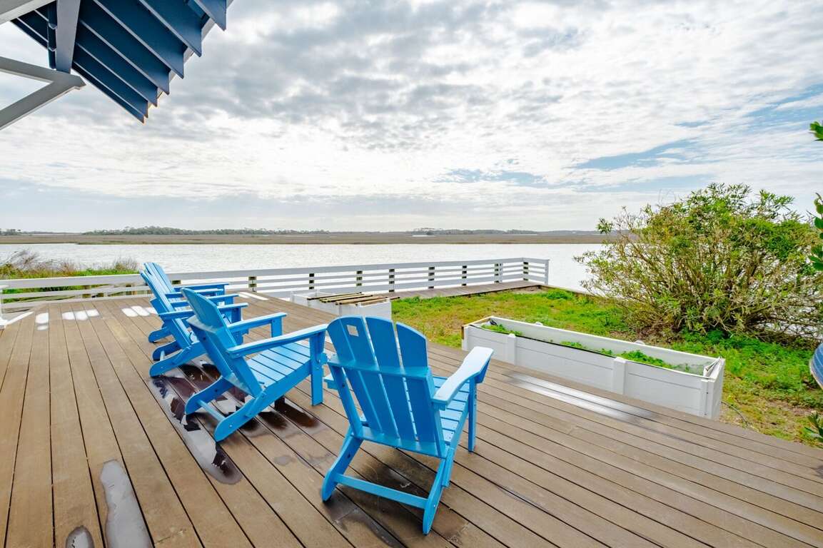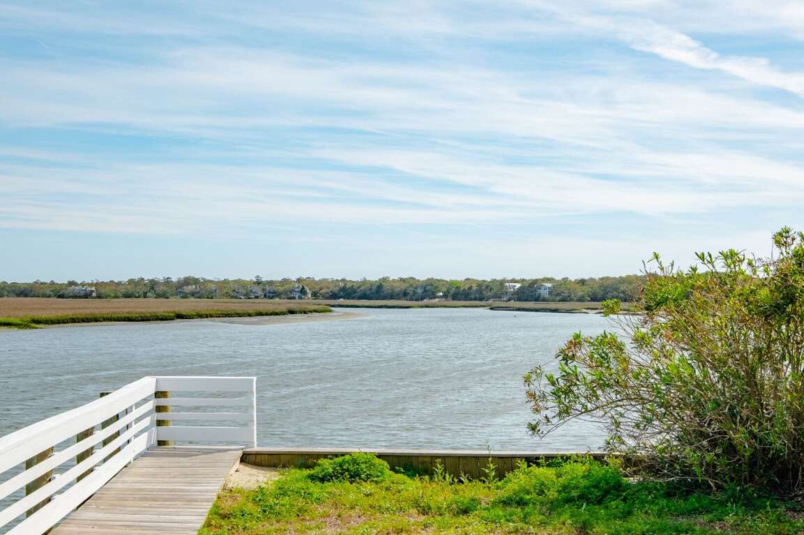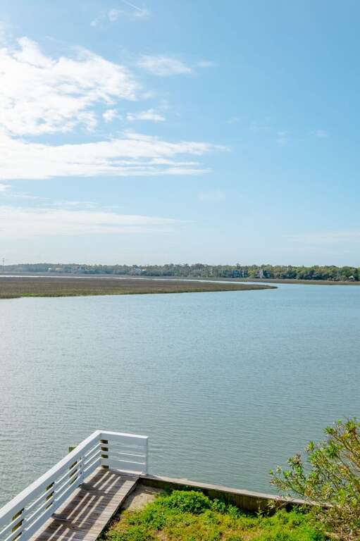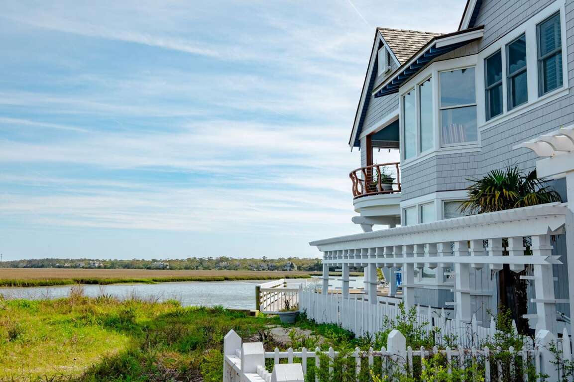 This very private, DOG-FRIENDLY Harbour Village charmer, located on a quiet cul-de-sac, abuts Bald Head Creek, and astounds with spectacular marsh perspectives. As you step under the arbor, through the white picket-fenced yard, you'll perceive gentle ocean breezes as you alight to the covered front porch and into the cozy foyer of this reverse floor plan. To the left, you'll find a sunny corner suite with two twins and a full bath (with tub), which also opens onto the hall. Beyond, a light-filled bayed Queen bedroom, with a sliding door, grants access to a waterside covered porch and sun deck. This is the perfect spot for dipping toes or communing with the Island's natural inhabitants. At the end of the hall, the queen suite's two walls of glass doors delight with panoramas of the sun sparkling off the water of the Island's magnificent marshes. Grab an Adirondack just outside on the semi-covered deck and while away the hours. This suite also has a large bath with his and her vanities, a water closet, a shower, and a large walk-in. A laundry completes this level.<br />