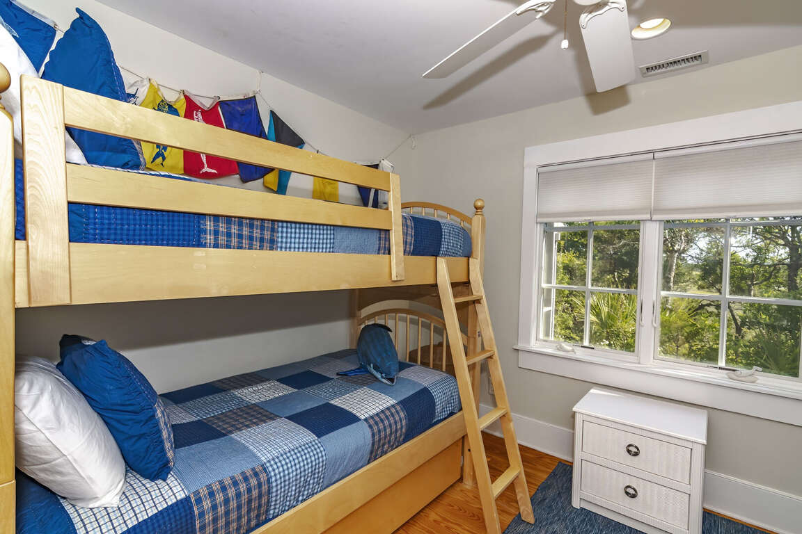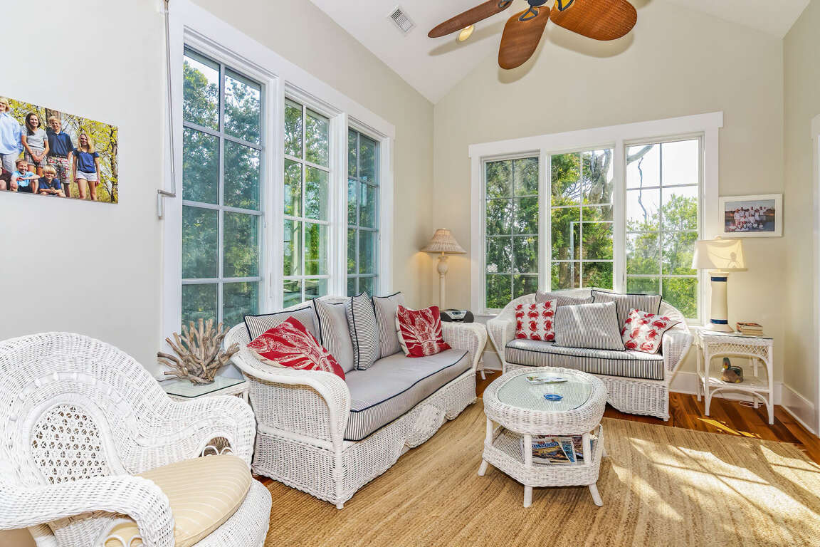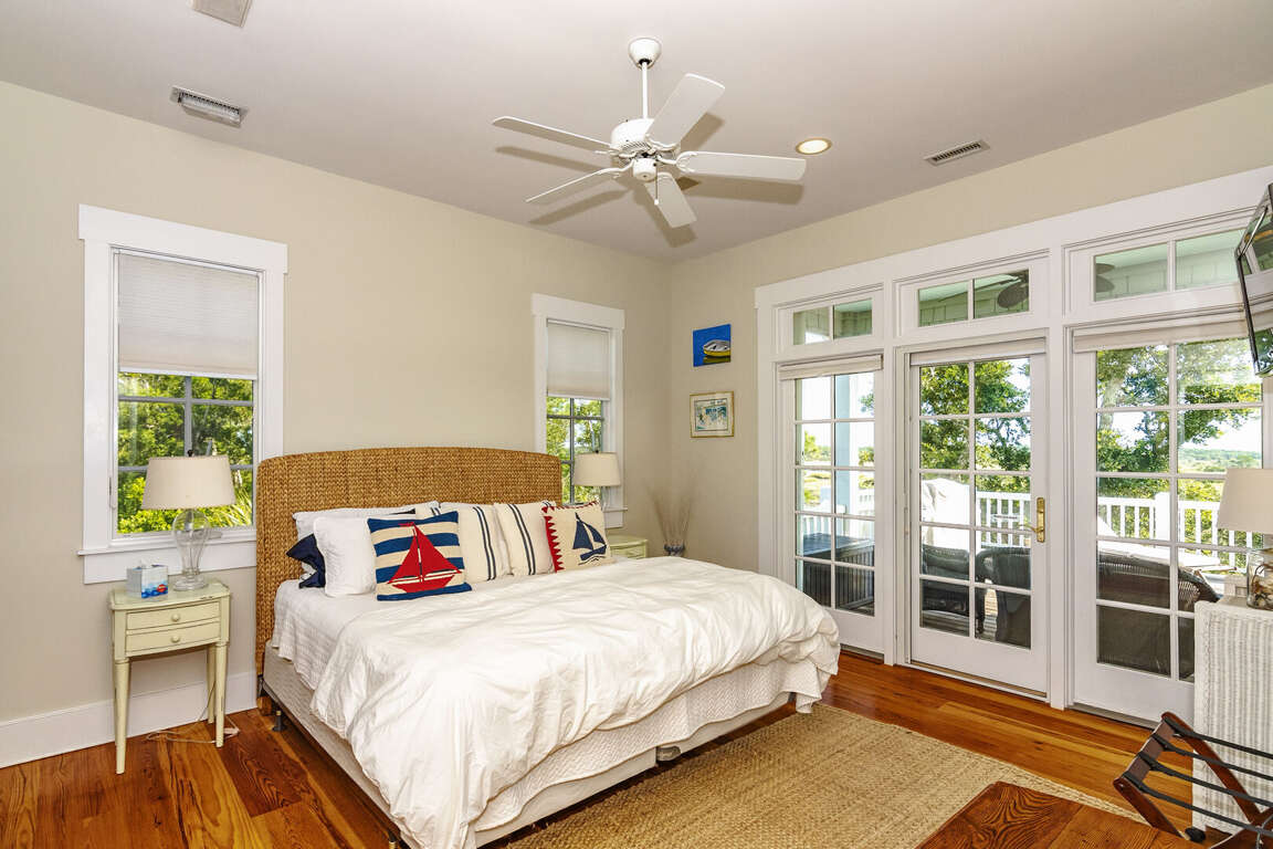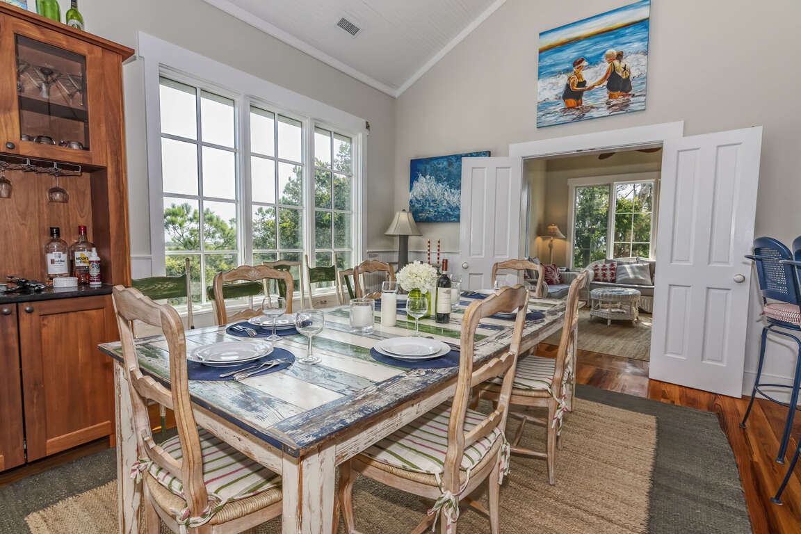 CHARMING will be your first thought as you traverse Barnard House's drive through white picket fences and flowering butterfly bushes. This six bedroom, six and a half bath, retreat on Bald Head's private Middle Island amazes you with its inspiring panoramas, tranquility and comfort. Step into the bricked foyer of this reverse-floor plan home, from there hardwoods lead you to the central lower-level gathering area which is perfect for family game-playing and movie watching. Check out the adjacent dinette with its own coffee bar-perfect for your morning java. Off this space are three bedrooms. The first is a Queen with a full ensuite bath and private access to the back screened porch that houses a ping pong table. The next bedroom is a twin bunk room with an additional trundle. It utilizes the nearby hall full bath. Beyond, a bedroom with two more twins also boasts its own ensuite. At the end of the hall, there's another large, bright corner Queen bedroom with its own ensuite. This level also houses the laundry, three outdoor showers and a placid marsh-front back deck with caressing winds and cicada serenades.<br />