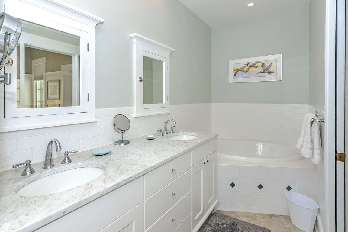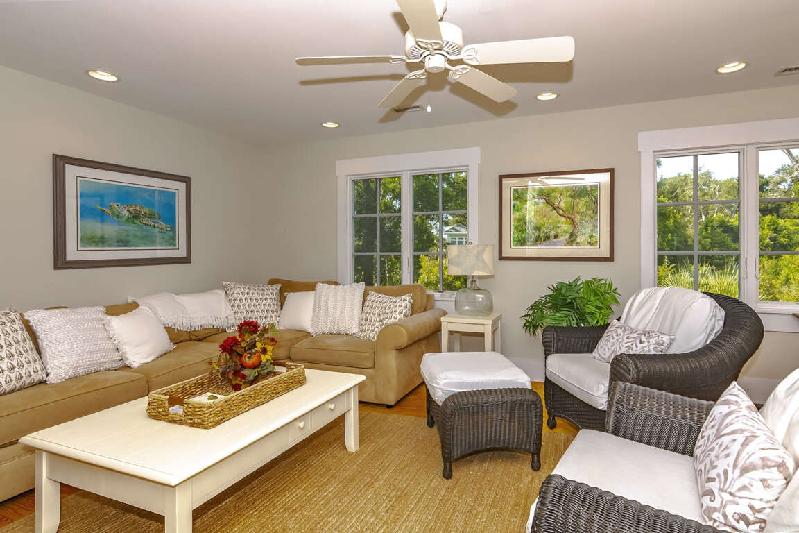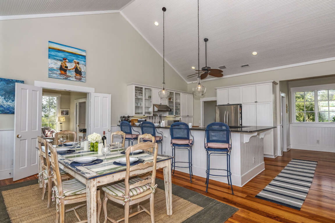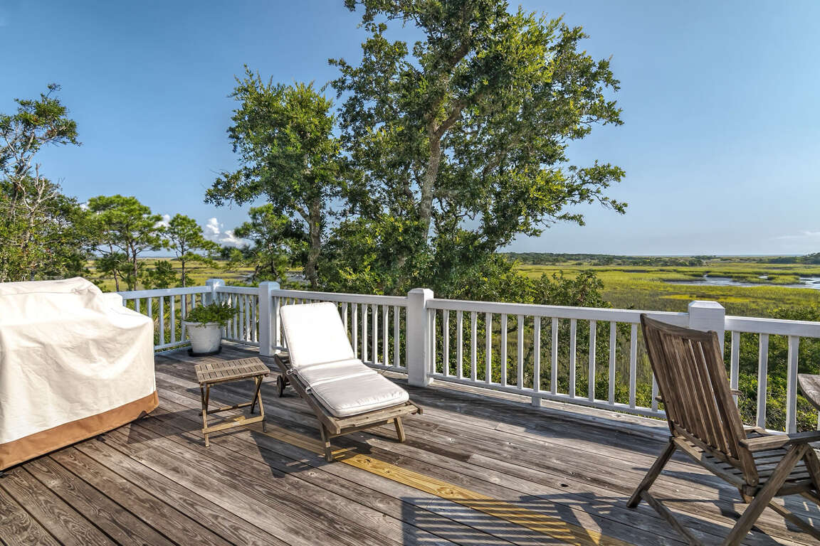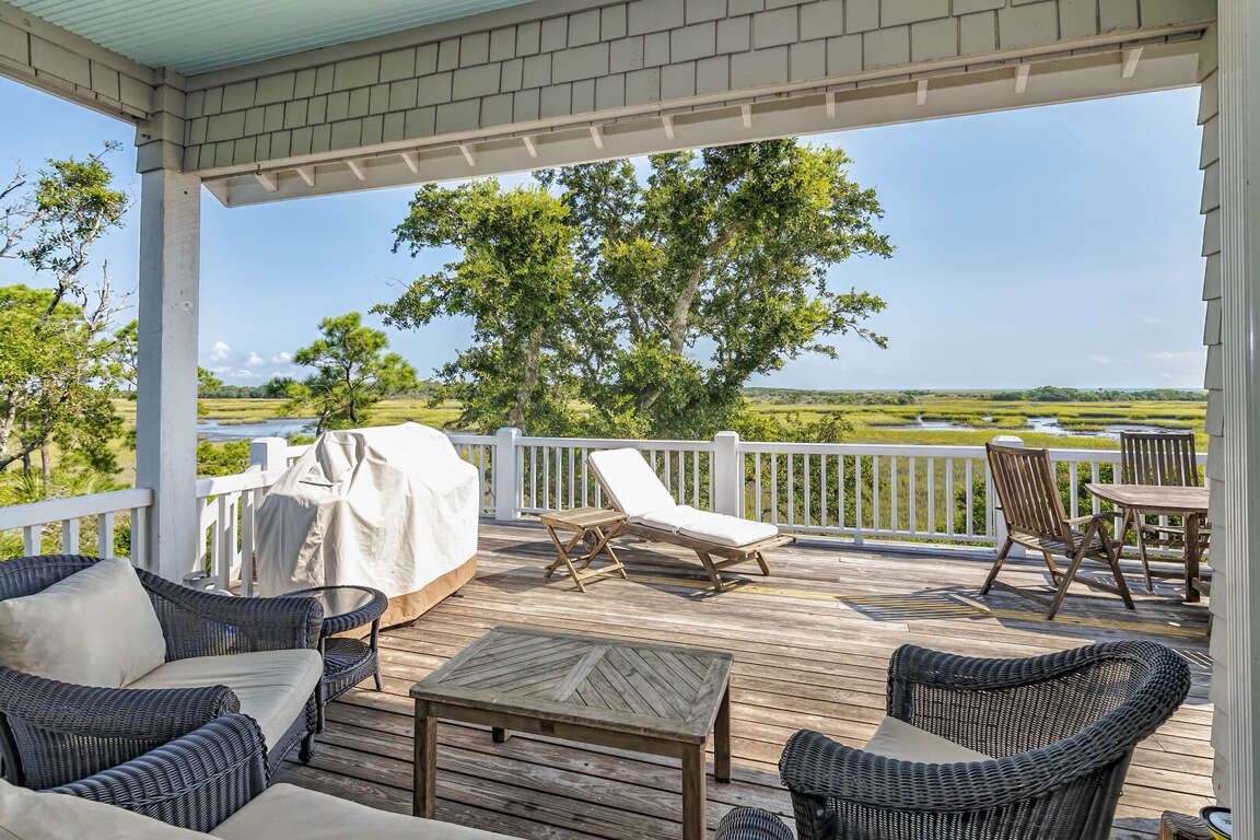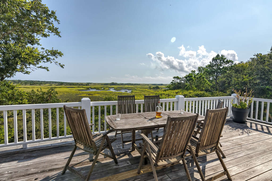 Upstairs reveals an oversize, natural light-filled, vaulted open floor plan backed by French doors and windows that grant "WOW factor" panoramas across Bald Head's estuary all the way to the Atlantic Ocean. The living space is anchored by a decorative marble fireplace, warmed by gracious hardwoods and surrounded by handsome wainscoting. The dining area, furnished with a table for ten and a convenient bar, is abutted by a granite breakfast bar proffering seating for four more. Eat here or just outside on the upper deck at either the dining table or on covered lounges and chairs while relishing salty breezes and marsh/seascapes. The chef's kitchen extends plenty of butcher block counter space and pleases with a walk-in pantry and Kitchen Aid and Viking stainless appliances. At each ends of this floor are two King Owner suites. The first pampers with a garden tub in its ensuite, a private sitting area and two closets. The second also features an ensuite as well as its own private access to the back deck. Equipped with three four-passenger golf carts, Barnard House will spoil you with the Bald Head vacation you've been dreaming of...and more!<br />