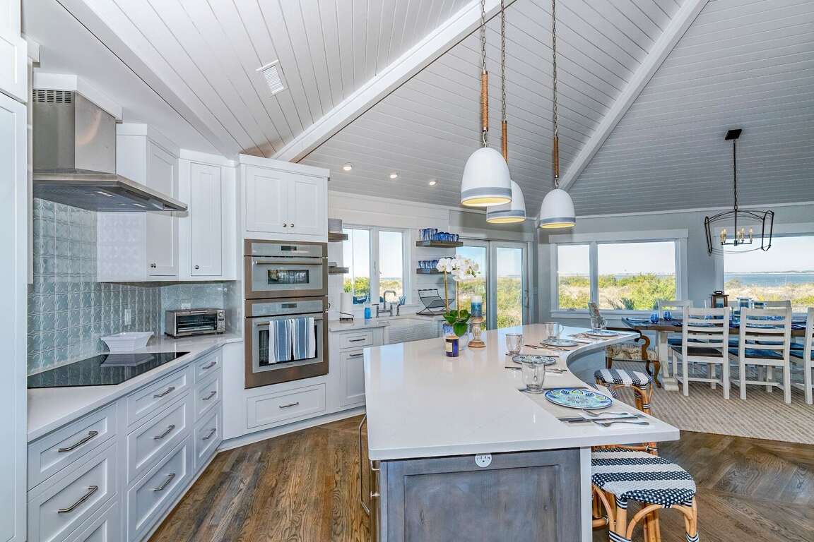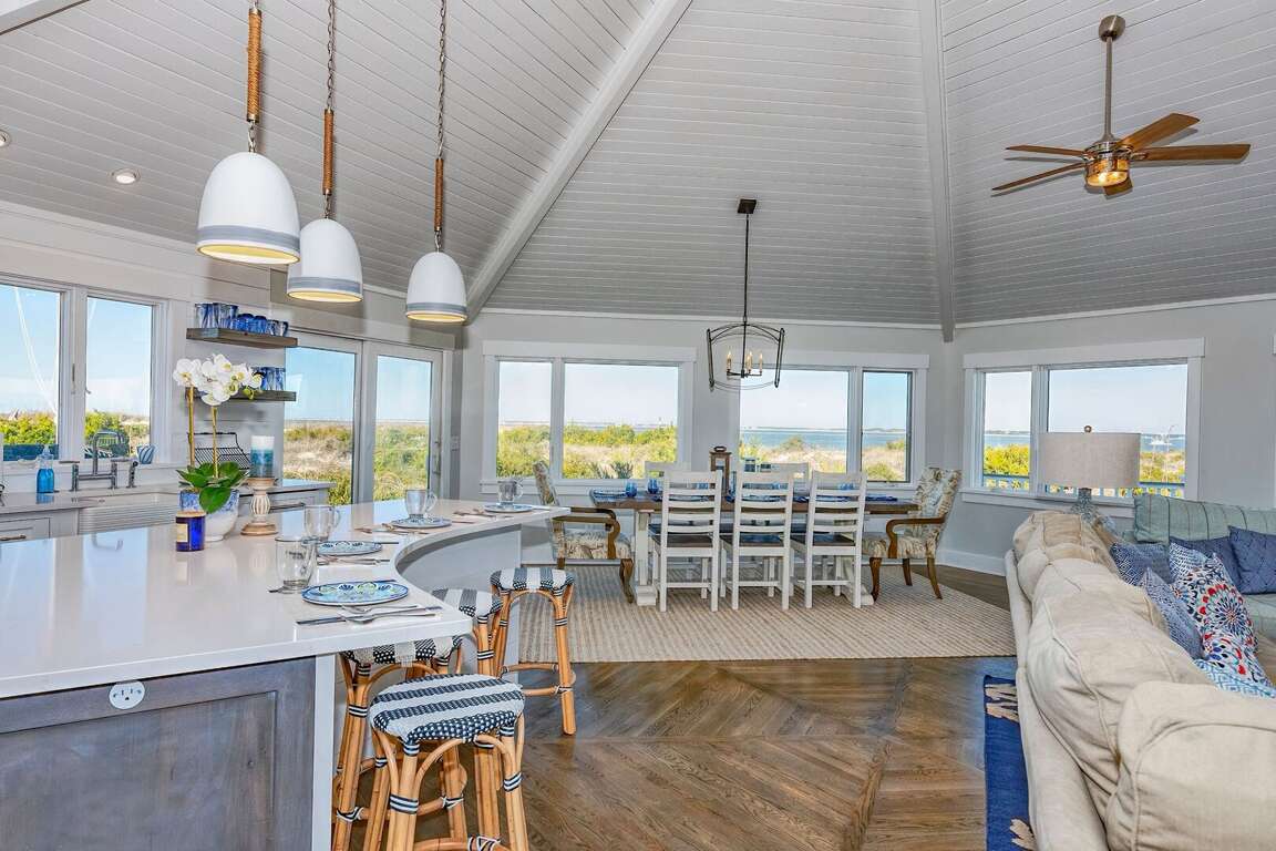 Tucked down a winding, shrubbed drive, Coast2Coast, is a four-bedroom, 4.5 bath waterfront Executive retreat on the Island's West Beach, boasts a large private pool, water panoramas extending from Sunny Point to past Bald Head Point, multiple outdoor living spaces, and a private beach access shared only with the home next door. As you enter the hexagonal open floor plan, you are awed by expansive water perspectives on three sides. The generous dining area is flanked by glass-allowing you to savor waterscapes with your meals. However, if alfresco is your fancy, step out onto the broad back deck and munch while reveling in breezes off the water. Nearby, the chef's kitchen also serves up gorgeous views and bestows plenty of quartz counter space, a farm sink, Thermador stainless appliances, and a breakfast bar accommodating four. The adjacent living area is anchored by an oversized sectional and offers plenty of seating for conversation, movie-watching, or game-playing.<br />