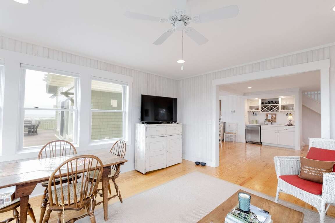 But your ocean views won’t end outside! Inside, the open floor plan grants breathtaking ocean tableaus from every sunbathed area. The spacious, light-filled living space also features comfy seating-perfect for relaxing and cozy conversations, a vaulted ceiling, multiple sliding doors to the waterfront deck, and a huge masonry fireplace. The cheery sunroom provides additional seating along with a game table and a flat-screen TV. The dining area flows from the sunroom, living space, and kitchen, and houses a handsome set that comfortably accommodates ten. Just beyond are three barstools at the breakfast bar. Savor bites at one of these locations indoors or dine alfresco at the set on the oceanfront porch! The sunlit, family-friendly kitchen features stainless appliances, granite counters, plenty of storage, and a separate wet bar. Three bedrooms are also located on this level. The oceanfront King Owners Suite offers a private dressing area, a spa-like en suite, a TV, and private access to the large deck. A second King suite also grants fantastic ocean prospects and private porch access, as well as its own TV and full en suite. An additional King bedroom proffers gorgeous ocean aspects and porch access, too, and uses the full bath located just across the hall.<br />