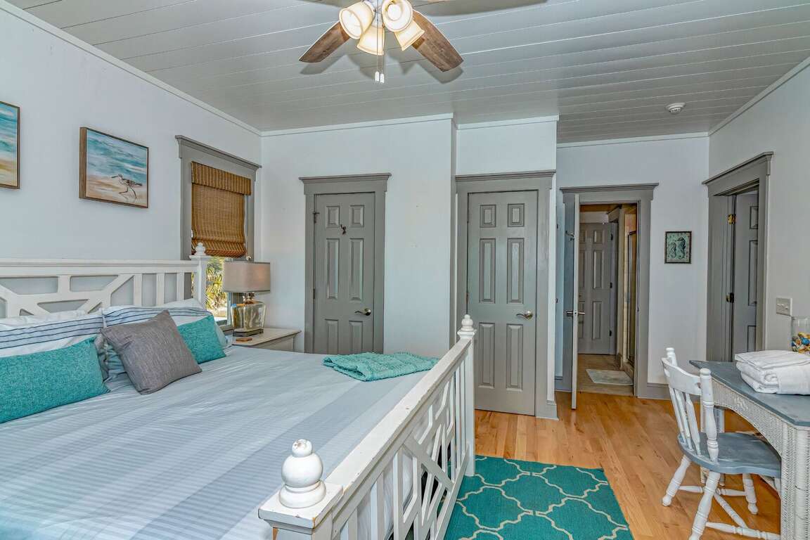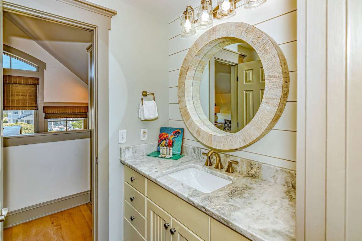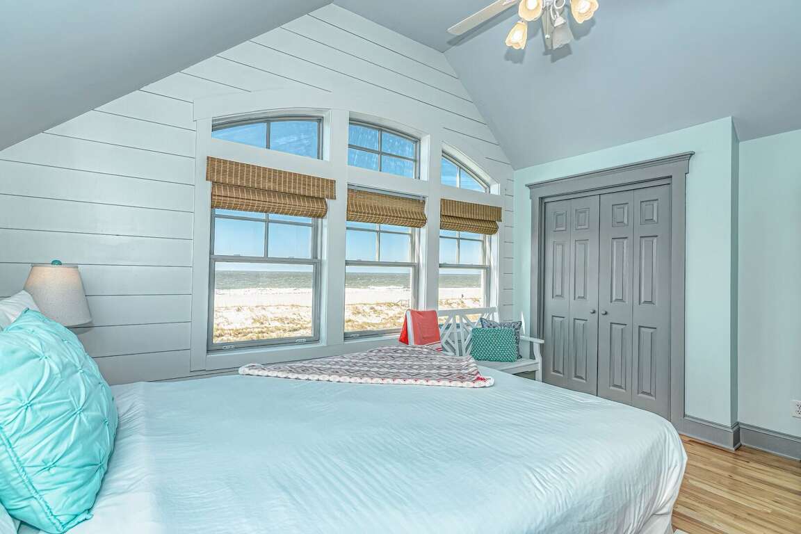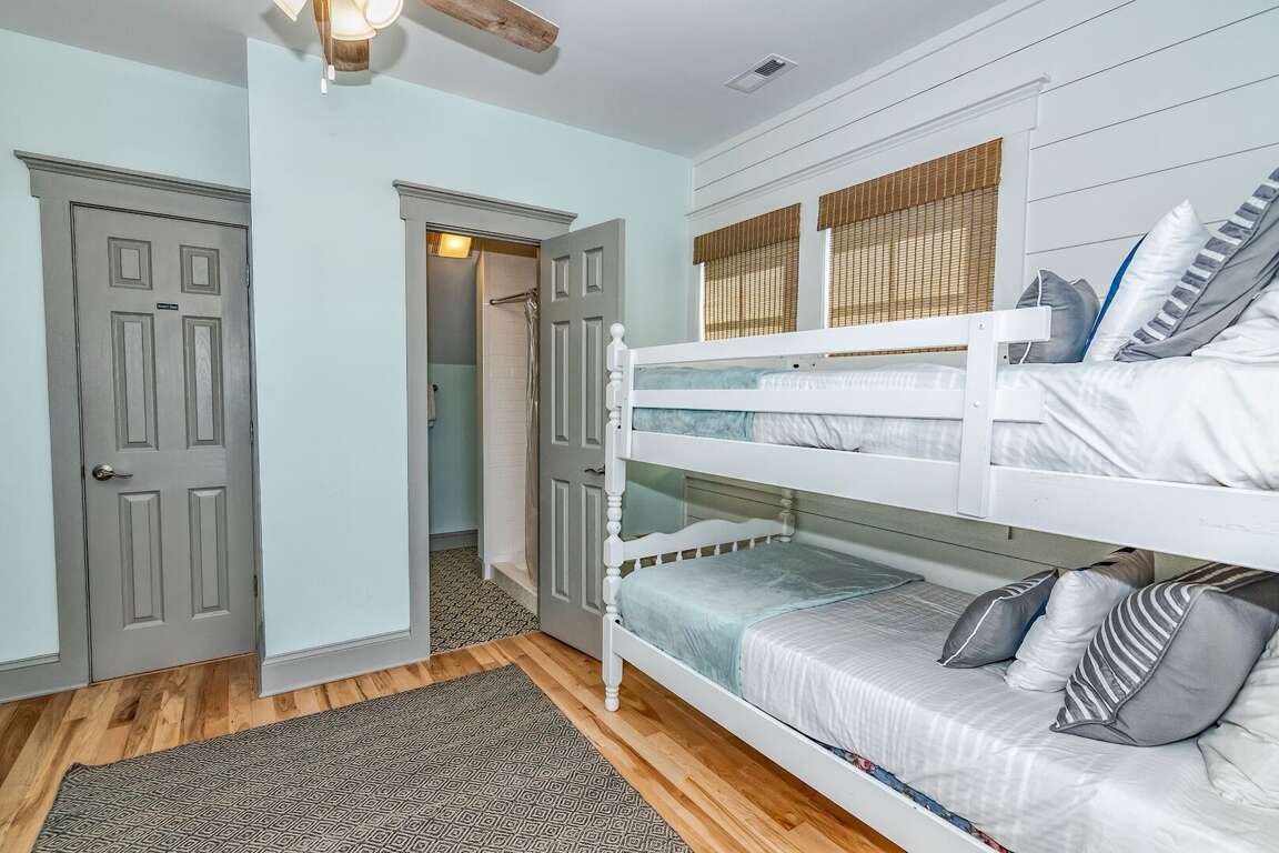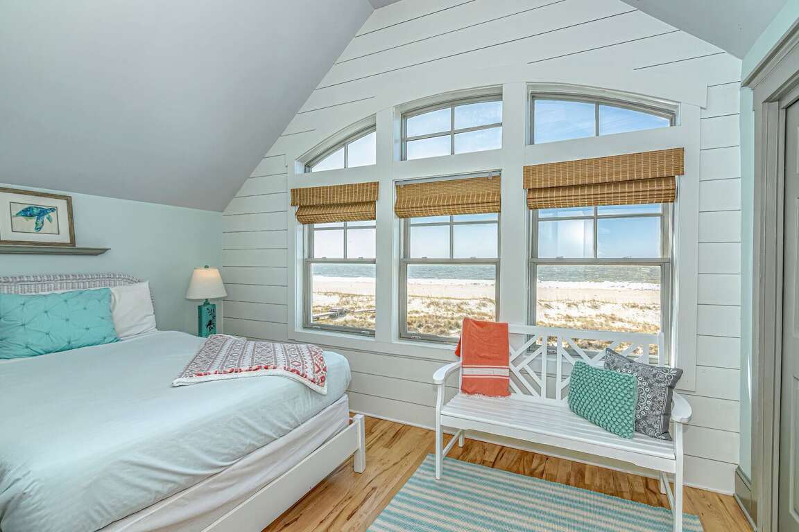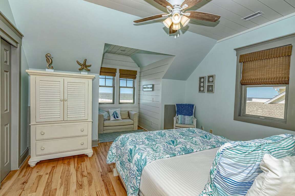 Upstairs, you're greeted by another bright gathering space with a cove ceiling. It's perfect for cozy conversations, late-night movie watching, quiet reading, or even a nap! This level is also home to three more suites. The first is a bunk room with twin bunks, a separate single, and a trundle. It offers water scenes, lots of built-ins, and its own private bath. The second is a sunny Queen suite, delighting with sparkling seascapes through its Palladian window, and provides a full bath which also has hall access. The third suite is very spacious and also offers a Queen with soothing ocean tableaus and a private full bath. All bedrooms are equipped with cooling ceiling fans.<br />