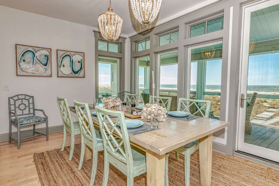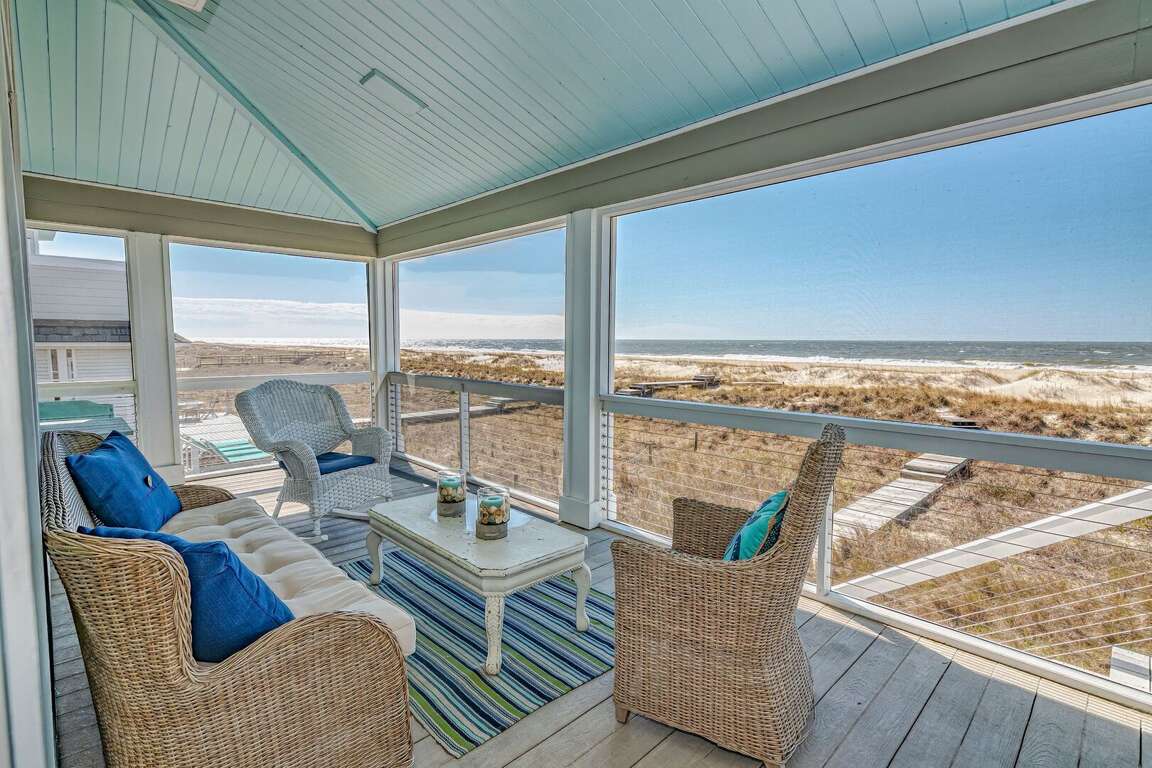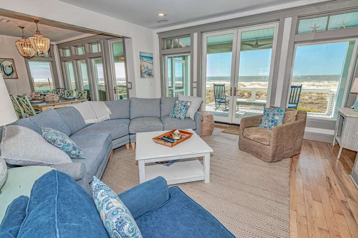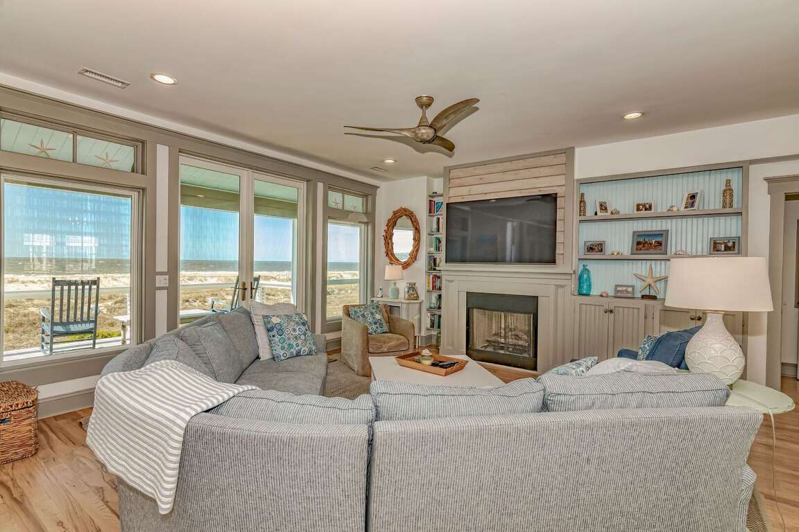From its shaded rocking-chair porch, you enter this beautiful retreat immediately drawn to its back wall of glass showcasing unobstructed panoramas of the Atlantic (sweeping all the way to Frying Pan Shoals). Inside, the open floor plan takes advantage of not only the scenery but also the warm, natural light. The comfortable living area is anchored by a decorative fireplace and offers games, books, and a large flat screen TV. Enjoy the views from here or step through to the covered beachfront back porch and linger while you relish the sunshine and watch the dolphins play. Step down to your private boardwalk and take the very short journey to the sand.<br />
