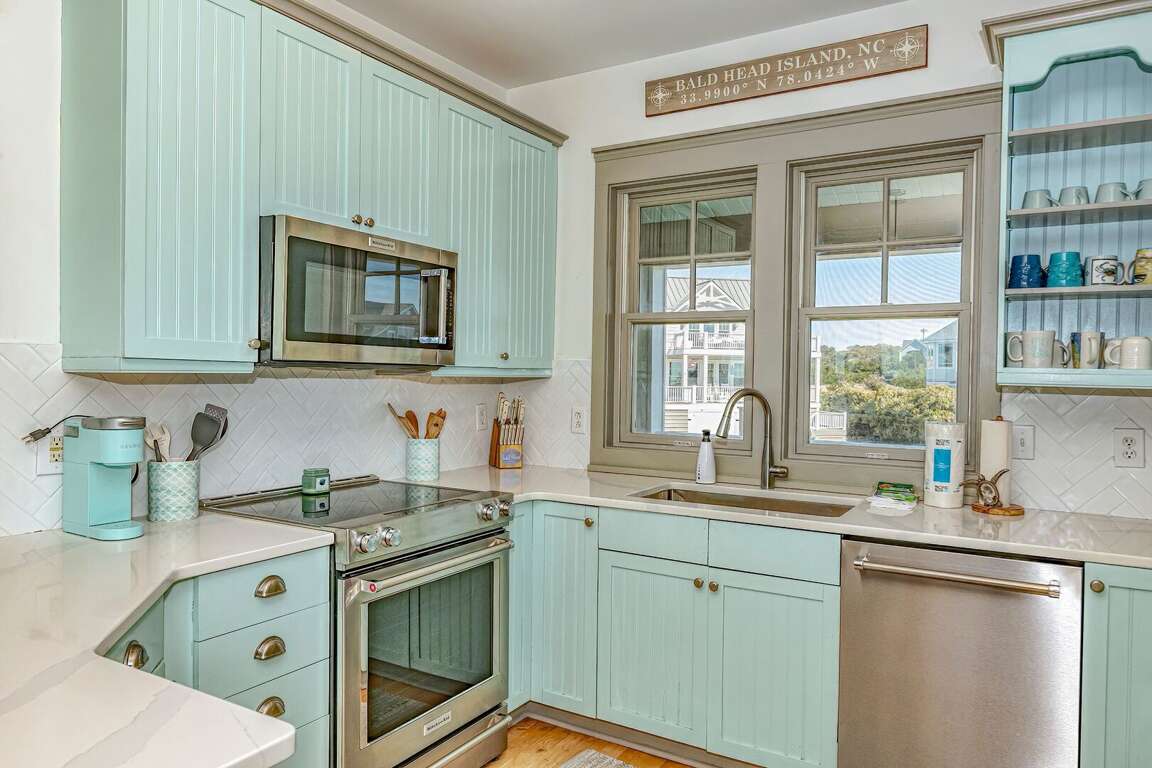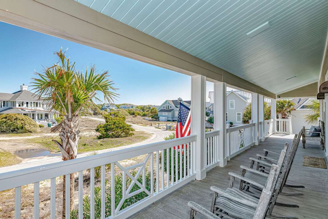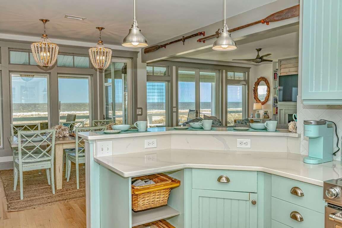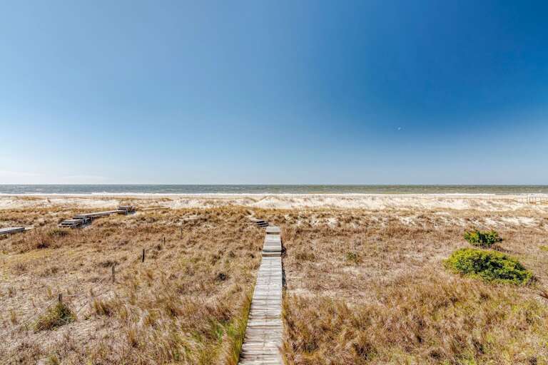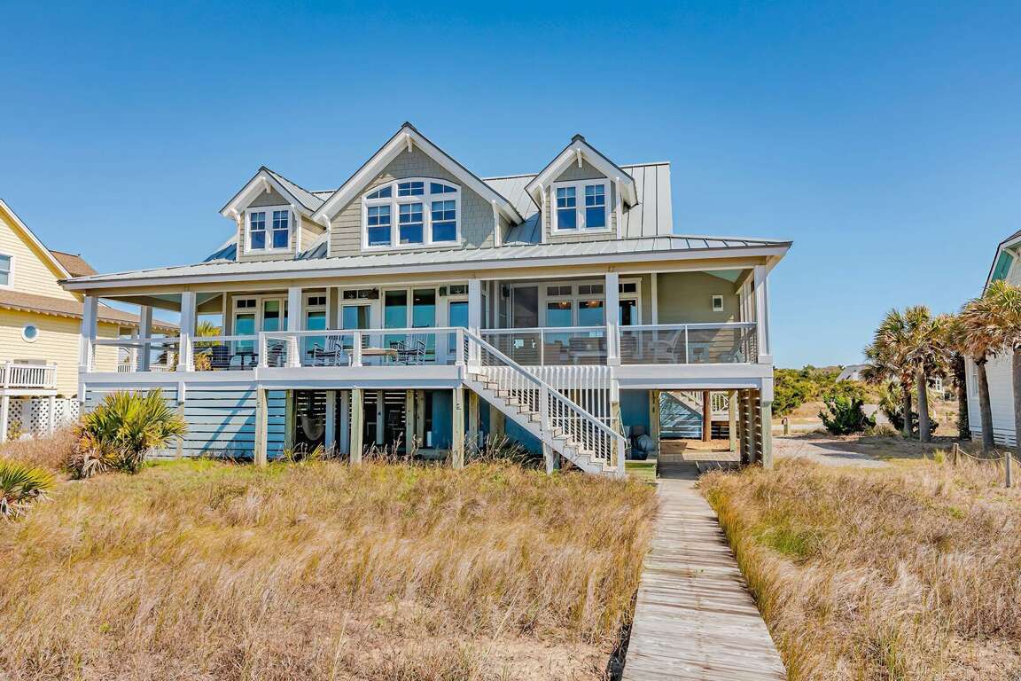 From its shaded rocking-chair porch, you enter this beautiful retreat immediately drawn to its back wall of glass showcasing unobstructed panoramas of the Atlantic (sweeping all the way to Frying Pan Shoals). Inside, the open floor plan takes advantage of not only the scenery but also the warm, natural light. The comfortable living area is anchored by a decorative fireplace and offers games, books, and a large flat screen TV. Enjoy the views from here or step through to the covered beachfront back porch and linger while you relish the sunshine and watch the dolphins play. Step down to your private boardwalk and take the very short journey to the sand.<br />