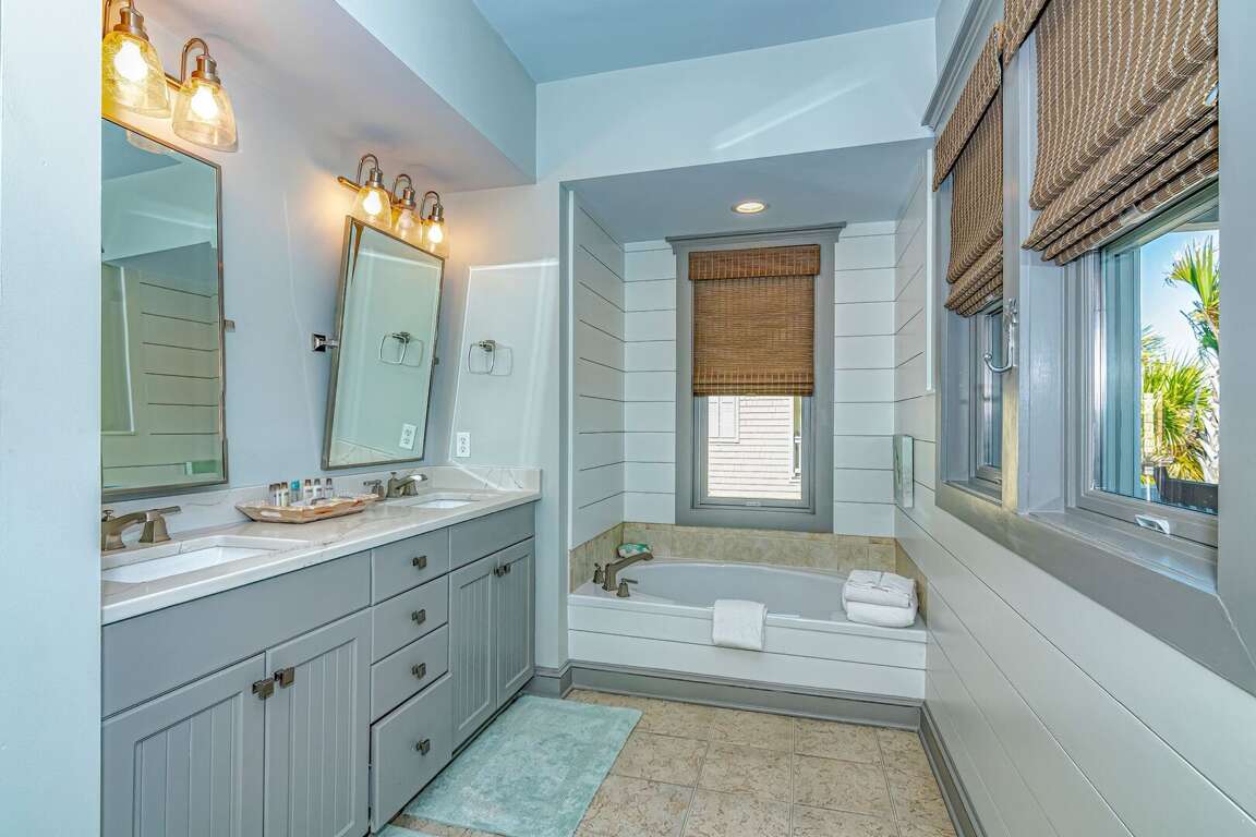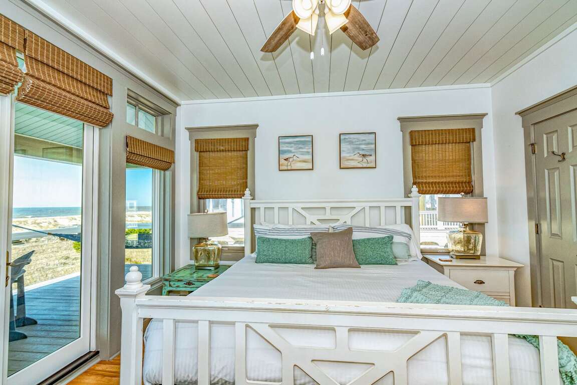 This floor also houses the generous King Master with its own beach perspectives, private access to the ocean porch, two closets, and a pampering bath with a large tiled shower, dual vanities, a water closet, and a sunken tub.<br />