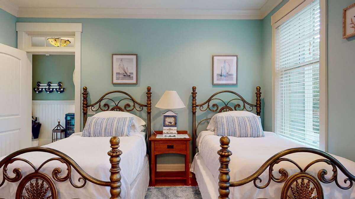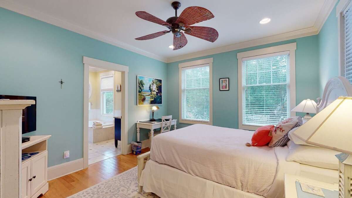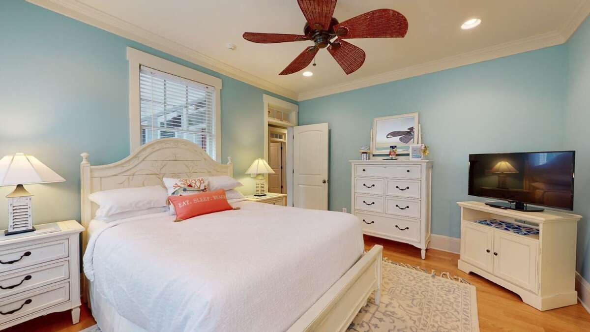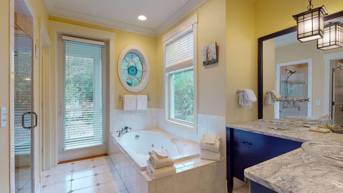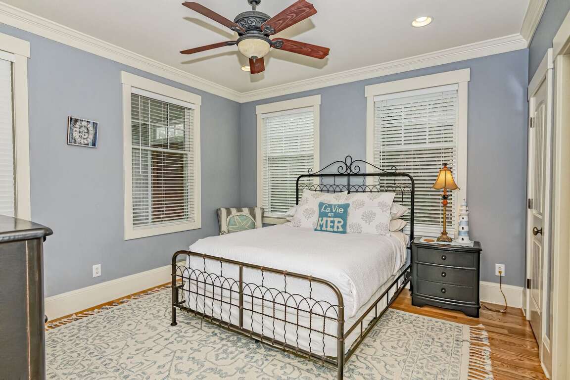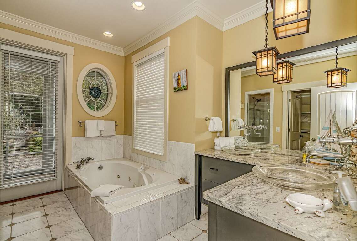 The deep front porch welcomes you to linger and listen to the sound of breaking waves. Inside, the foyer of this reverse-floorplan reveals some of its custom details-including hardwoods and wainscoting. To the right, a light-filled corner Queen suite with desk proffers a large ensuite bath with a walk-in closet, water closet, jetted tub, tiled shower, and double granite vanity. Next door, a sunny suite with two Twins grants forest vistas and its own full bath with a tub/shower. Across the hall, another bright corner Queen suite also provides a walk-in closet and an ensuite full bath with a tub/shower.<br />