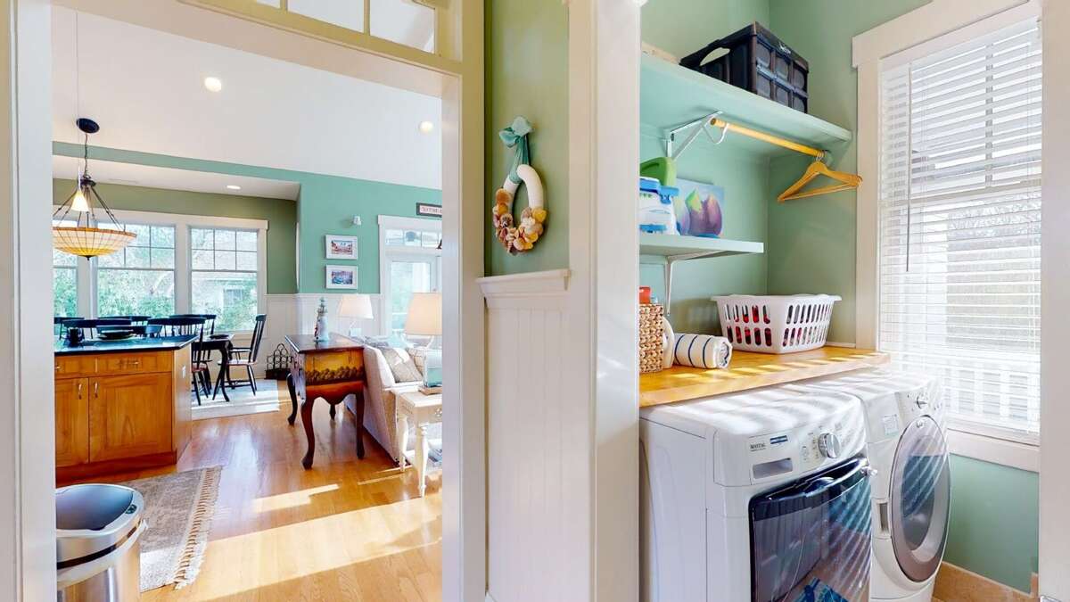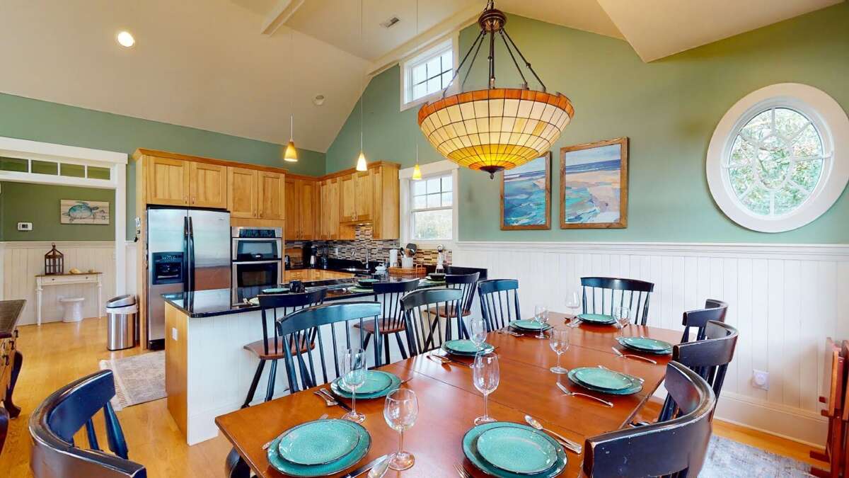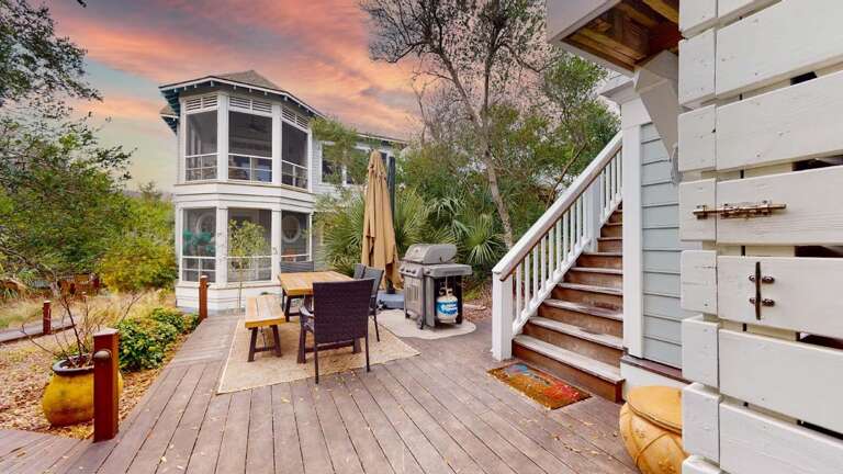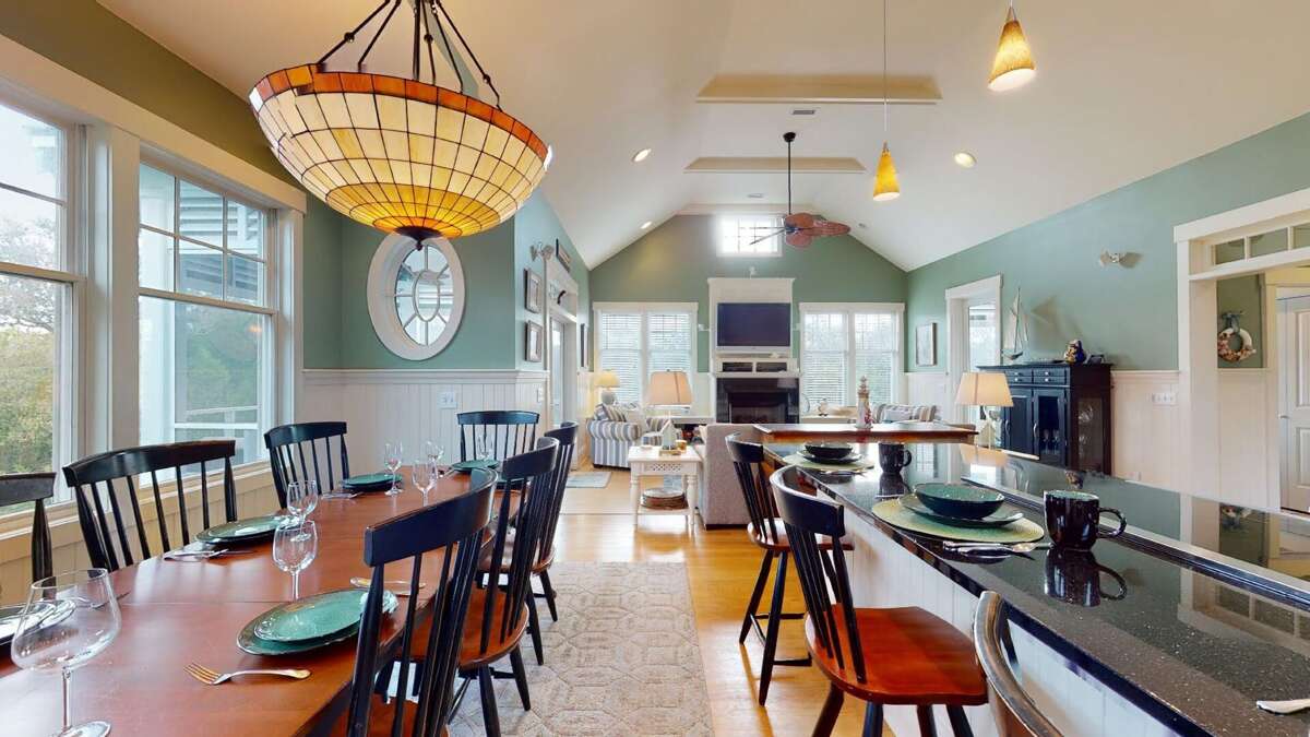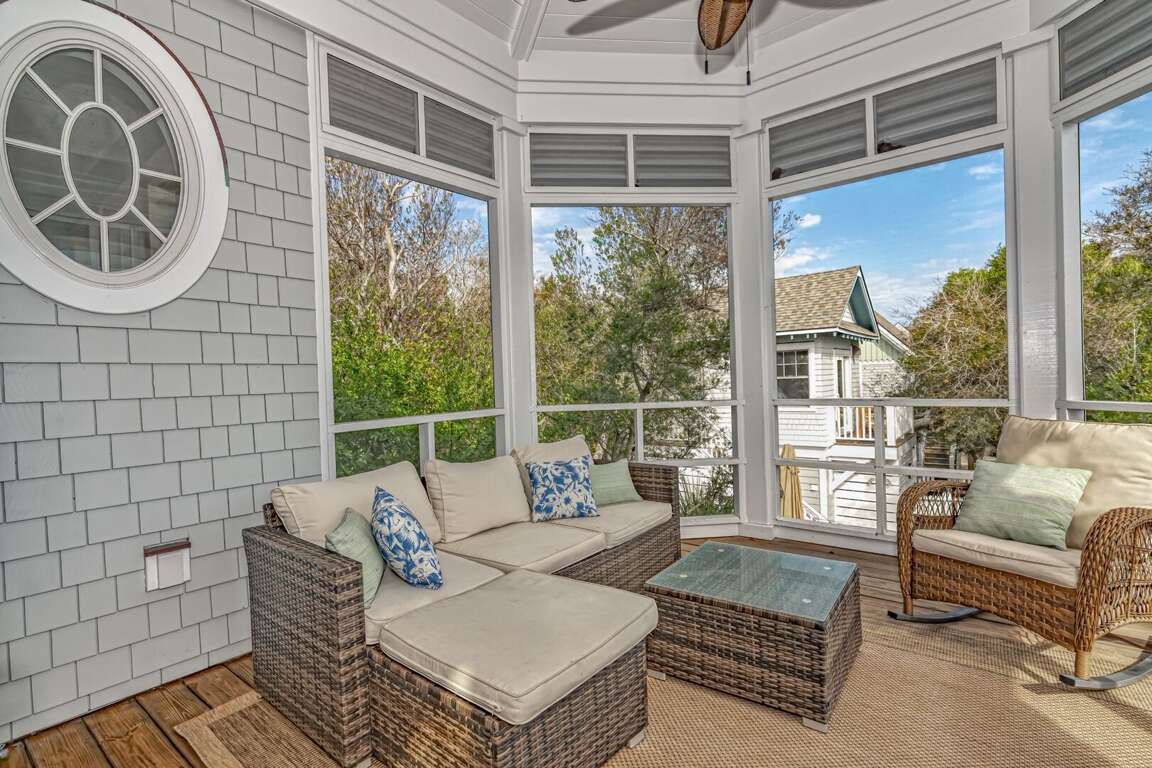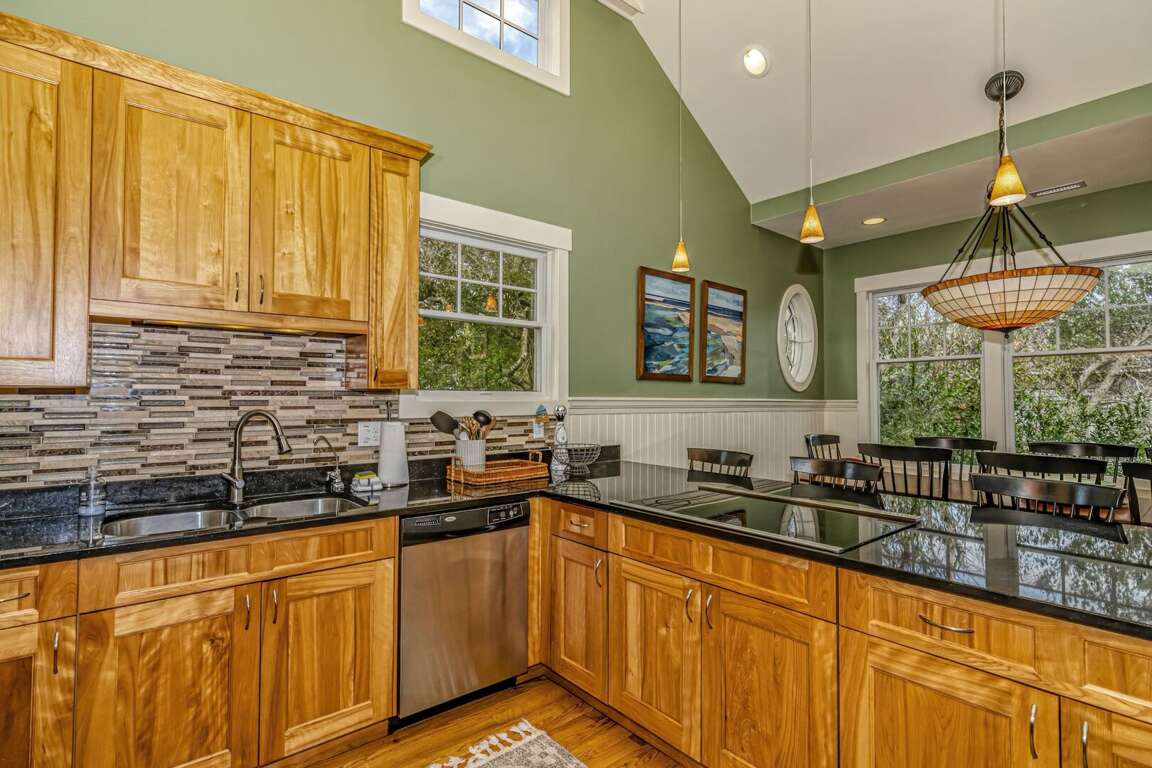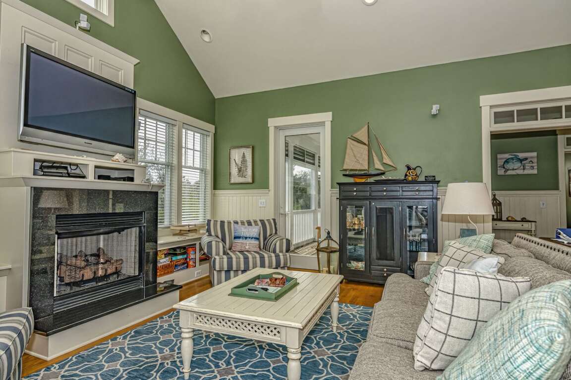 Upstairs, the Queen Primary suite boasts not only a walk-in California closet and ensuite with a tub/shower but also accesses one of the home's top-level screened porches - the ideal spot for a quiet read, enjoying briny breezes. Beyond this level's living space's open floor plan is crowned by a high, vaulted, beamed ceiling and soaked in natural light from its surrounding windows. The comfortable conversation area is anchored by a gas fireplace and tenders a nature scape on all sides, plus egress to both second-story screened porches. Nearby, the generous dining space is furnished with a stylish dining set. Savor meals and outdoor views from here or by dining alfresco on the home's dining deck-situated between the main house and the crofter. The chef's kitchen delights with stainless appliances, granite counters, a double sink, a breakfast bar, a designer backsplash, and attractive custom cabinets. This floor also houses the laundry.<br />