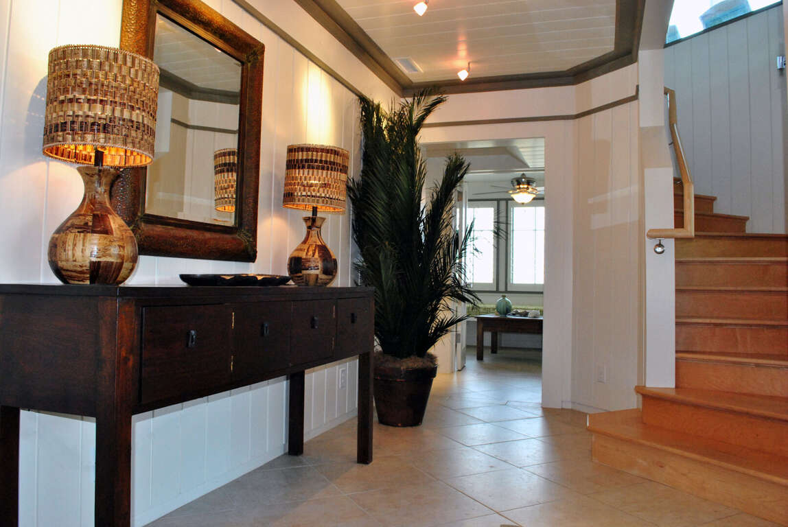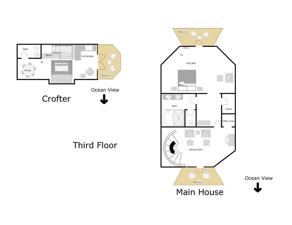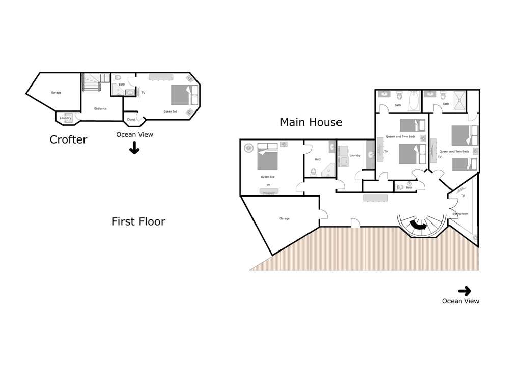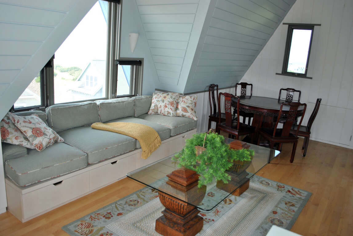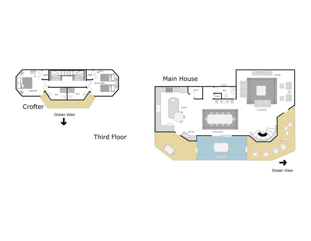 Down the boardwalk from the main house (just thirty yards) is the crofter guest house. This three-story haven is as big as some full-size houses! A large Queen suite with its own private bath encompasses the entire first floor. On the second level you'll find two more suites, each with their own private full baths. One of these features a Queen and the other holds two Twins. Both access a roomy balcony that overlooks South Beach. The crofter's third floor features a large living space that includes another comfortable sitting area with a flat-screen, a dining space with a table that seats six and a kitchenette with sink and mini-fridge. Adjacent to the kitchenette is a roomy balcony where you can enjoy views of the coastline while rocking to gentle breezes.<br />