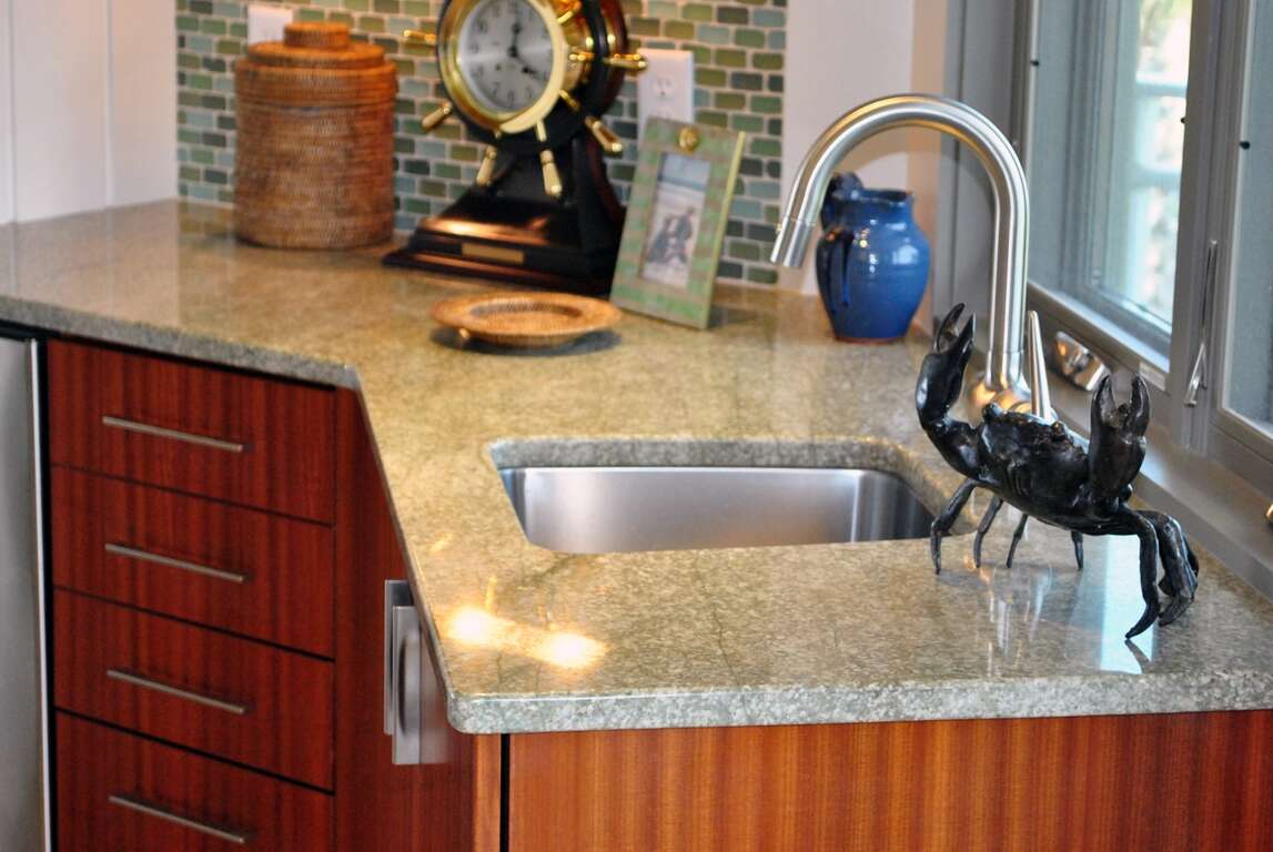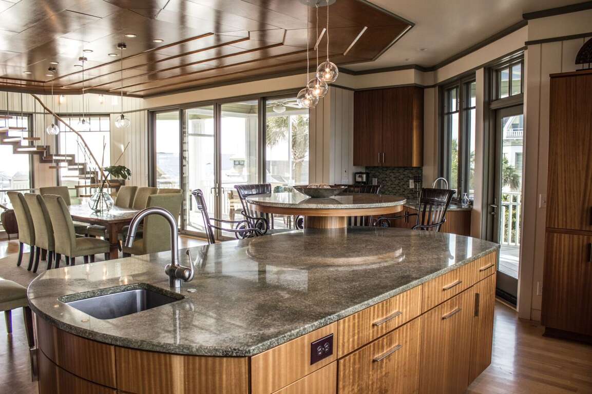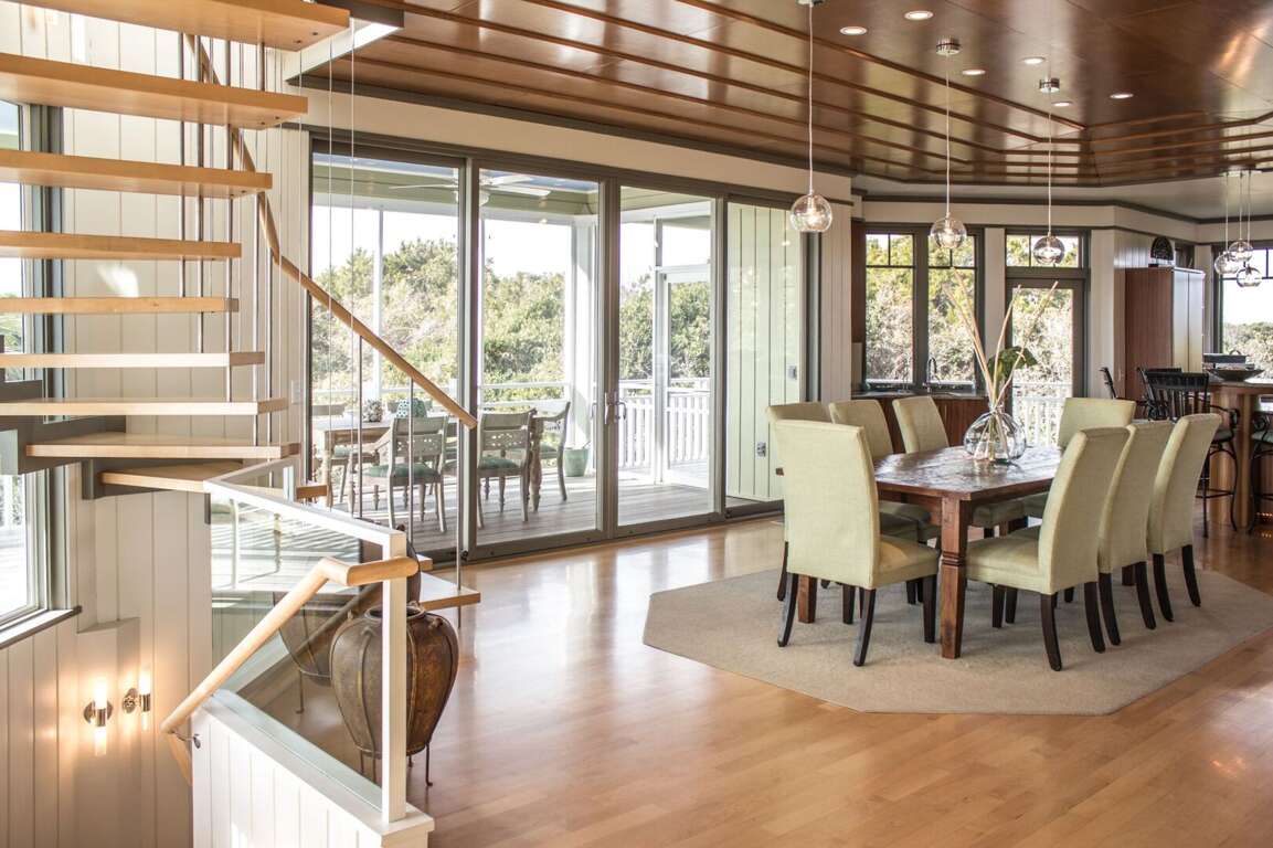 Up the stairs, to the main floor of this reverse floor-plan home, you'll find a vast living space featuring towering ceilings and breathtaking briny vistas through walls of windows. This bright, light-filled area features clean lines, contemporary furnishings and a decorative fireplace. Nearby, the open, luxe dining room easily seats eight with extra chairs to squeeze ten and also serves panoramic views of the beach. If you prefer alfresco dining, a table that seats six is on the adjacent screened porch just through sliding doors. For forest views, enjoy your food on yet another shaded deck. Inescapable View's kitchen features granite counters, a kitchen island with prep sink, stainless appliances and a breakfast bar that seats four-making this kitchen a chef's dream. There is also a wet bar to help you relax and rejuvenate.<br />