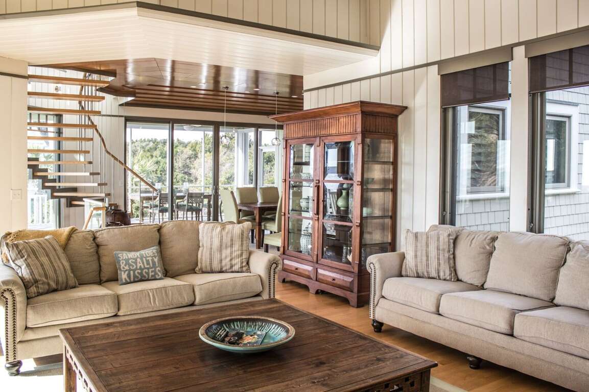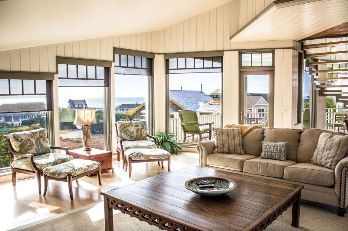 Floor-to-ceiling windows provide truly inescapable views of South Beach's coastline. On the other side of the house is an equally alluring view of the untouched Maritime Forest. On the first floor of the main house are three family-friendly suites, each with its own private bath. Two are furnished with a Queen bed and a Twin. The third, and largest, is a Queen that is set apart-offering a little more privacy. The first level also boasts a bright, comfortable sitting area with bench seating and a flat-screen television.<br />