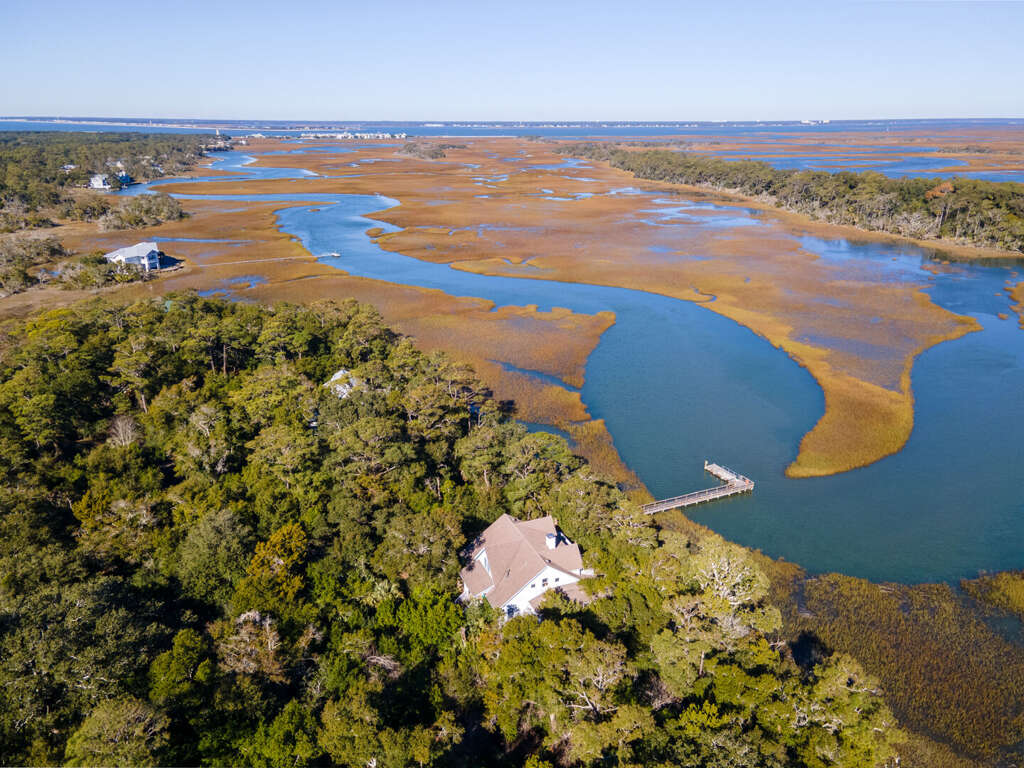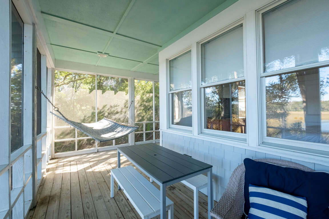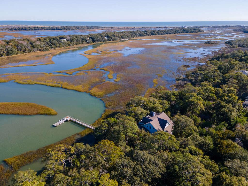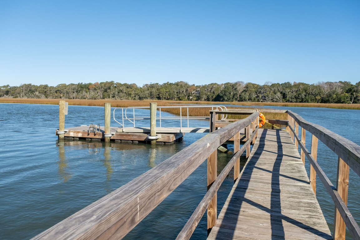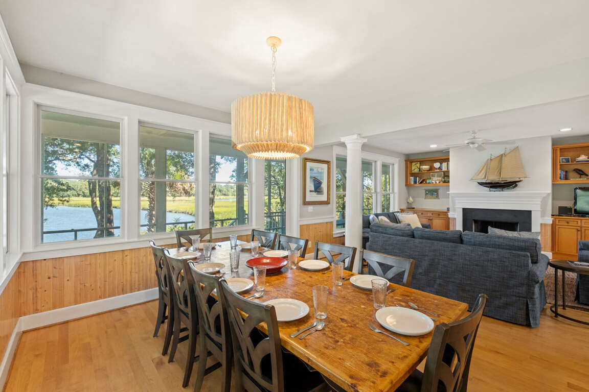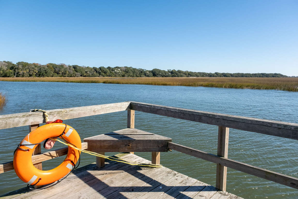 As you step inside the two-story foyer, you are greeted by warm hardwoods and drawn across the living area to the home's back wall of windows displaying the peaceful perspectives of the Island's estuary. These windows side this retreat's serene living space which features a fireplace, built-ins and egress to an oversize, water-facing wrap-around back screened porch. On the porch, you can relax on the hammock or in one of the three seating areas or enjoy a bite alfresco at one of the two dining tables-all while watching Nature's show of tides, egrets, and other wildlife. Steps down from here lead to this small community's private dock-making it easy to fish, crab, kayak or paddleboard. Back inside, this open floor plan's nearby dining space, cornered by windows, furnishes seating for nine with spots available for three more at the adjacent breakfast bar and offers another access to the screened porch. The generous kitchen provides a large prep island, plenty of storage and has the laundry conveniently close by. On the other side of this floor are two bedrooms. The first is a bright corner room with two Twins that uses the full bath, with tub, just outside its door. The sunlit corner Primary King suite charms with its wall of windows overlooking Bald Head Creek and has its own screened porch entree. It also boasts a large, spa-like ensuite with a garden tub, shower and dual vanity and an oversize closet.<br />