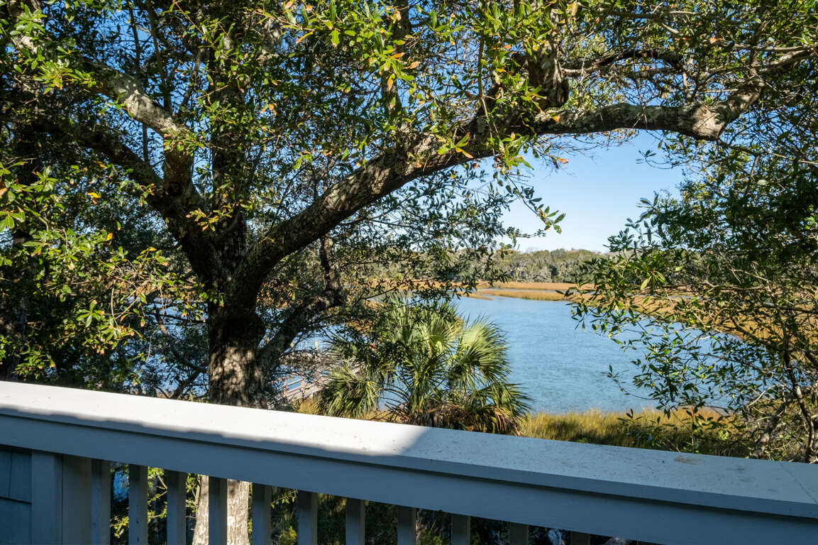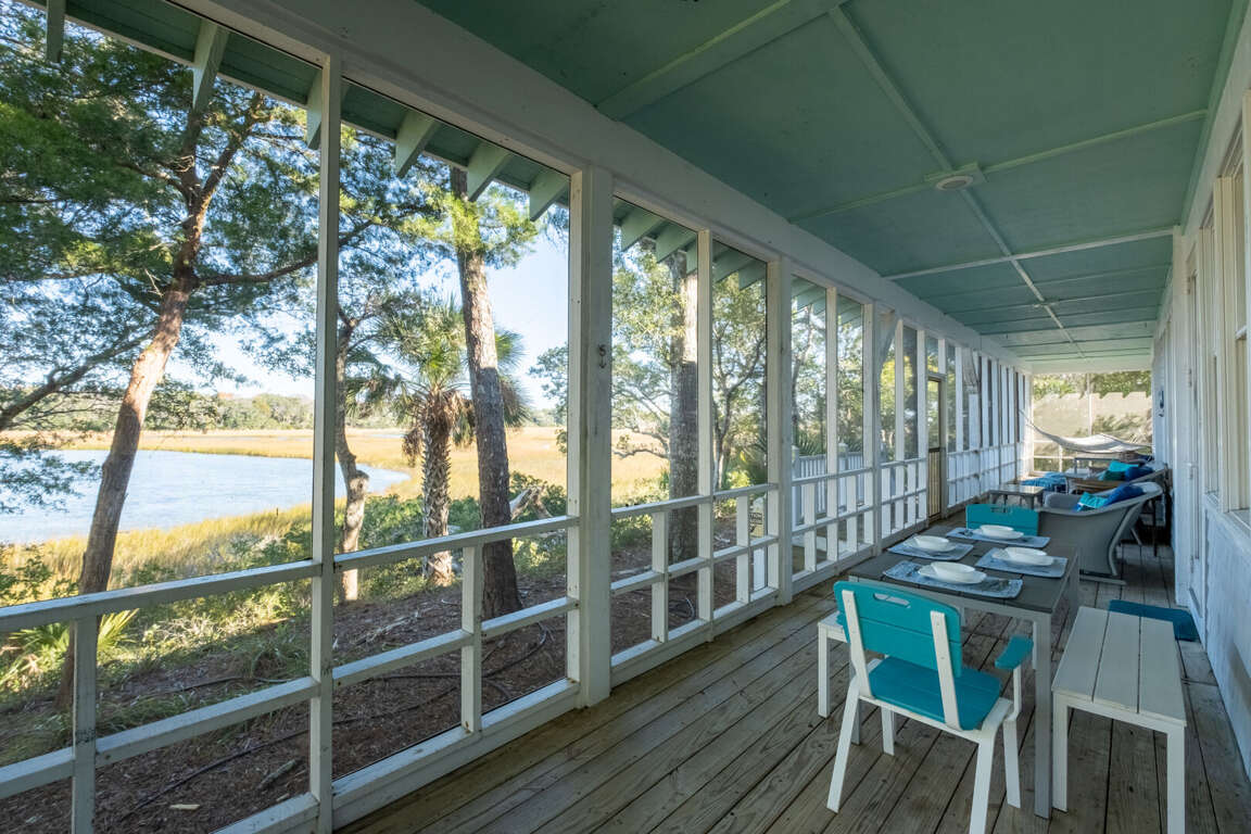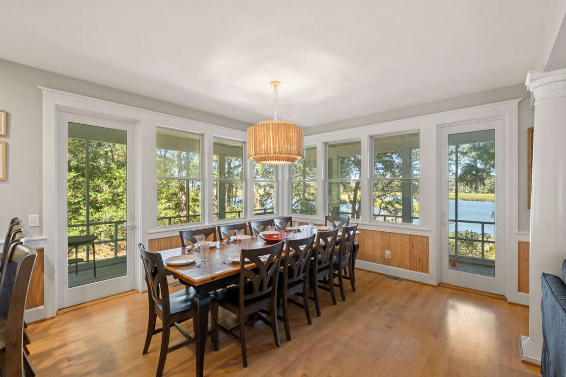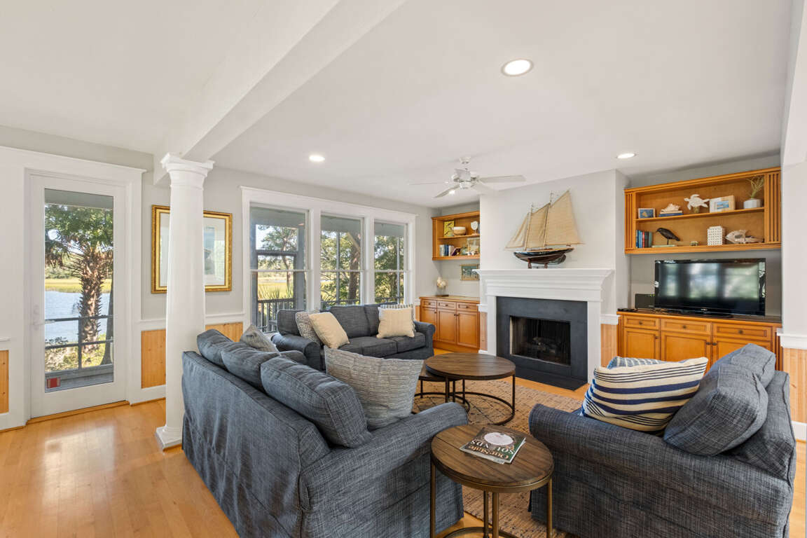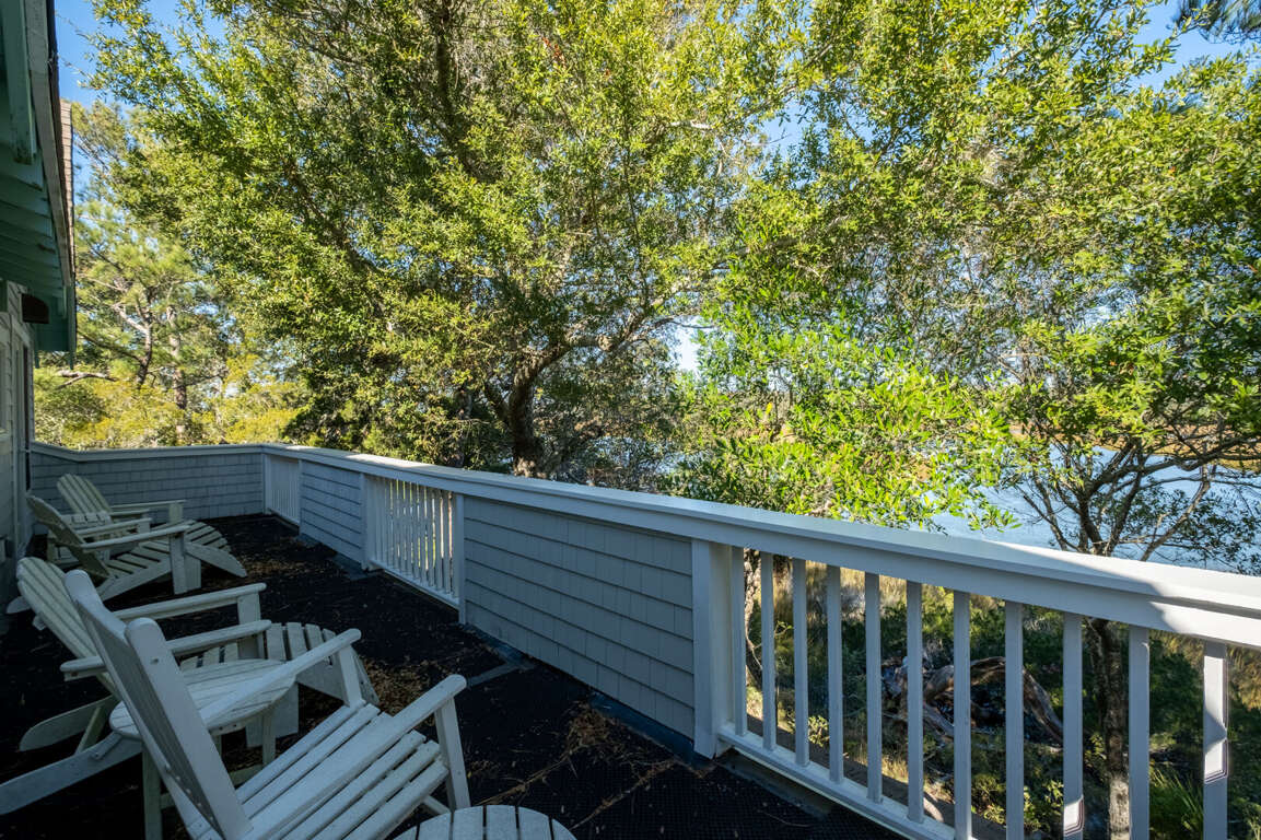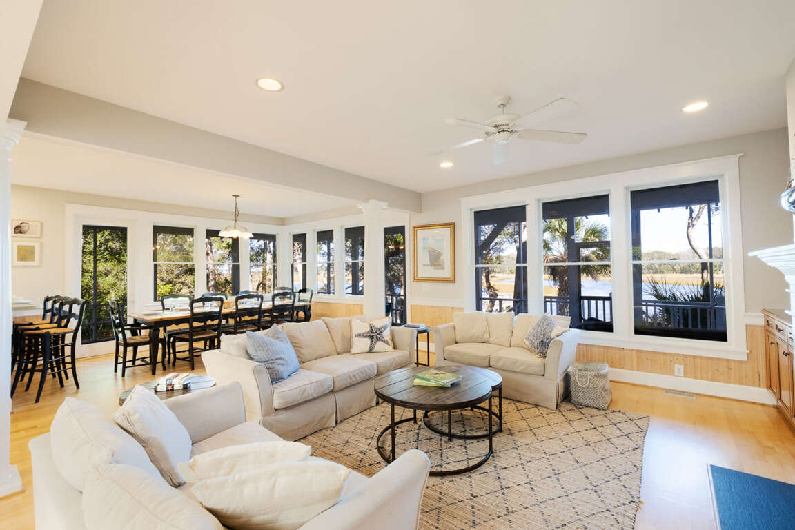 As you step inside the two-story foyer, you are greeted by warm hardwoods and drawn across the living area to the home's back wall of windows displaying the peaceful perspectives of the Island's estuary. These windows side this retreat's serene living space which features a fireplace, built-ins and egress to an oversize, water-facing wrap-around back screened porch. On the porch, you can relax on the hammock or in one of the three seating areas or enjoy a bite alfresco at one of the two dining tables-all while watching Nature's show of tides, egrets, and other wildlife. Steps down from here lead to this small community's private dock-making it easy to fish, crab, kayak or paddleboard. Back inside, this open floor plan's nearby dining space, cornered by windows, furnishes seating for nine with spots available for three more at the adjacent breakfast bar and offers another access to the screened porch. The generous kitchen provides a large prep island, plenty of storage and has the laundry conveniently close by. On the other side of this floor are two bedrooms. The first is a bright corner room with two Twins that uses the full bath, with tub, just outside its door. The sunlit corner Primary King suite charms with its wall of windows overlooking Bald Head Creek and has its own screened porch entree. It also boasts a large, spa-like ensuite with a garden tub, shower and dual vanity and an oversize closet.<br />