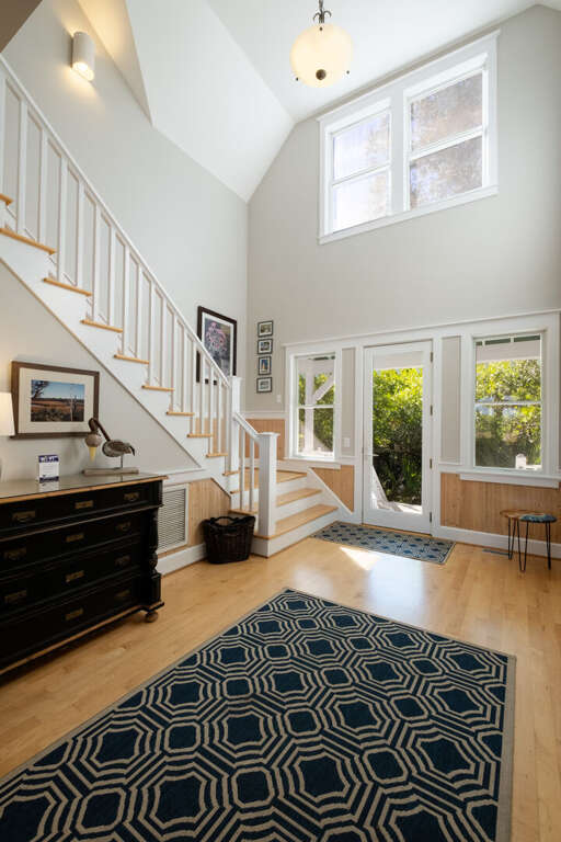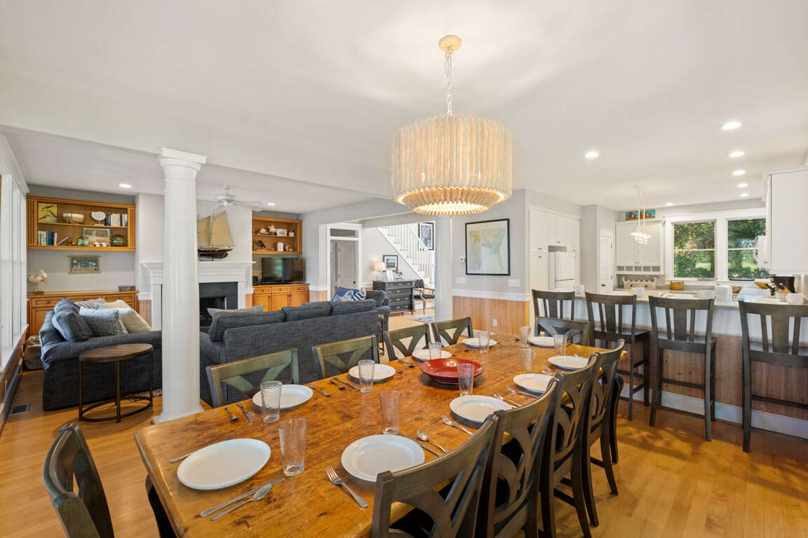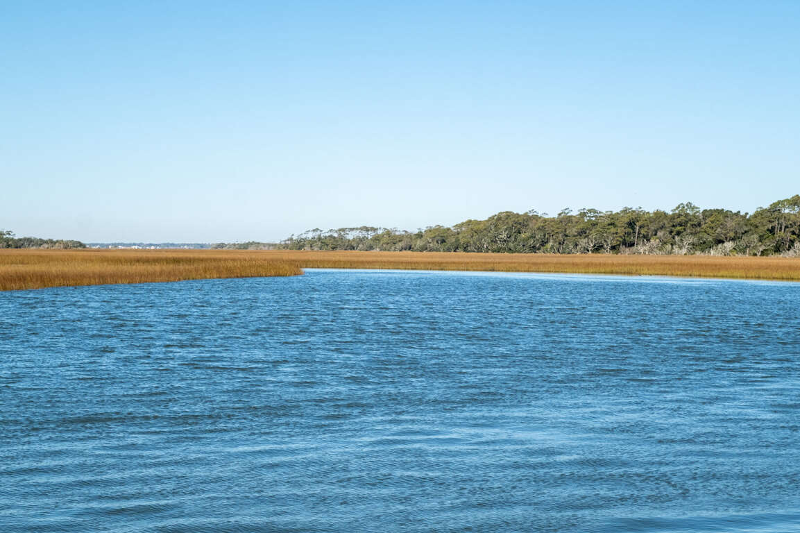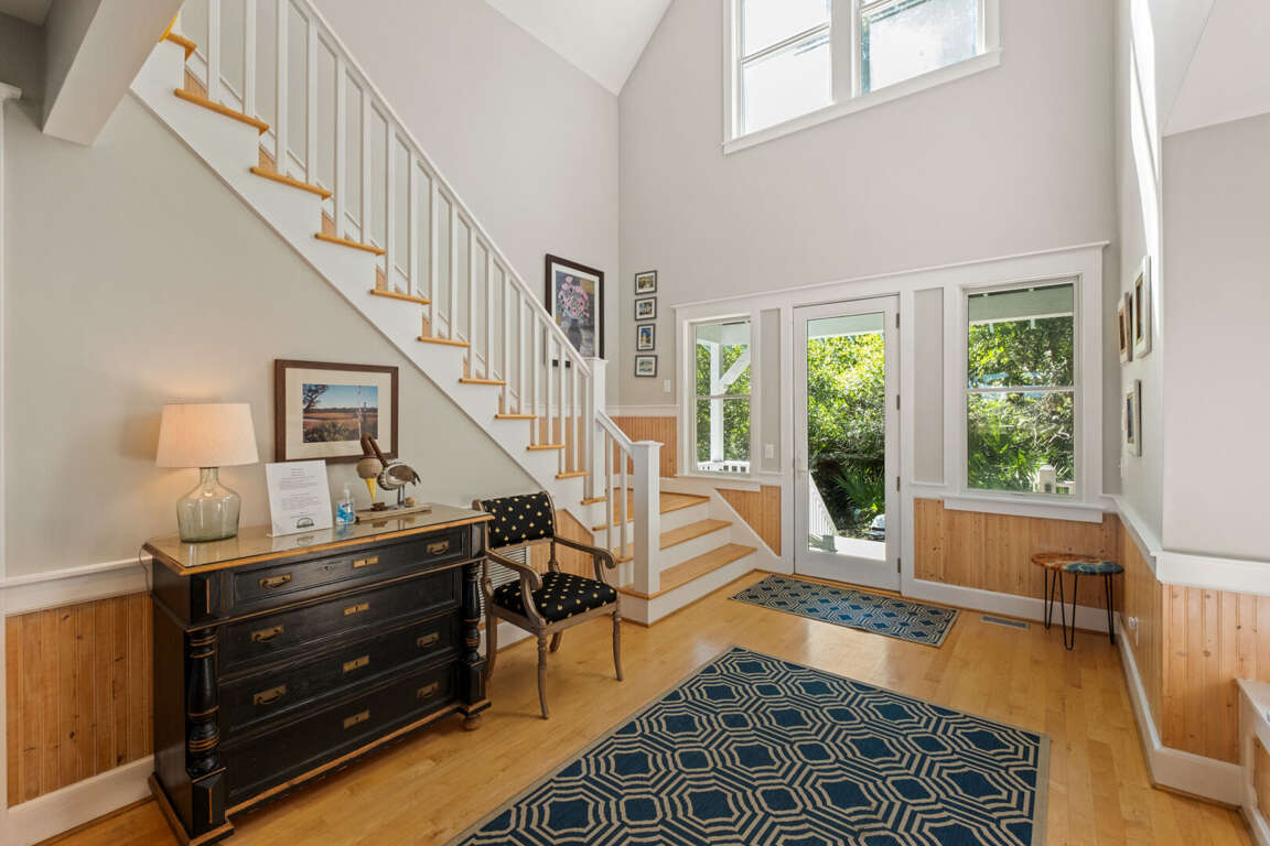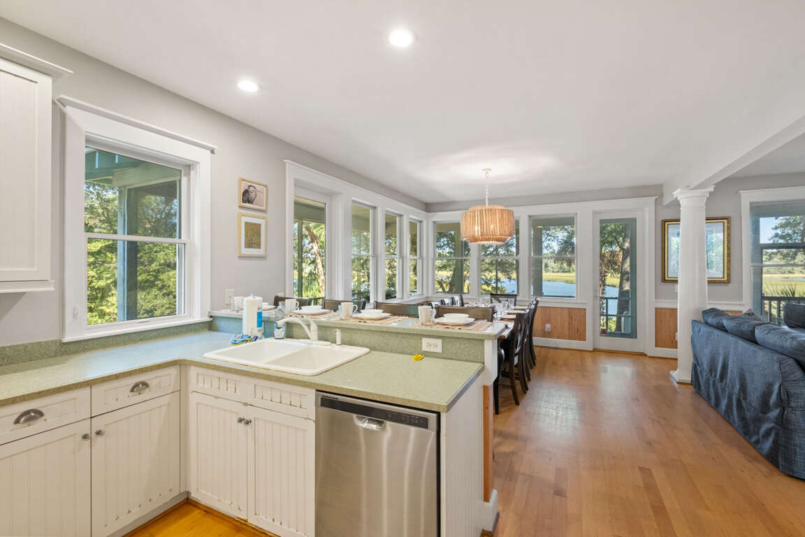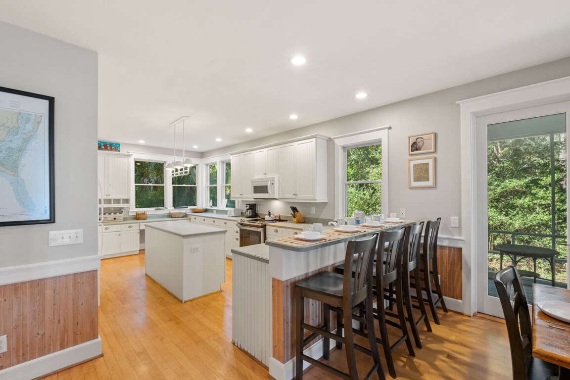 As you step inside the two-story foyer, you are greeted by warm hardwoods and drawn across the living area to the home's back wall of windows displaying the peaceful perspectives of the Island's estuary. These windows side this retreat's serene living space which features a fireplace, built-ins and egress to an oversize, water-facing wrap-around back screened porch. On the porch, you can relax on the hammock or in one of the three seating areas or enjoy a bite alfresco at one of the two dining tables-all while watching Nature's show of tides, egrets, and other wildlife. Steps down from here lead to this small community's private dock-making it easy to fish, crab, kayak or paddleboard. Back inside, this open floor plan's nearby dining space, cornered by windows, furnishes seating for nine with spots available for three more at the adjacent breakfast bar and offers another access to the screened porch. The generous kitchen provides a large prep island, plenty of storage and has the laundry conveniently close by. On the other side of this floor are two bedrooms. The first is a bright corner room with two Twins that uses the full bath, with tub, just outside its door. The sunlit corner Primary King suite charms with its wall of windows overlooking Bald Head Creek and has its own screened porch entree. It also boasts a large, spa-like ensuite with a garden tub, shower and dual vanity and an oversize closet.<br />