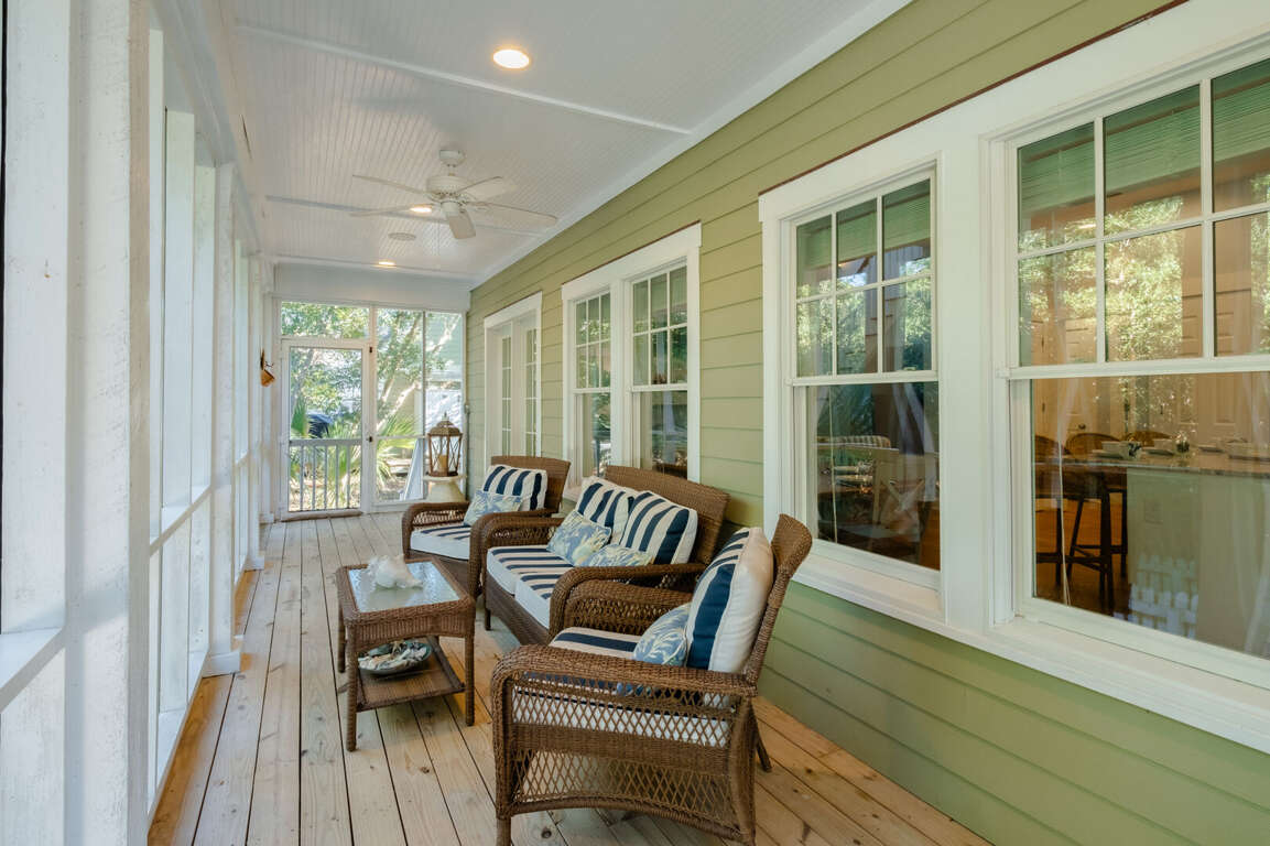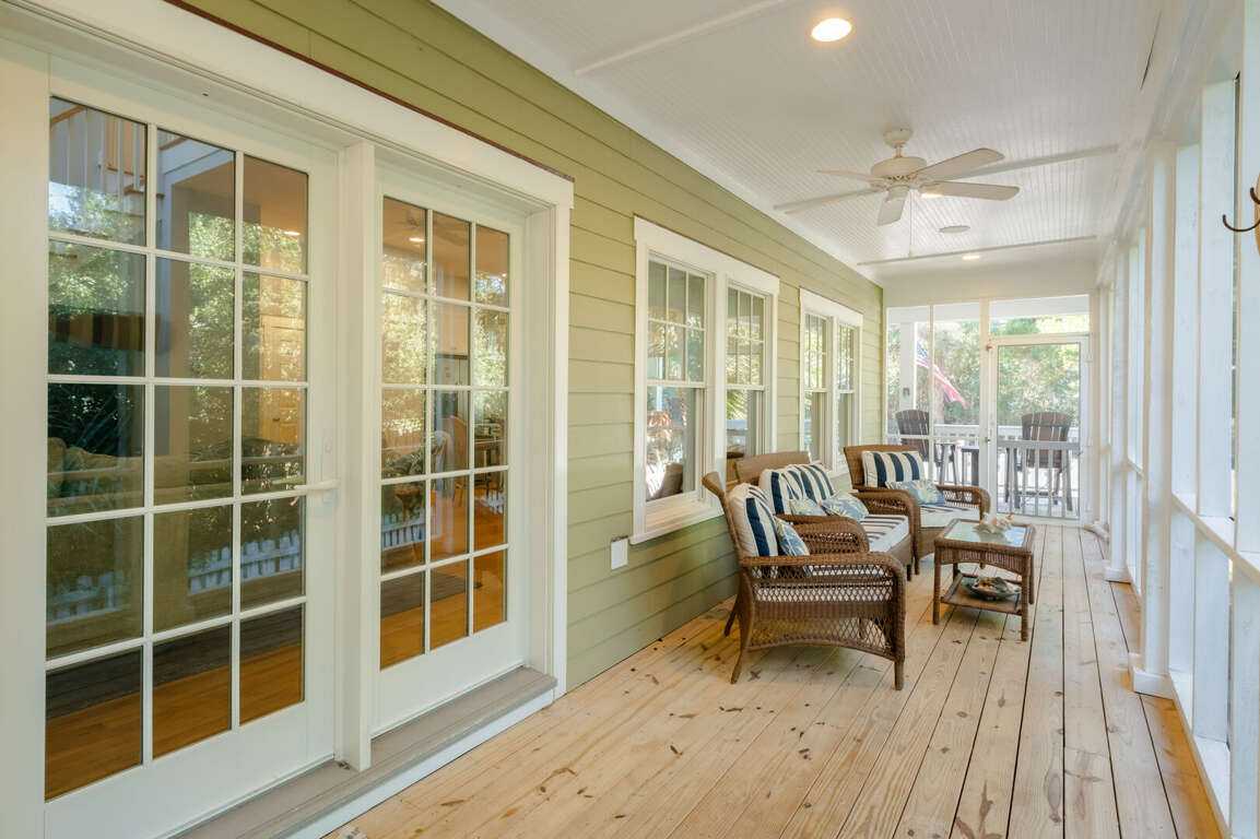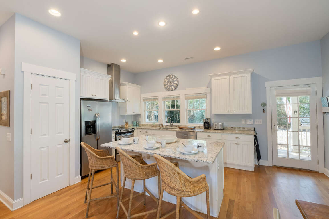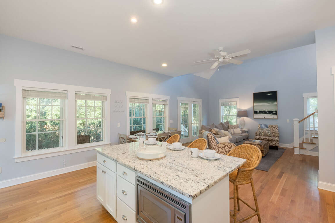 Inside, step onto warm hardwoods in the well-appointed kitchen of this cozy, open floor plan. You'll appreciate the gleaming granite counters, large prep island with breakfast bar, stainless appliances, and spacious pantry. The nearby dining set is sided by a wall of natural light-sharing windows. Enjoy nibbles here or through the French doors to the house-length screen porch where you can commune with the Island's abundant nature while savoring bites or your first cup of joe. Back inside, the living space is brightened by its two stories of windows. It's a great spot to share family games, movies, conversation and snuggles.<br />