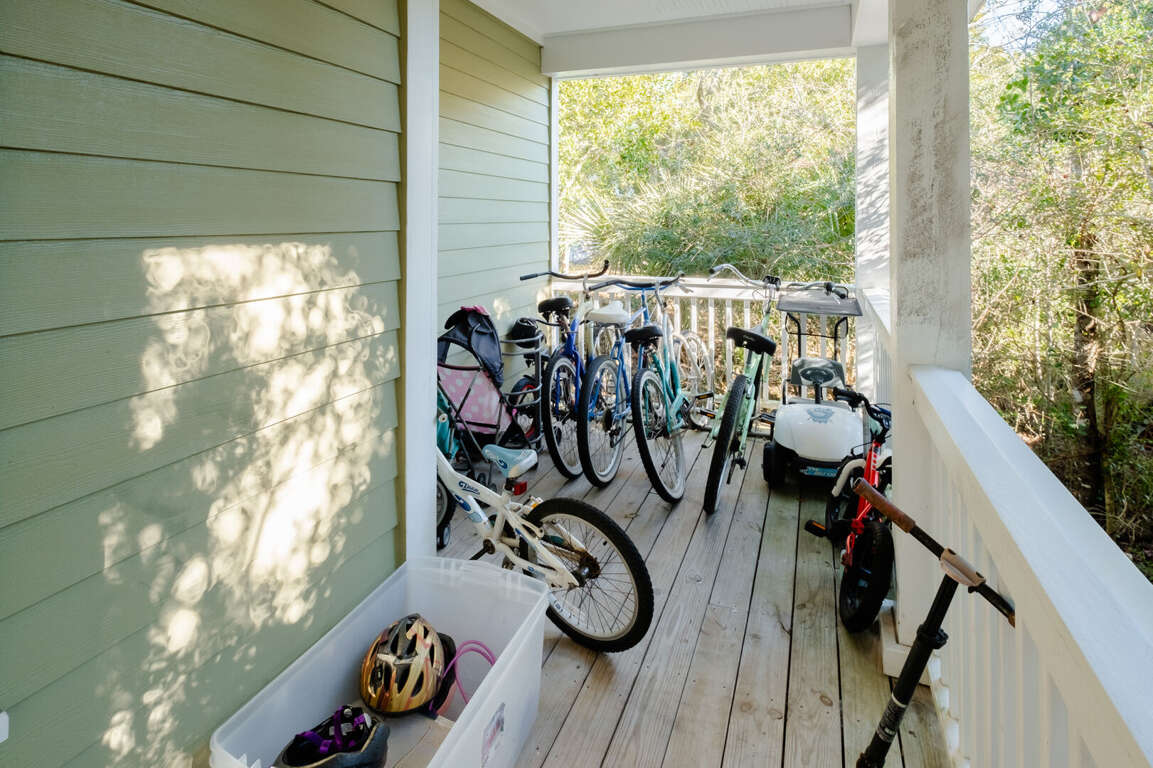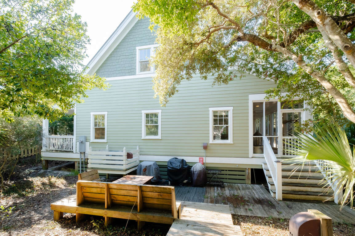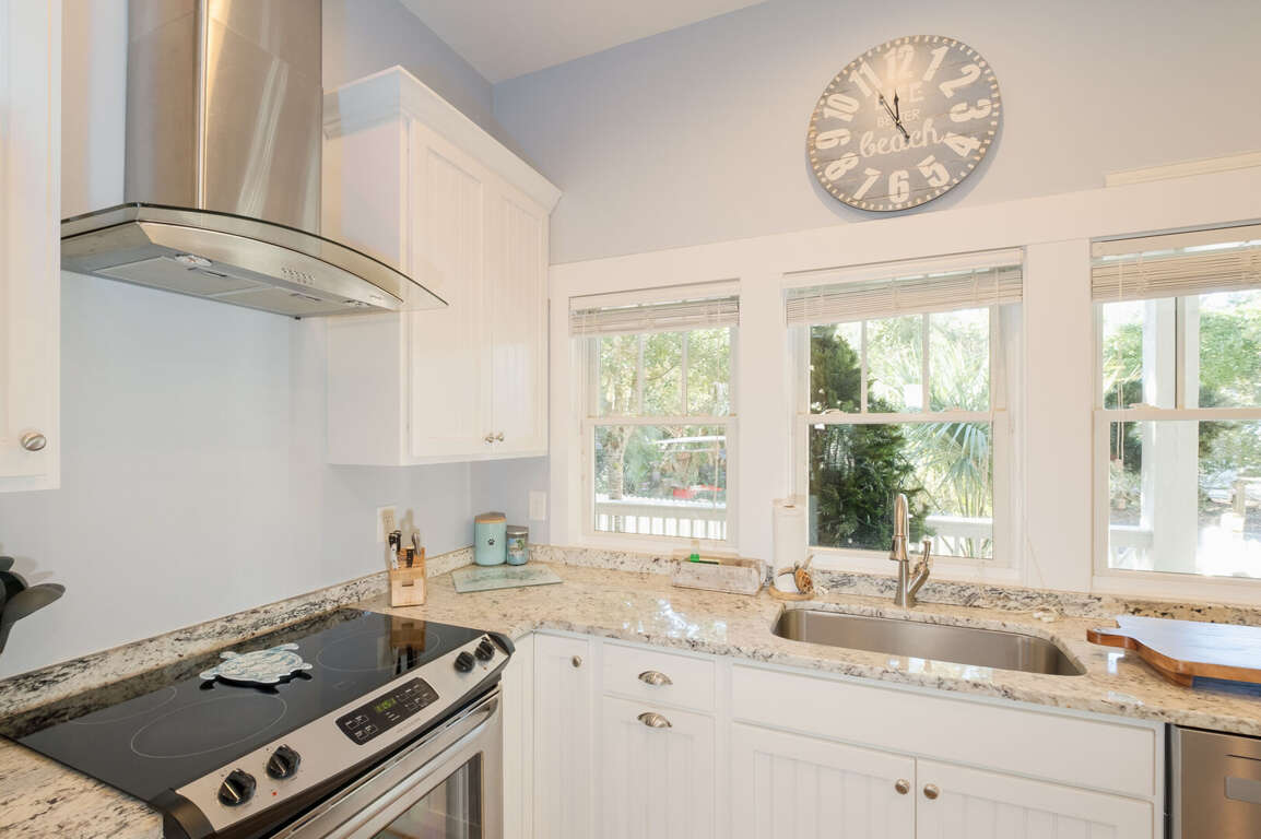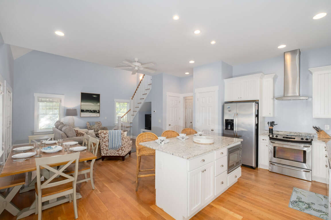 Inside, step onto warm hardwoods in the well-appointed kitchen of this cozy, open floor plan. You'll appreciate the gleaming granite counters, large prep island with breakfast bar, stainless appliances, and spacious pantry. The nearby dining set is sided by a wall of natural light-sharing windows. Enjoy nibbles here or through the French doors to the house-length screen porch where you can commune with the Island's abundant nature while savoring bites or your first cup of joe. Back inside, the living space is brightened by its two stories of windows. It's a great spot to share family games, movies, conversation and snuggles.<br />