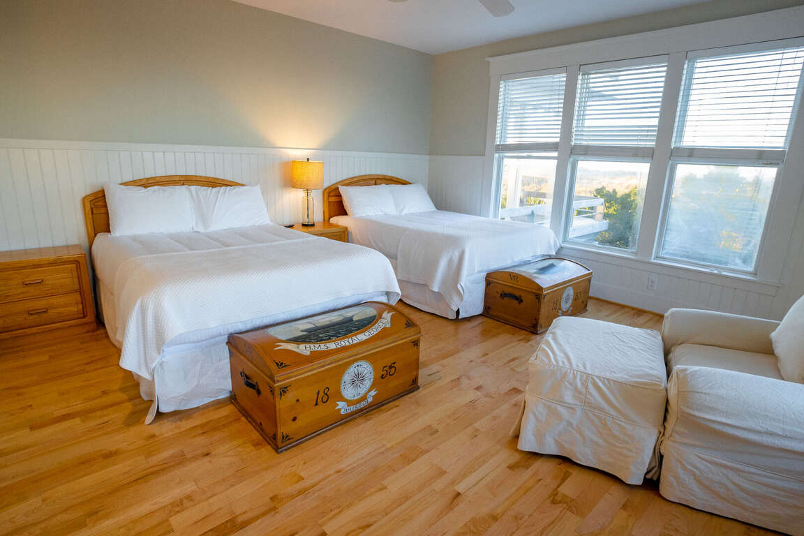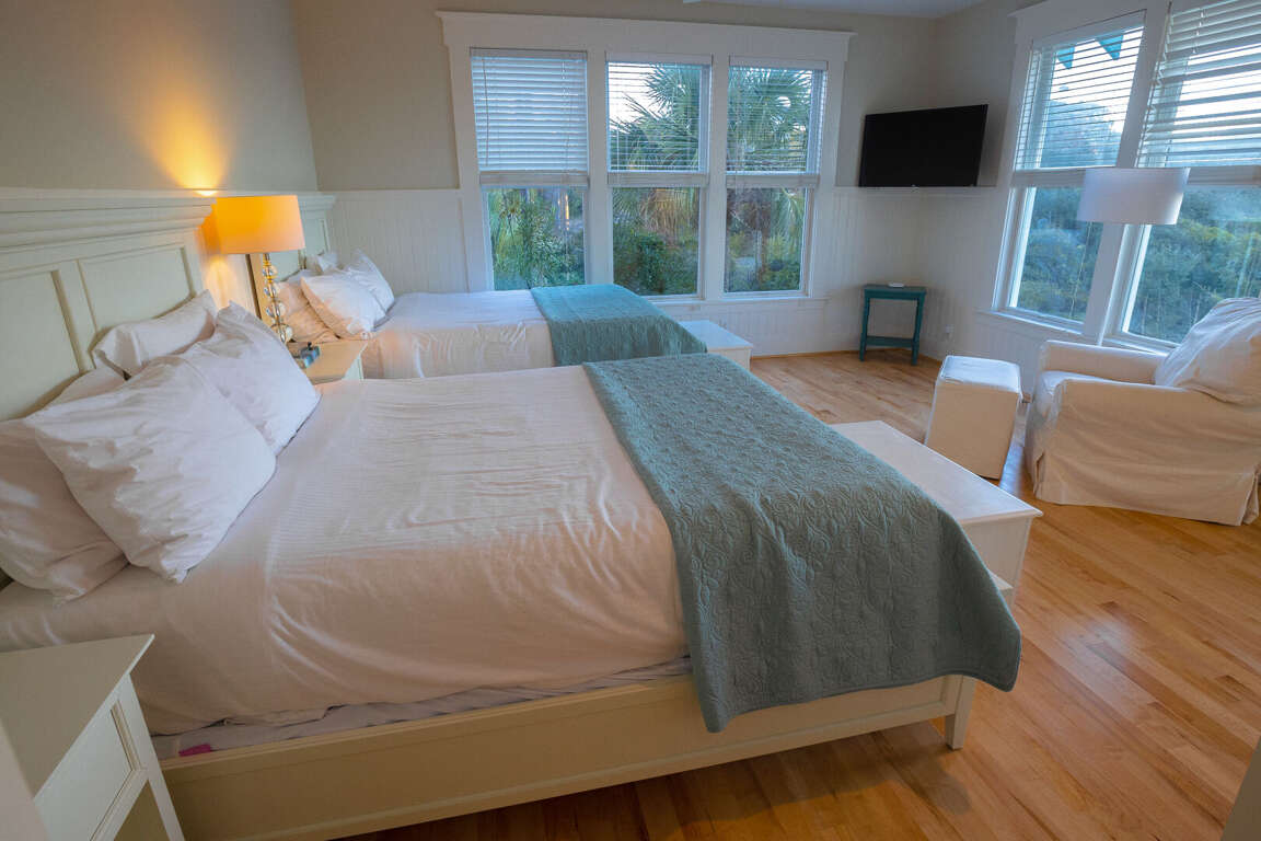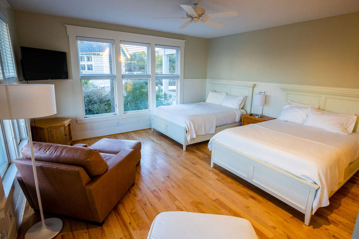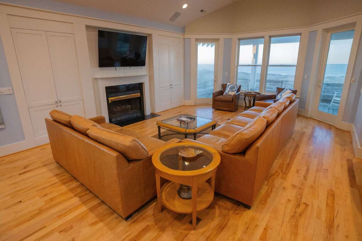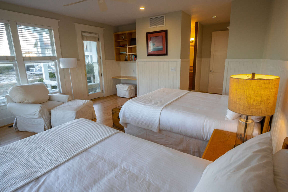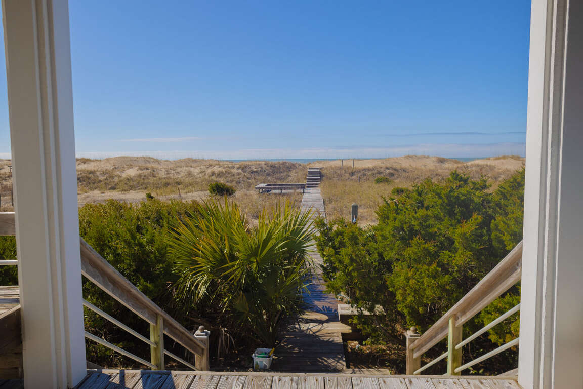 (5BR/5.5BA,1K,8Q, SLP16, 2 golf carts, Sunday Turn in Peak Season, CHECK OUT 10:00AM / CHECK IN 5:30PM) Sandbagger is an unforgettable oceanfront home-just steps from the sand- offering hypnotic panoramas of the Atlantic.<br /> <br /> This welcoming five bedroom, 5.5 bath luxury beach haven spoils with a full bathroom, television, DVD player, telephone and work area in each bedroom. Cross the deep rocking-chair covered front porch and enter this reverse floor plan into an oversize open foyer/living area brimming with light from myriads of windows. This gathering space delights with mesmerizing beach vistas, an entertainment center and a large island/snack bar with a wet bar and mini-fridge. It also provides access to a spacious oceanside covered porch. Linger here and relish the soothing sounds of waves breaking on the shore or step down to your private beach walk and stroll to your own sun deck and/or South Beach. Back inside, this level also houses four spacious Queen suites, each furnished with two Queens and each housing its own full bath ensuite and access to its own private porch.<br /> <br /> Upstairs, you enter another large open living space accented by a soaring cove ceiling, warm hardwoods and bright sunshine and anchored by a lovely decorative fireplace. This is fronted by another covered porch-perfect for watching dolphins playing in sparkling water. The newly renovated dining room provides comfortable seating for twelve. Eat here or dine al fresco on the screened dining porch. The chef's kitchen boasts stainless Kitchen Aid appliances, quartz counters and an ample central island/breakfast bar; but its best feature is its jaw-dropping view of Frying Pan Shoals.<br /> <br /> For those in your party wanting additional privacy, the home's detached crofter grants it in first-class style via a very generous King suite with its own kitchenette, dining set, laundry, full bath and ocean-facing sundeck. Sandbagger's additional amenities include internet, beach chairs, beach umbrellas, grill and infant accommodations and support through WWP's 24/7 Property Manager Assistance Line-which means you can reach needed help even after hours or on weekends. There are no bicycles at this property but they can be rented through rental companies on the island.<br /> <br /> IMPORTANT NOTE ON CLUBS: Both clubs are independent from WWP or any WWP properties. As such, all arrangements for temporary memberships must be handled by renters directly with the Clubs. Renters are strongly encouraged to make desired reservations with the club immediately upon booking, and also to become familiar with club policies, procedures, and schedules. WWP representatives will not be able to answer most club-related questions.<br /> <br /> NOTE: TRAM SPACE IS LIMITED - PLEASE CALL TO MAKE YOUR RESERVATIONS TO AND FROM THE ISLAND WHEN BOOKING. WWP IS NOT RESPONSIBLE FOR GETTING YOU TO AND FROM YOUR RENTAL HOME. WWP DOES NOT GUARANTEE NUMBER OF OR CONDITION OF BIKES, BEACH UMBRELLAS, BEACH CHAIRS, BEACH TOYS, OR BEACH TOWELS. ANY CANOES, KAYAKS, OR PERSONAL WATERCRAFT ARE NOT A PART OF THE HOME RENTAL AND SHALL NOT BE USED BY RENTAL GUESTS.
