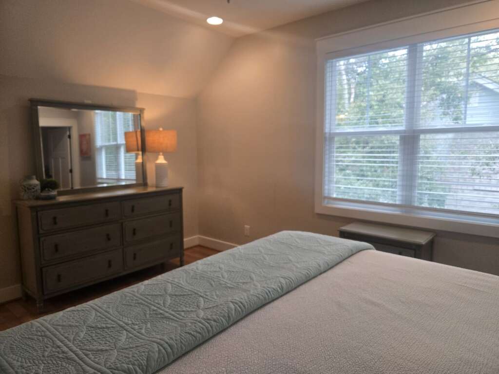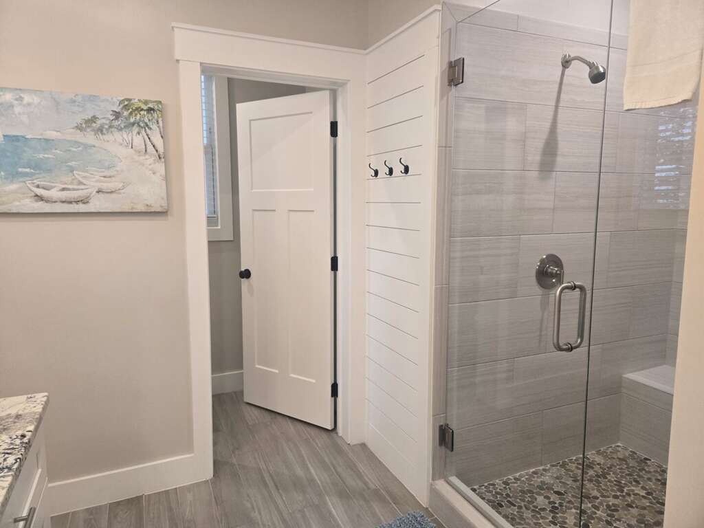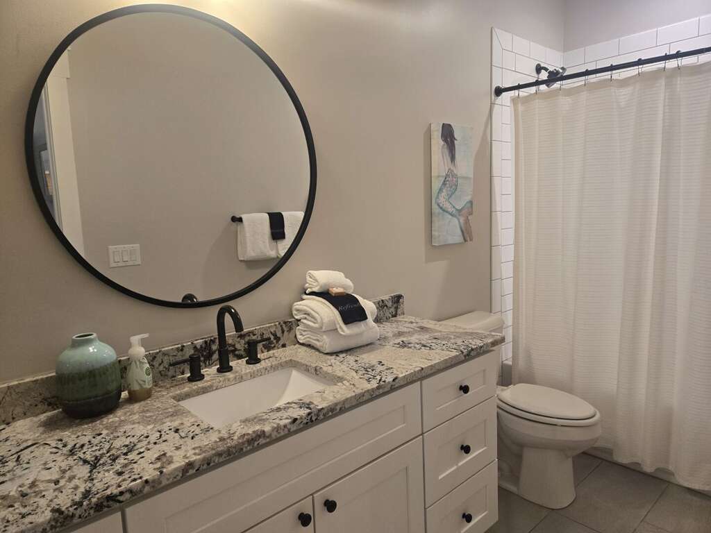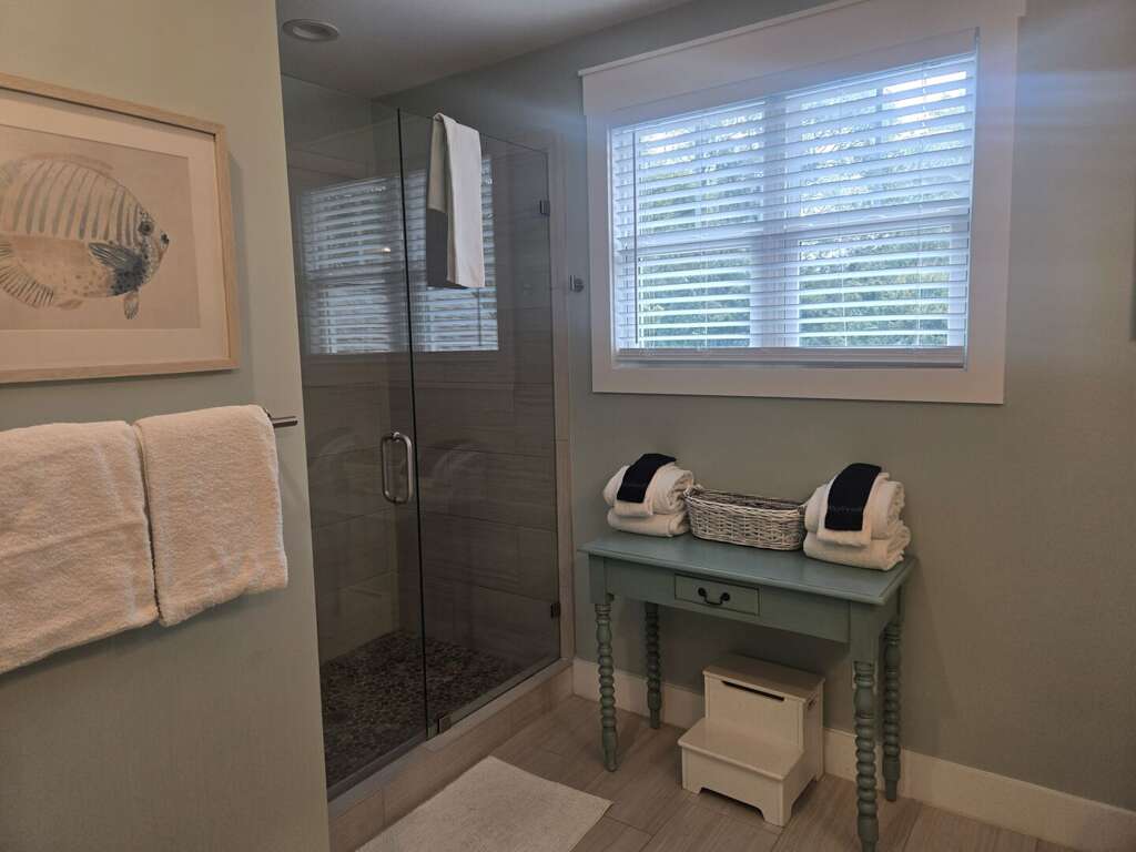 The first-floor primary suite offers a king bed, TV, workspace, and a spa-style bath with a walk-in glass shower and double vanity. Upstairs includes two king bedrooms (one with a private ensuite), a kids’ room with two twin beds, and an additional full bathroom. Sleeps up to 8 guests.<br />
