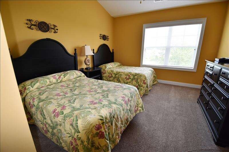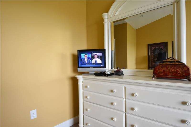 The master suite has a king size bed and private en suite, complete with a jacuzzi tub, walk in shower, and double sinks. There is plenty of storage space and a walk in closet. The second bedroom features two full size beds. An additional sitting room closes off with double French doors to make a third bedroom using the pull out sleeper sofa.