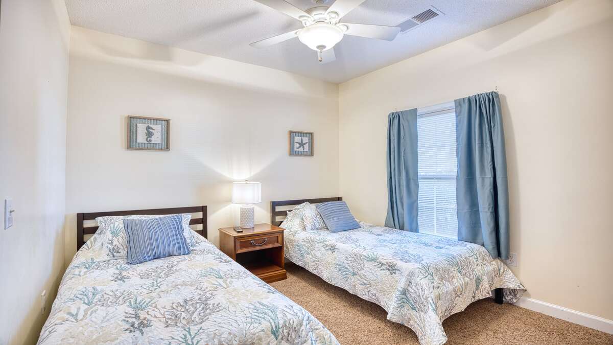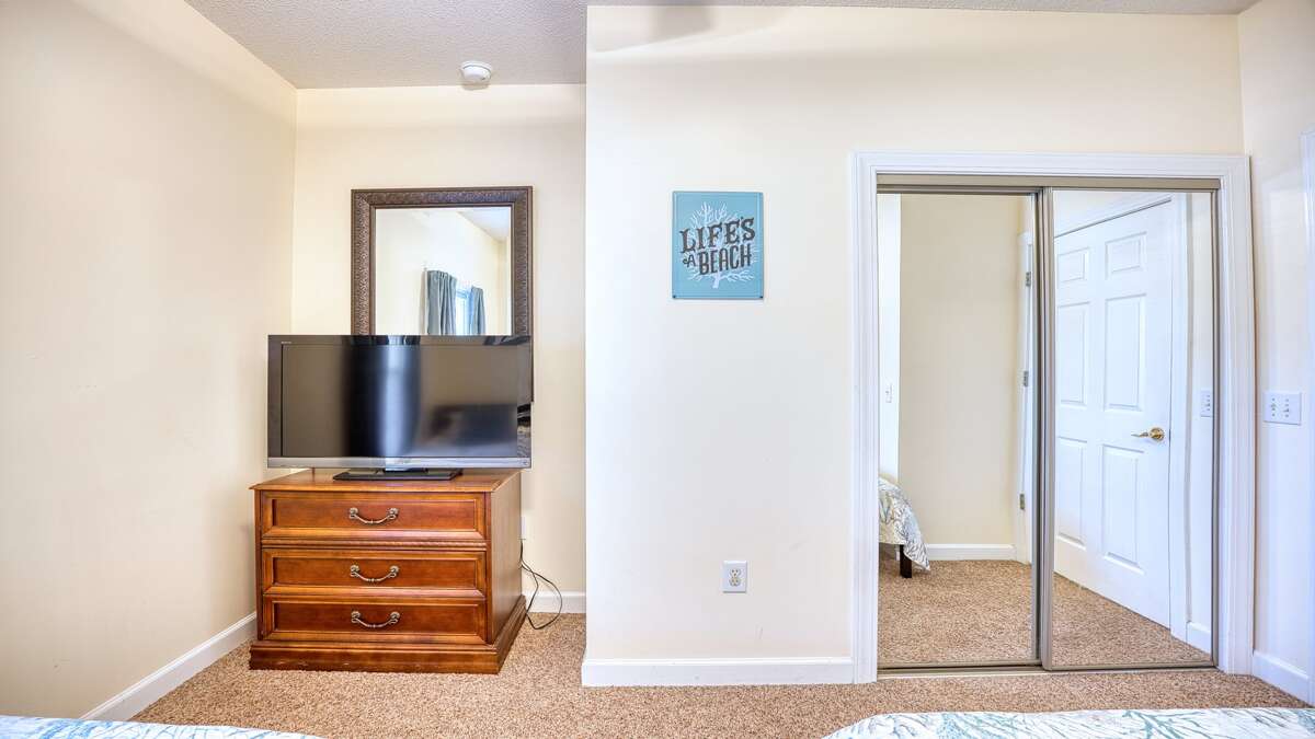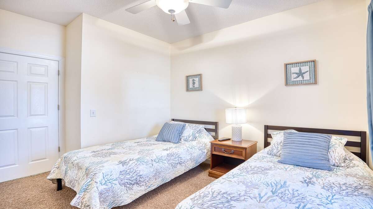 On the opposite end of the villa the second bedroom has two twin beds, a flat panel TV, a full closet and nothing but cozy comfort for our guests.