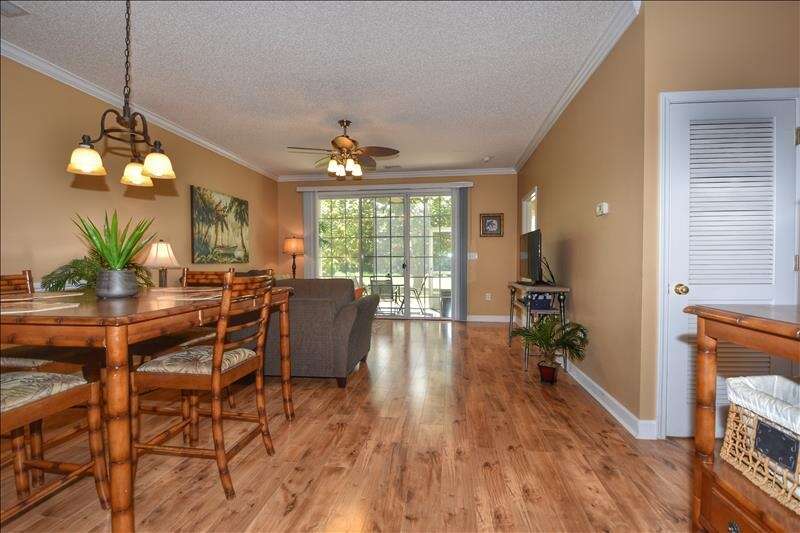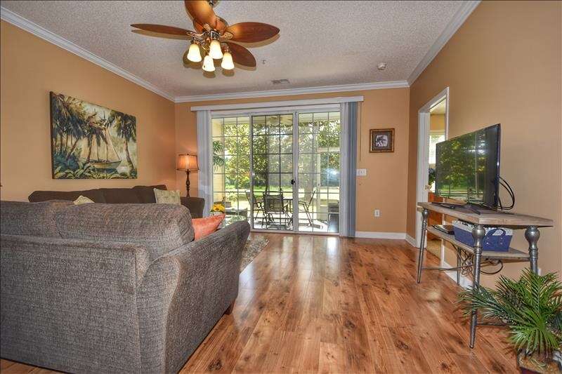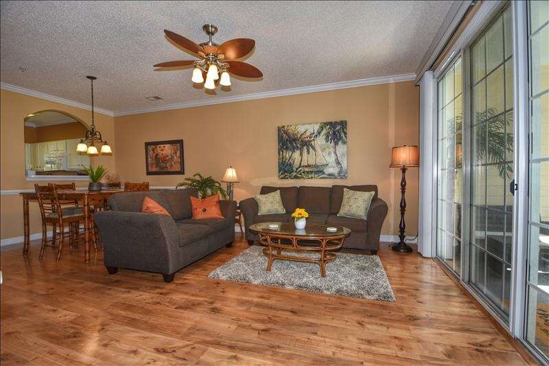 This lovely ground-floor villa has over 1050 square feet plus a screened in patio overlooking the 9th fairway of the award winning Greg Norman course, and is just steps from the huge Havens community pool and barbecue area. The master suite has a king-size bed that can be split to make two twins, the second bedroom has two twin beds, and there is a queen-size sleeper sofa in the living room!