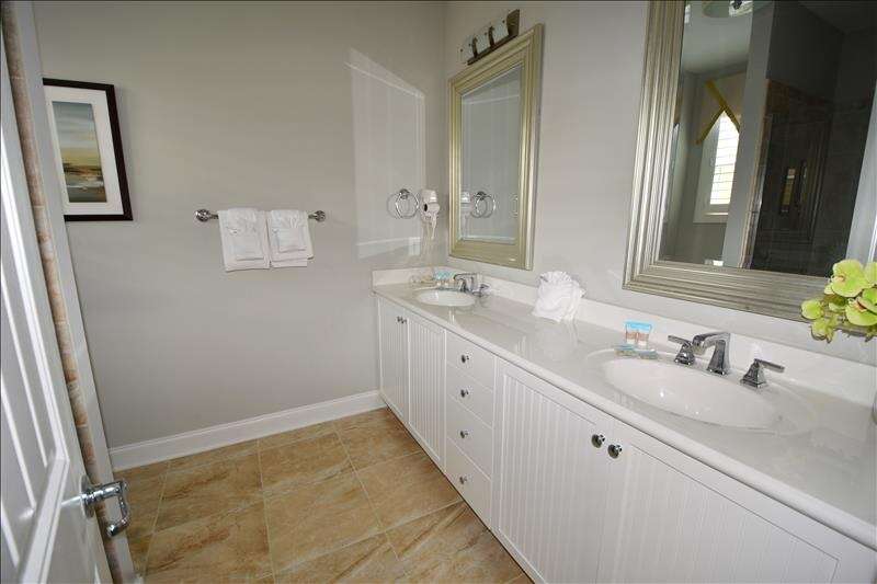 Two dramatic bedroom suites make this an excellent choice for two couples. One suite has a gorgeous king size bed and private bath retreat and the other a splendid queen suite with the second full bath just outside the door.