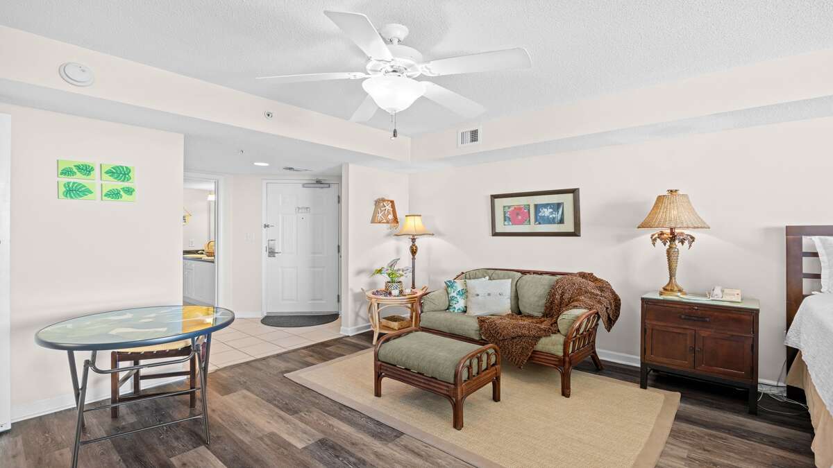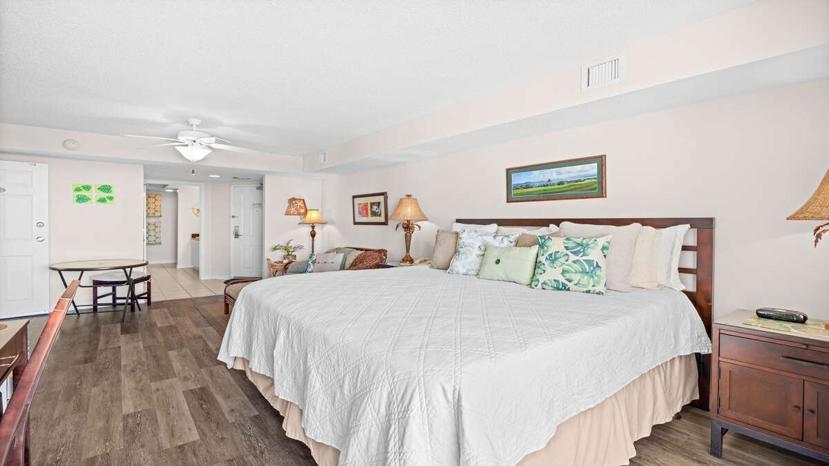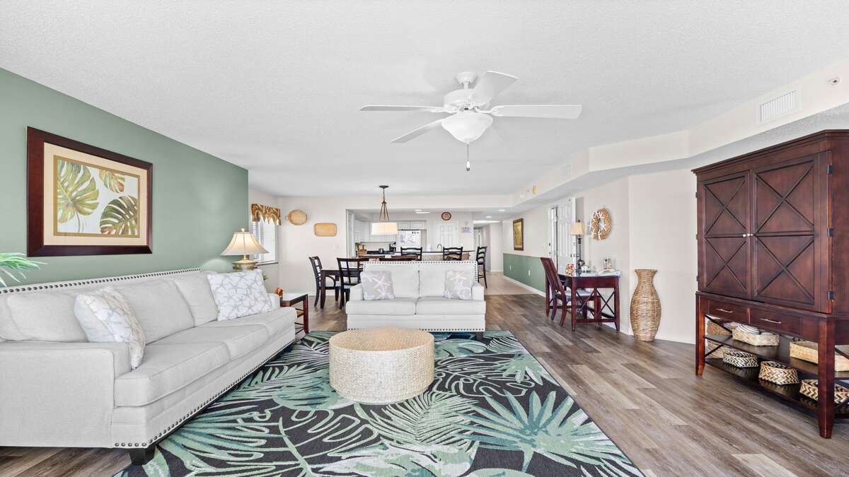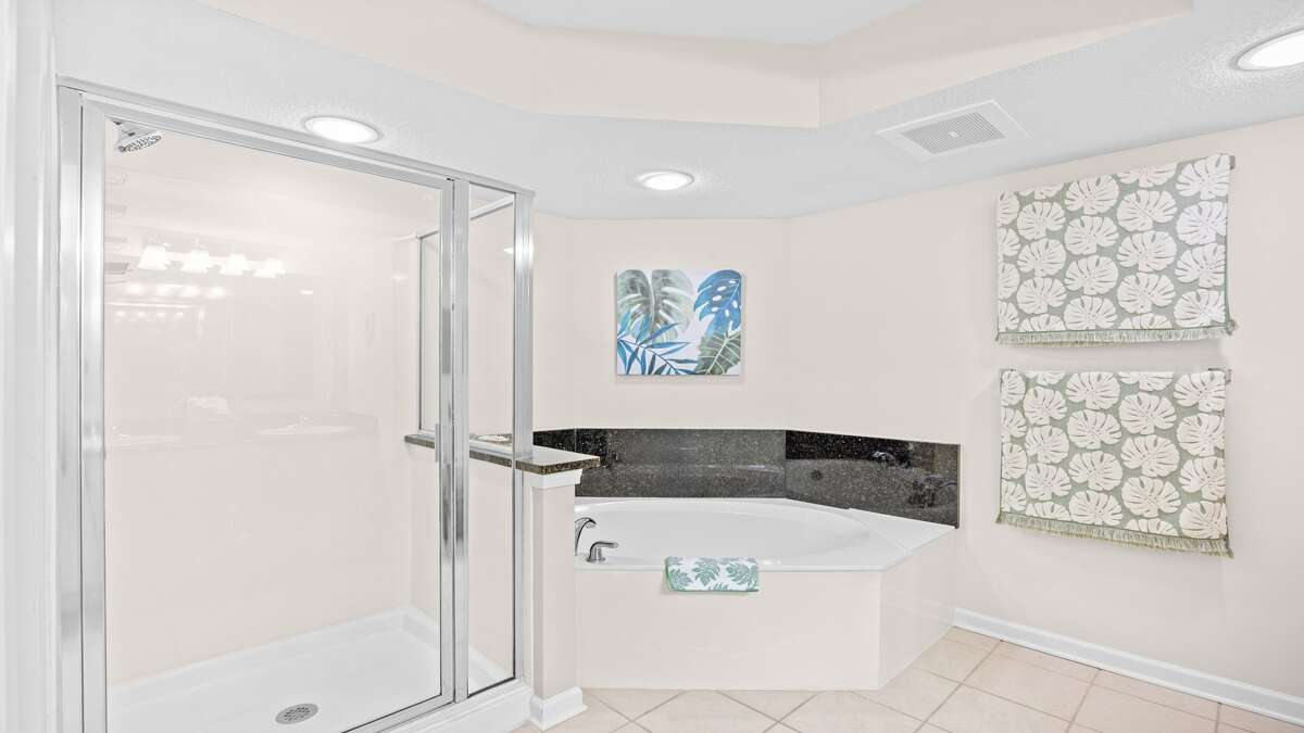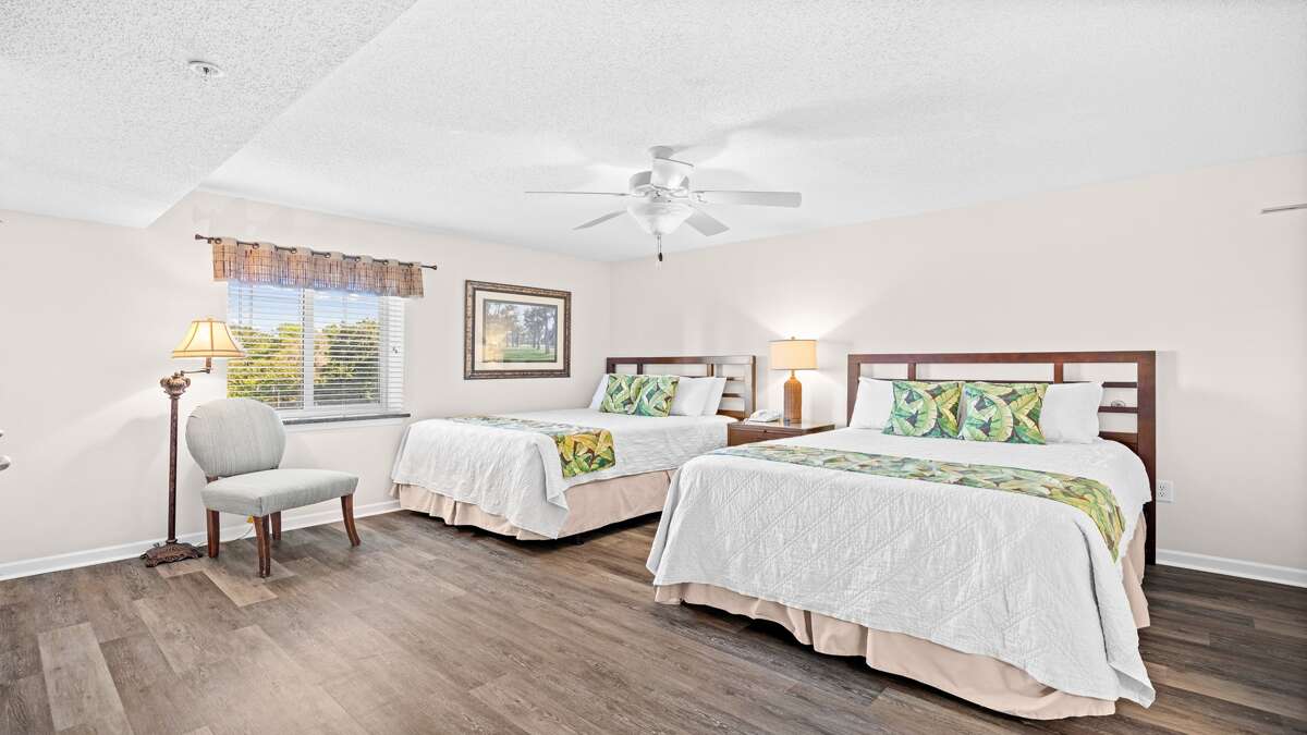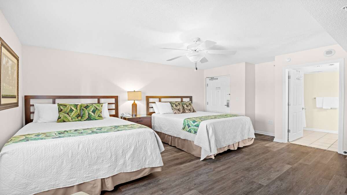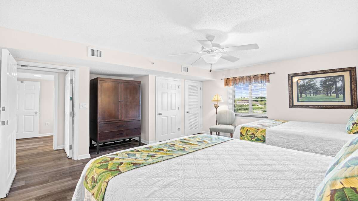 The spacious living room is stylishly decorated with plenty of comfortable seating. This beautiful villa features new luxury vinyl plank throughout. The master bedroom is outfitted with a king bed, a private bathroom and flat screen TV. The second bedroom has a queen bed, a private bathroom, plenty of closet space and a flat screen TV. The third bedroom has two cozy queen beds, a private bathroom, and a flat screen TV. The bedrooms are set with gel foam toppers for additional comfort.