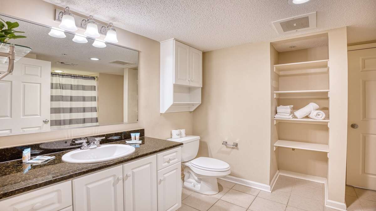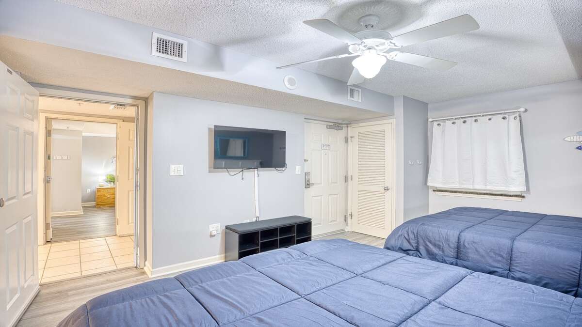 There are three luxurious bedrooms. The master bedroom features a king-size bed, a sprawling balcony with an incredible view, a master bath, and a flat-screen TV. The second bedroom has two cozy queen beds, a private bathroom, plenty of closet space, and a flat-screen TV. The third bedroom features a queen-size bed and also has a flat-screen TV.