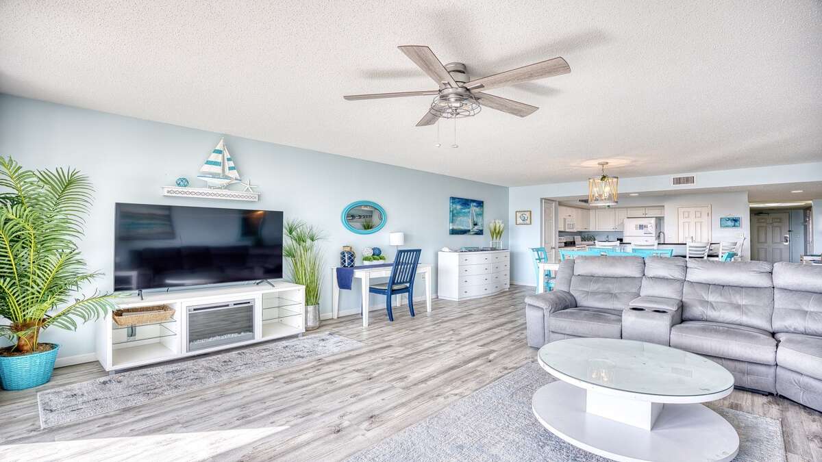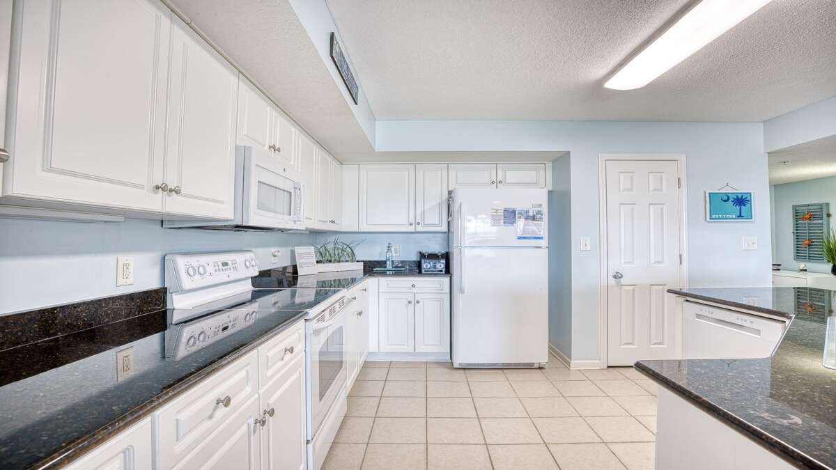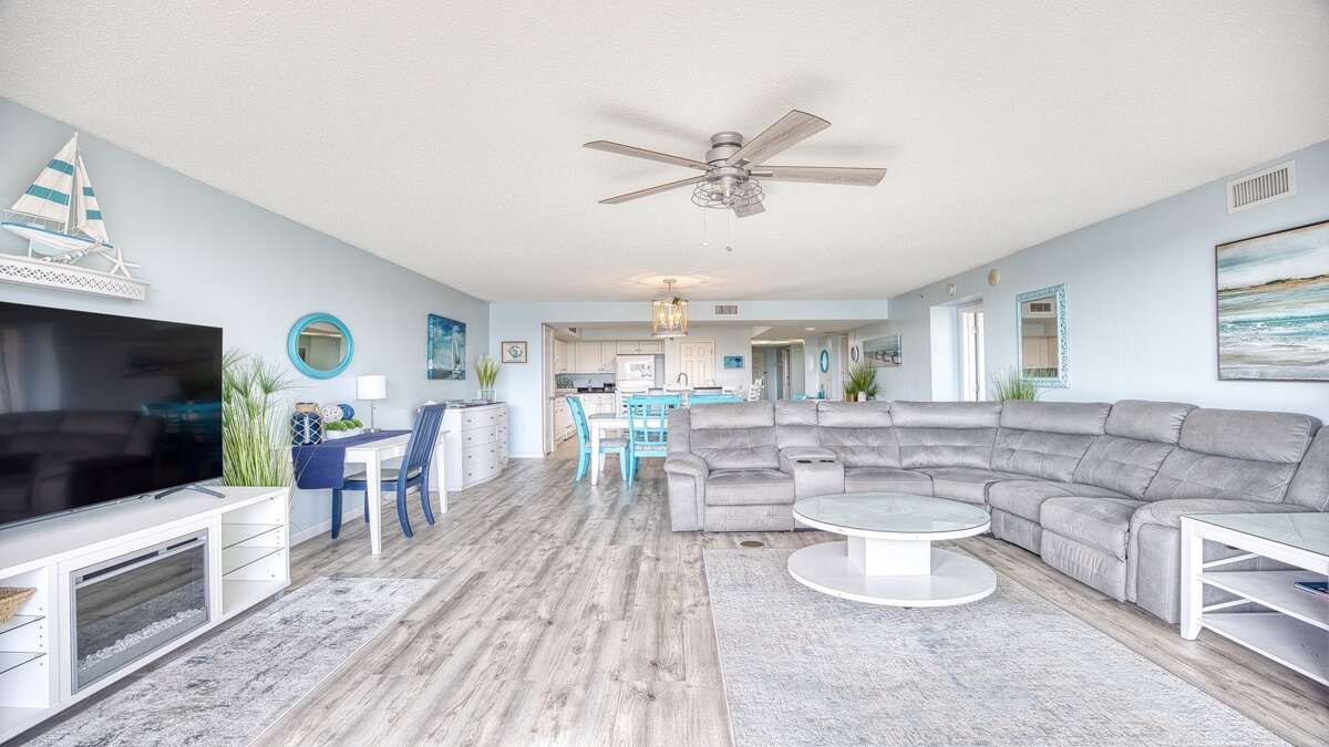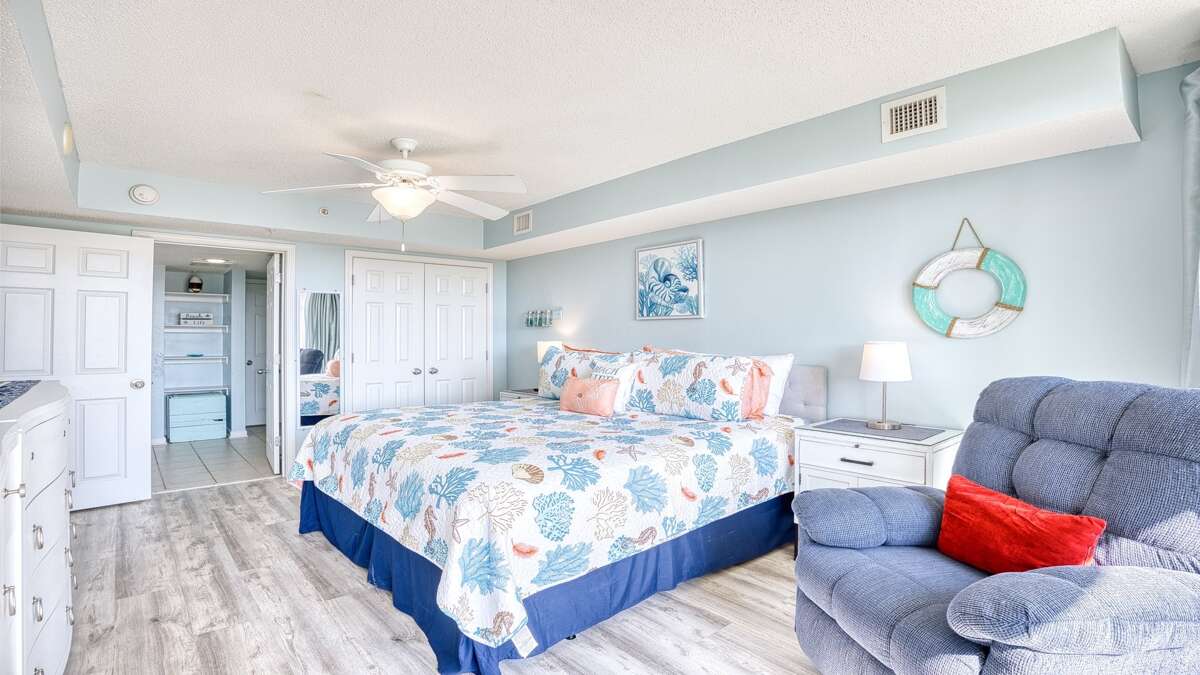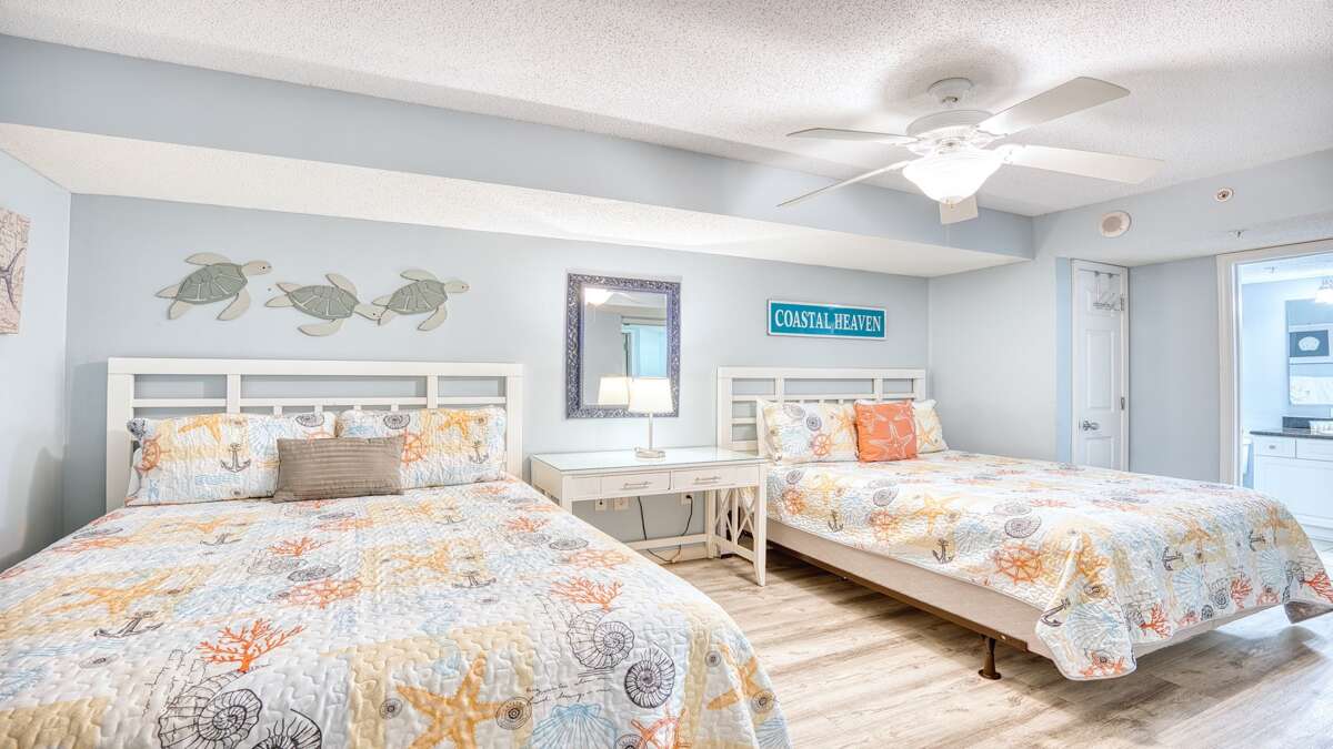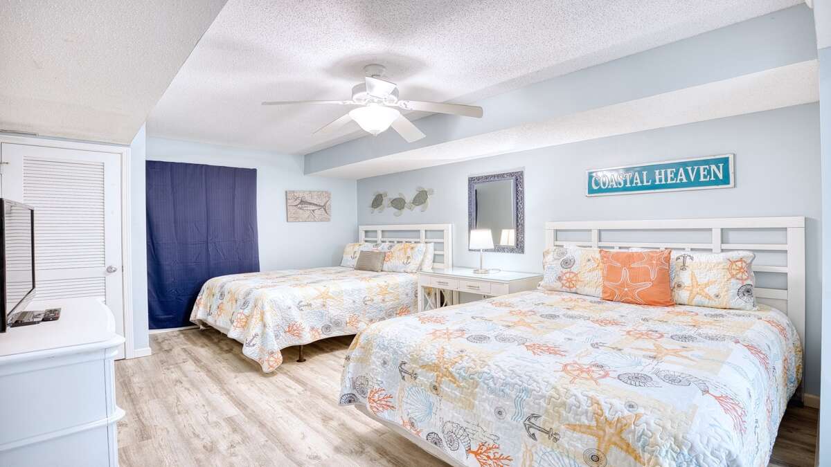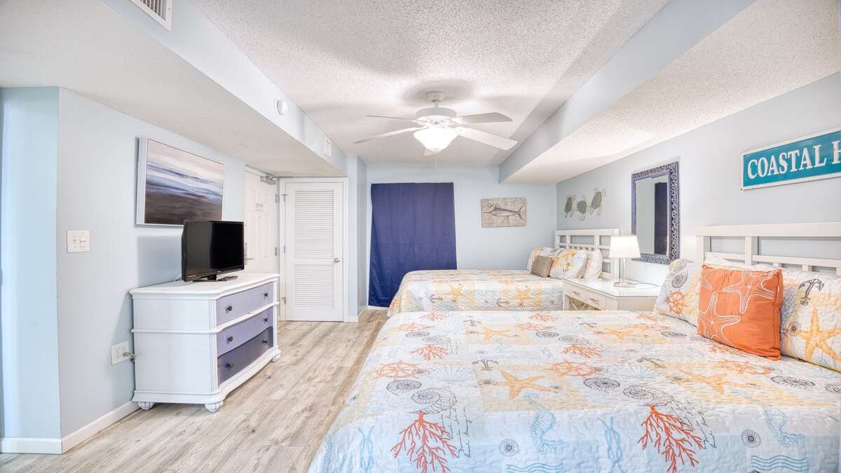 There are three luxurious bedrooms. The master bedroom features a king-size bed, a sprawling balcony with an incredible view, a master bath, and a flat-screen TV. The second bedroom has two cozy queen beds, a private bathroom, plenty of closet space, and a flat-screen TV. The third bedroom features a queen-size bed and also has a flat-screen TV.