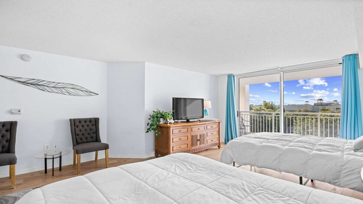 There are three luxurious bedrooms. The master bedroom features two queen size beds, a sprawling balcony with an incredible view, a master bath, and a flat-screen TV. The second bedroom has two cozy queen beds, a private bathroom, plenty of closet space, and a flat-screen TV. The third bedroom features a queen-size bed and also has a flat-screen TV.