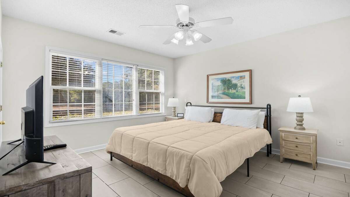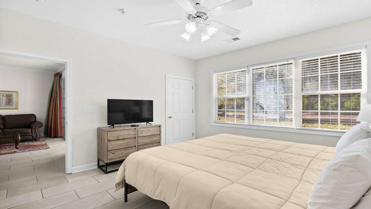 The master suite features a beautiful king-size bed, restful artwork, a ceiling fan, and a TV for late-night viewing—creating a true relaxation haven. A private bath adjoins the master suite.