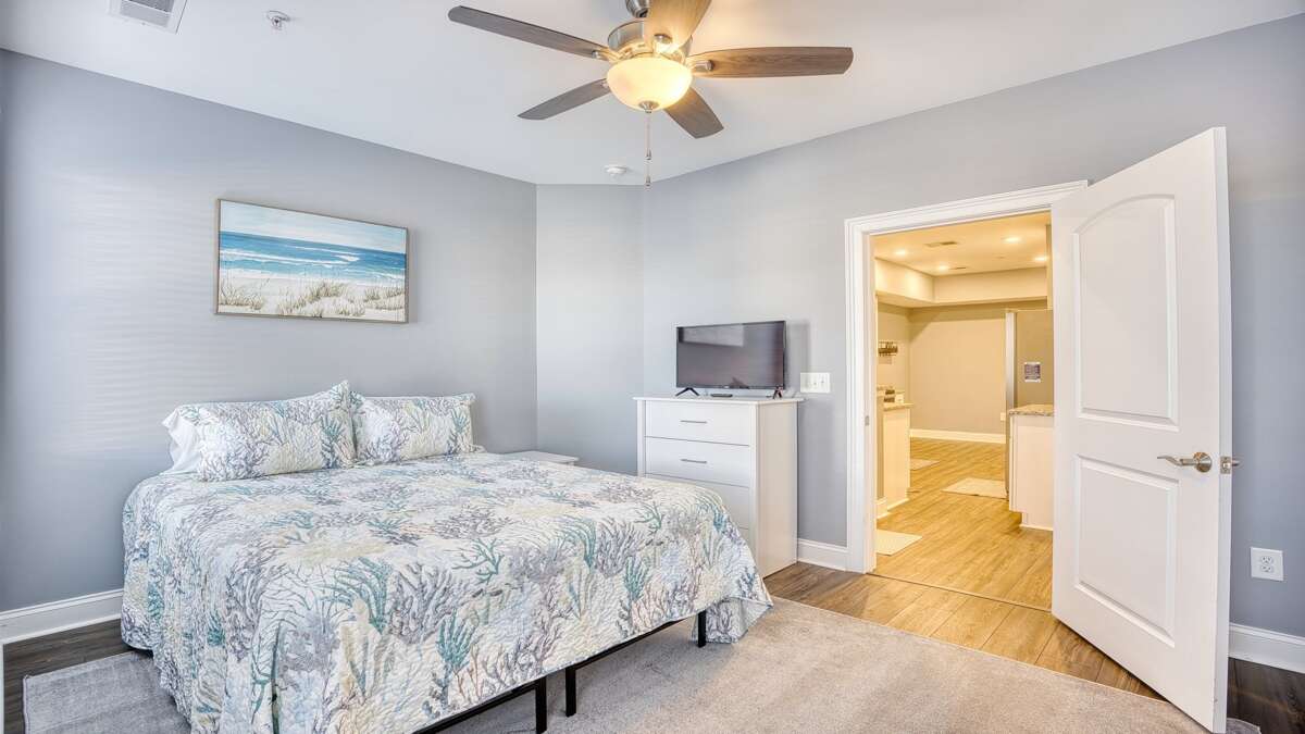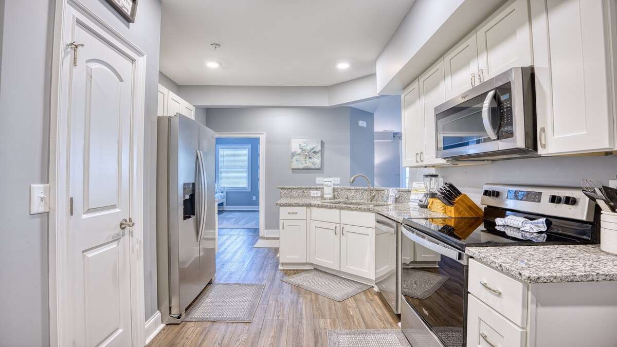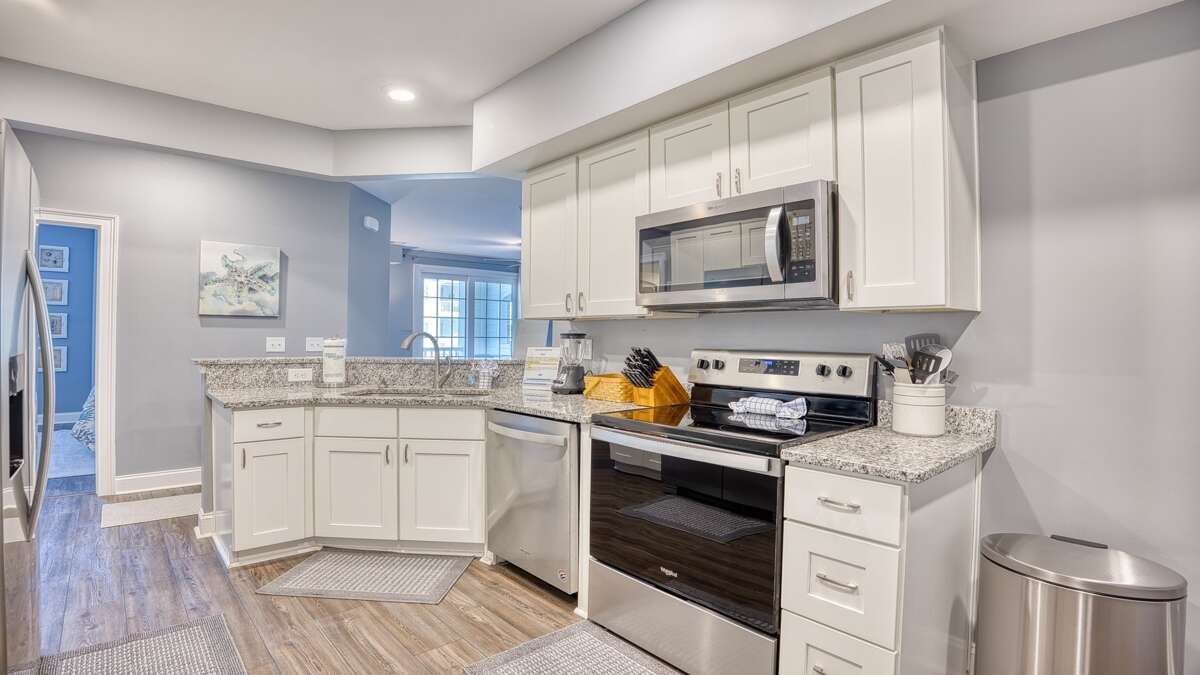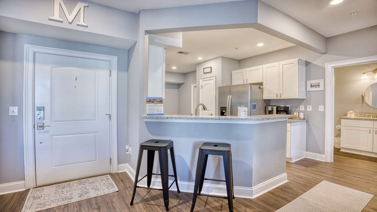 There are two stunning bedroom suites, one with a gorgeous king size bed, dresser, walk in closet, TV and clothing armoire and a private bath suite complete with a double vanities and an easy step in shower. The second bedroom features a queen and twin size beds, TV and chest for additional room. The full second bath is right off of the second bedroom with a tub and shower enclosure. For your convenience, a large laundry room is located in the unit as well.