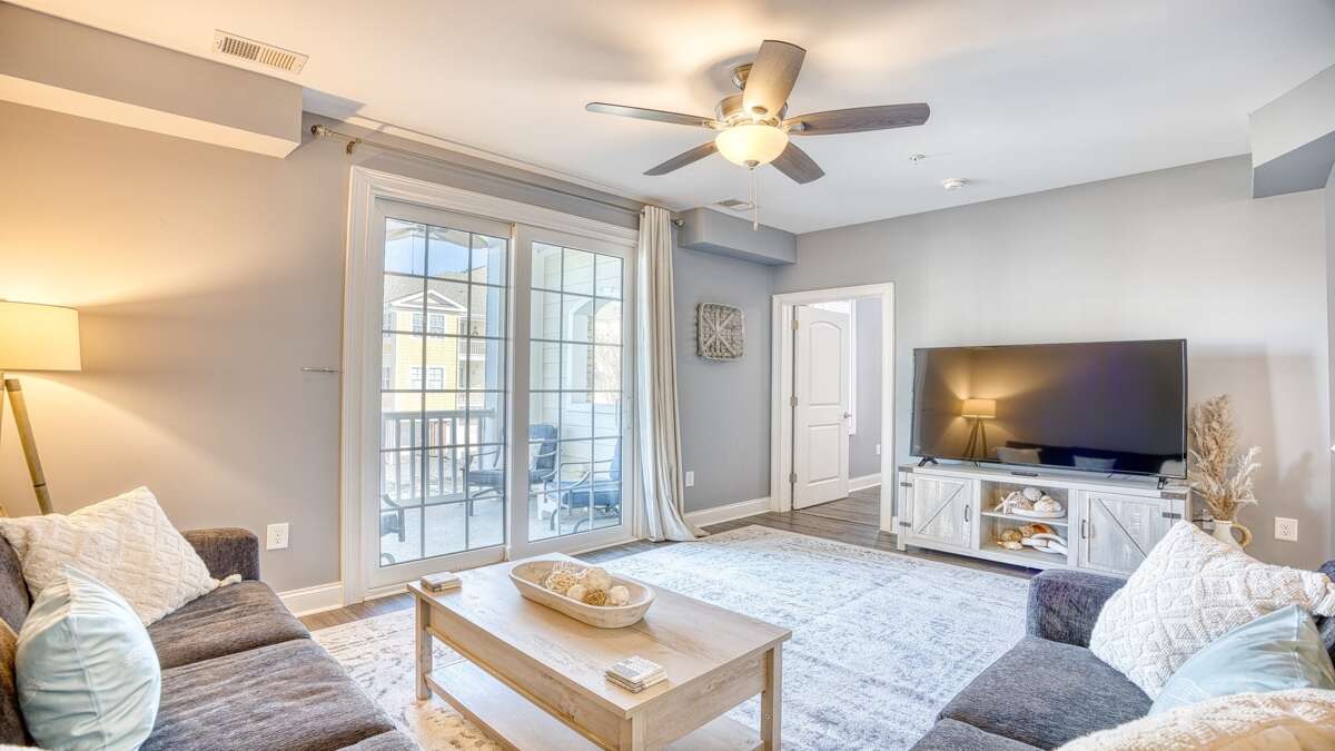 Two-bedroom villa rental in North Myrtle Beach with an open floor plan, covered lanai, full kitchen, and access to The Havens pool and shuttle.