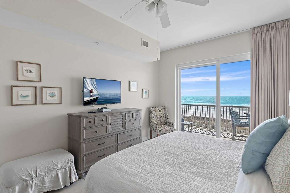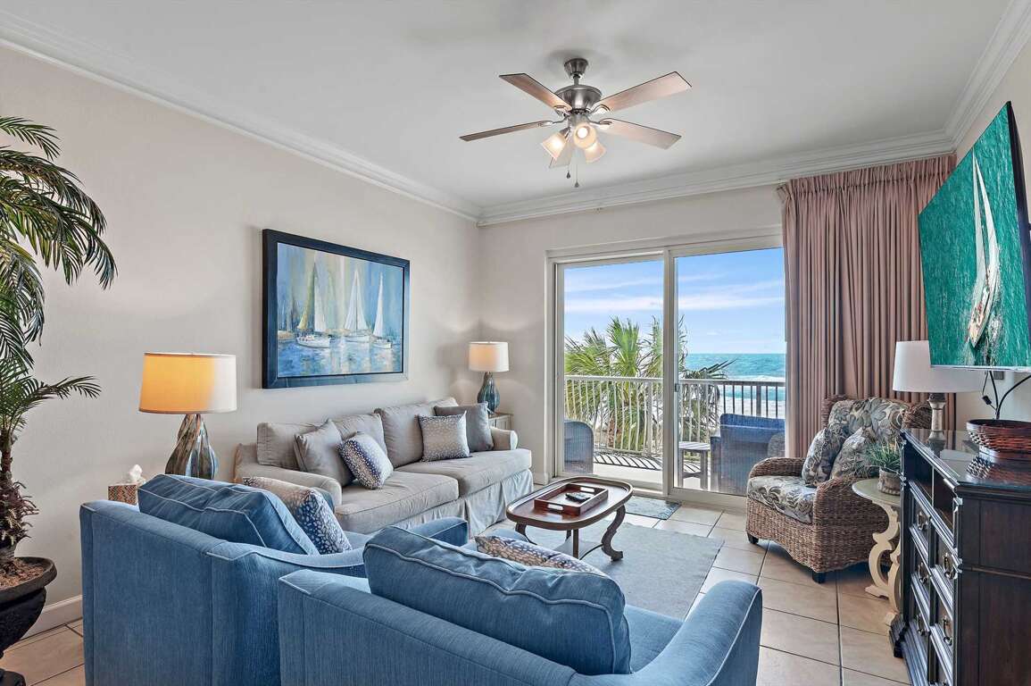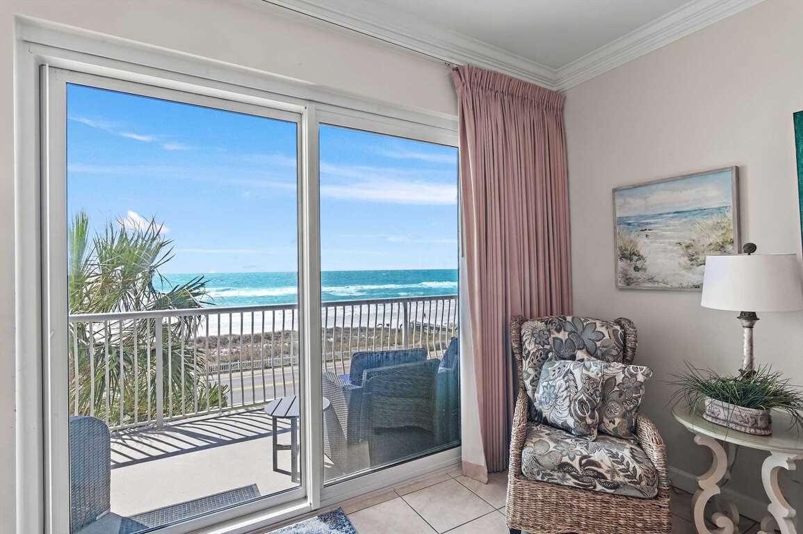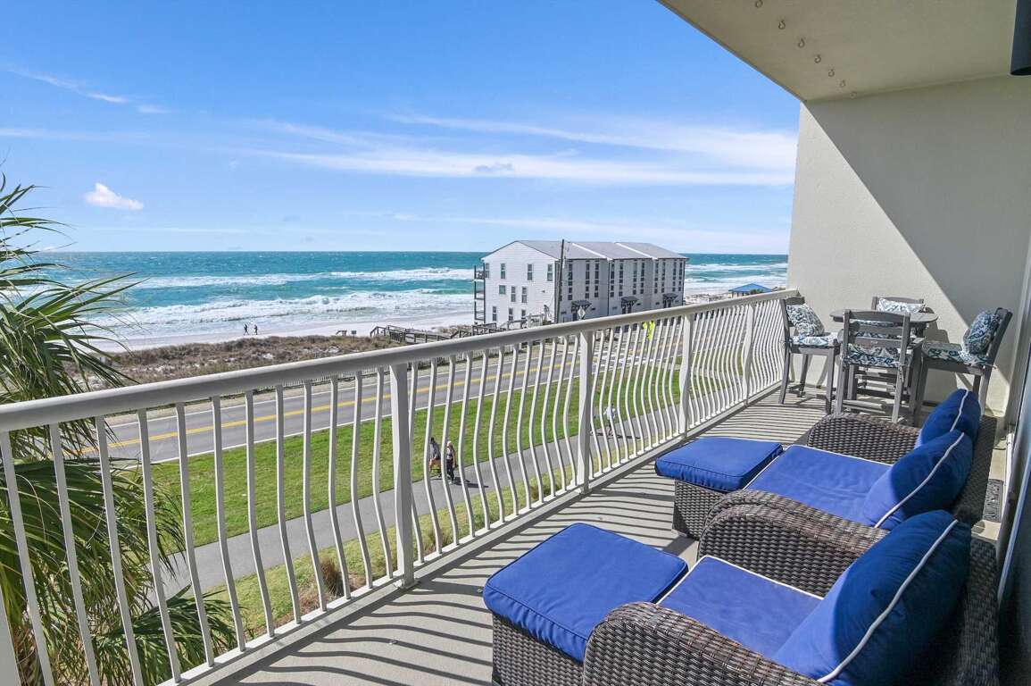-Gulf-Front Views: Unwind on the large balcony with breathtaking Emerald Coast views, accessible from both the living room and master bedroom.