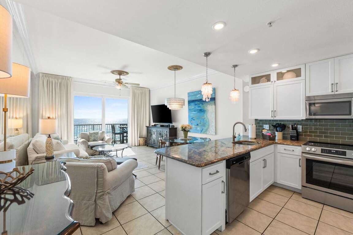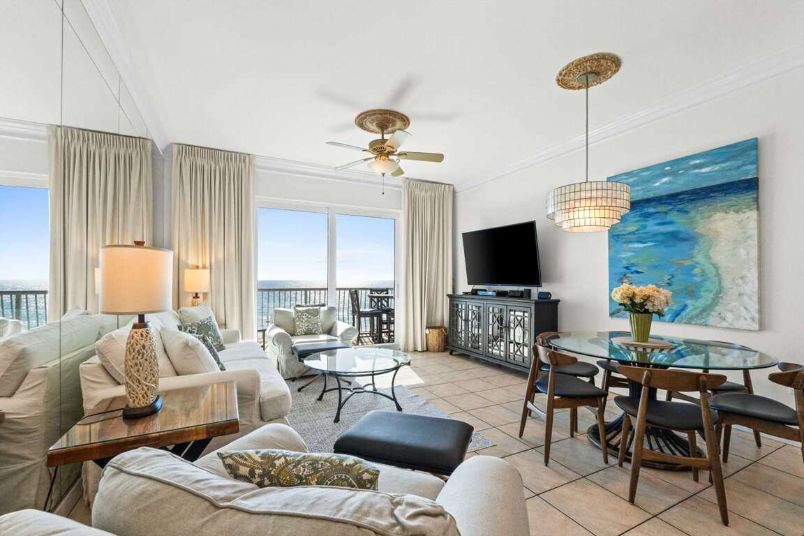 -Gulf views and balcony access from living room, kitchen and dining area