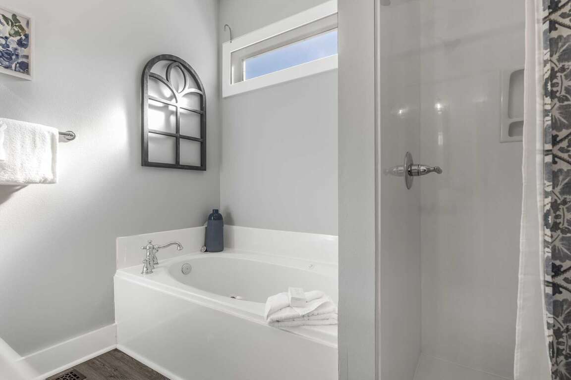 -Master Bedroom (2nd Floor): King bed with private balcony and ensuite bath featuring a garden tub and separate shower, large smart TV