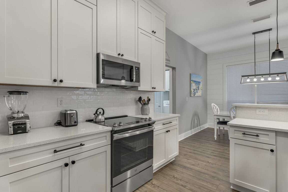 -Fully Stocked Kitchen: Beautifully updated kitchen with quartz countertops, stainless steel appliances, bar seating, and a spacious pantry.