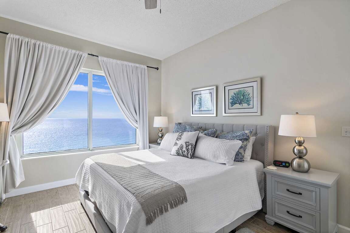 -Master Bedroom: King bed with a full Gulf of Mexico view and ensuite bath featuring a walk-in shower.
