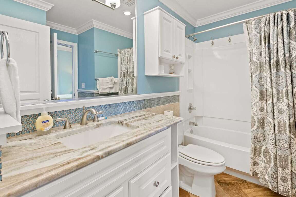 -Guest Bathroom: Ensuite to guest bedroom 2, shared access complete bath with shower/tub combo