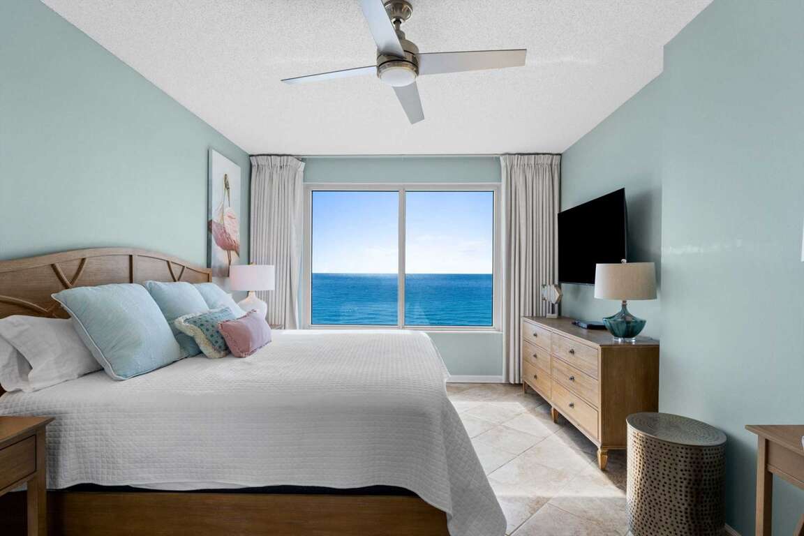 Master Bedroom: King bed with stunning Gulf views and private ensuite bath featuring a jetted tub