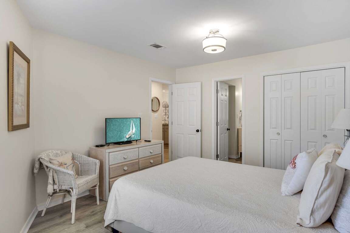 -Master Bedroom: King bed | Attached full bath with shower/tub combo