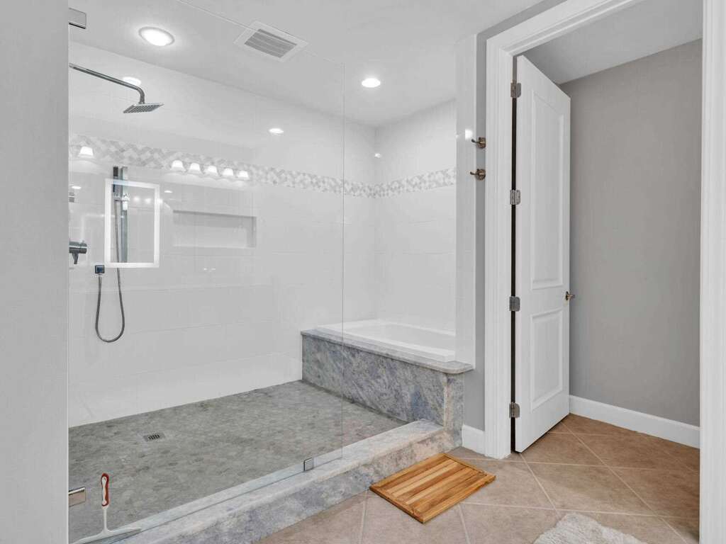 -- Primary suite with a king bed, walk-in shower, spa-style tub, and balconyaccess
