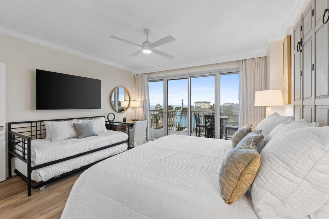 Bedroom 3: King bed plus daybed with trundle, private balcony access, and views