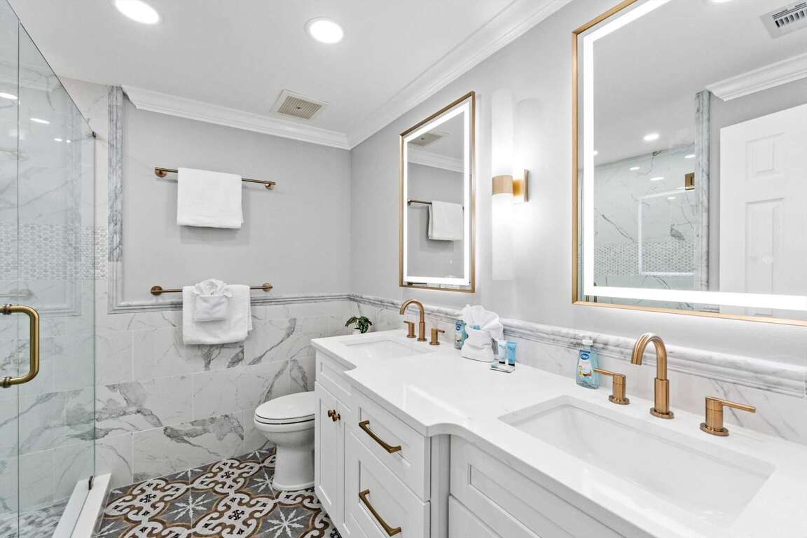 Bedroom 1 (Primary): King bed, private ensuite bathroom, walk-in shower