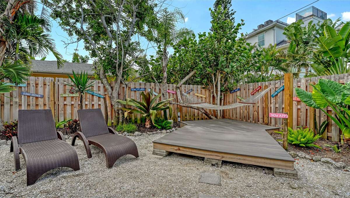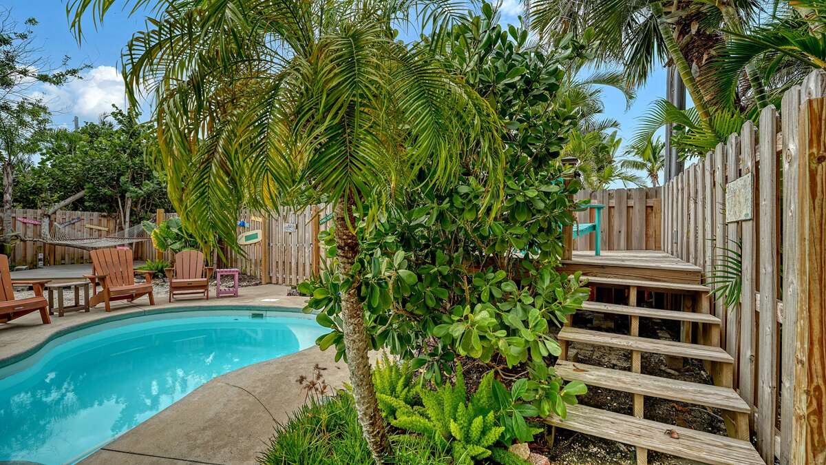 Step into the backyard for a tropical oasis that includes a salt water pool, tiki bar, and a small stage which is now the hammock landing pad! The fridge in the tiki bar keeps your beverages cold as you cool off in the pool or sit on the bar stools and listen to music through outdoor Bose speakers. Catch glimpses of the Gulf and hear the waves at night. You're just a short walk to the beach! There is a cart to carry your stuff to the beach because, after all, you're on vacation.
