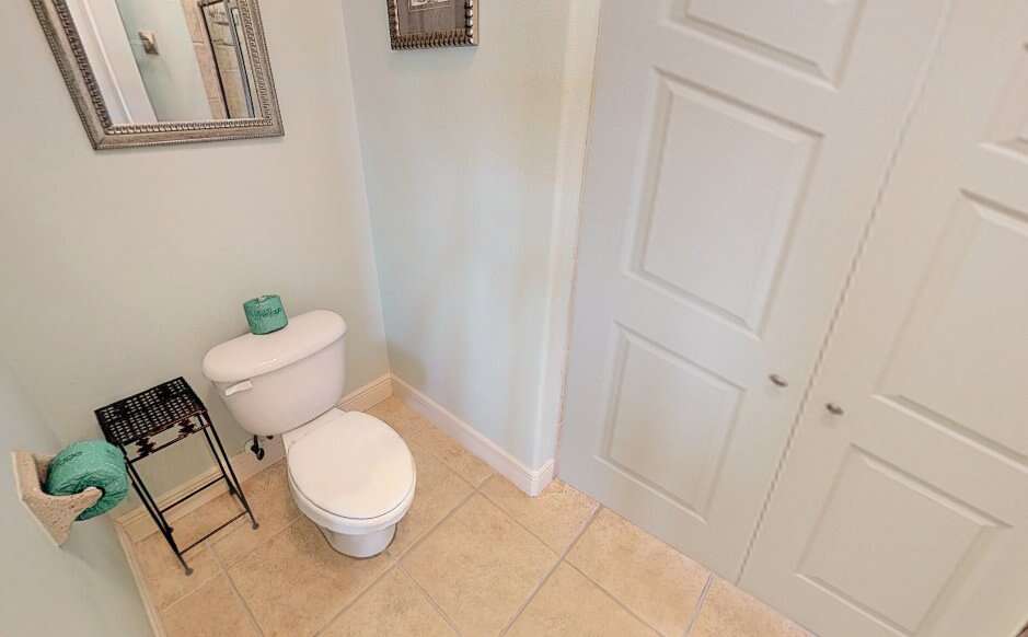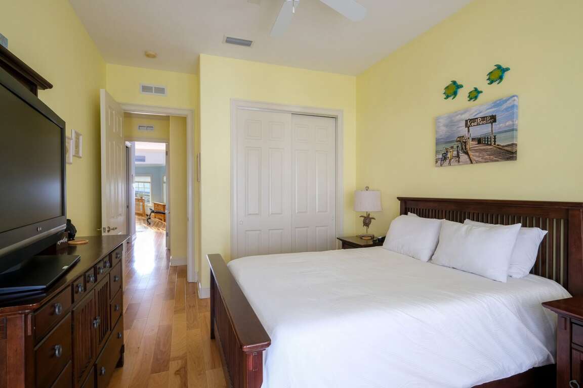 Up one level you’ll find a big, open common area, with a fully equipped kitchen, breakfast bar, dining area, laundry room, half bath, and a large living area with a smart TV. A large screened balcony overlooks the Gulf; filled with comfortable furniture, it’s the perfect place for cocktails or enjoying a good book. Off the dining area, a smaller open balcony overlooks the Bay.