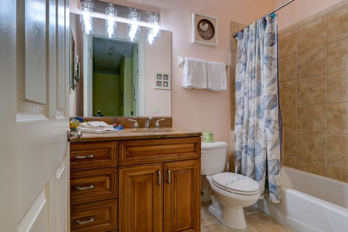 Upstairs on the third level you'll find a large master bedroom suite with lovely views of the Gulf, a king bed, flat-panel TV, and walk-in closet, while the beautifully remodeled master bath features a large double vanity and spa-like walk-in shower. Two other bedrooms are also upstairs, one with a queen bed and the other with two twin beds. Both rooms have their own TVs so everyone in your group can watch their own programs. These bedrooms share the hall bath which also features a granite countertop and a combination tub and shower.