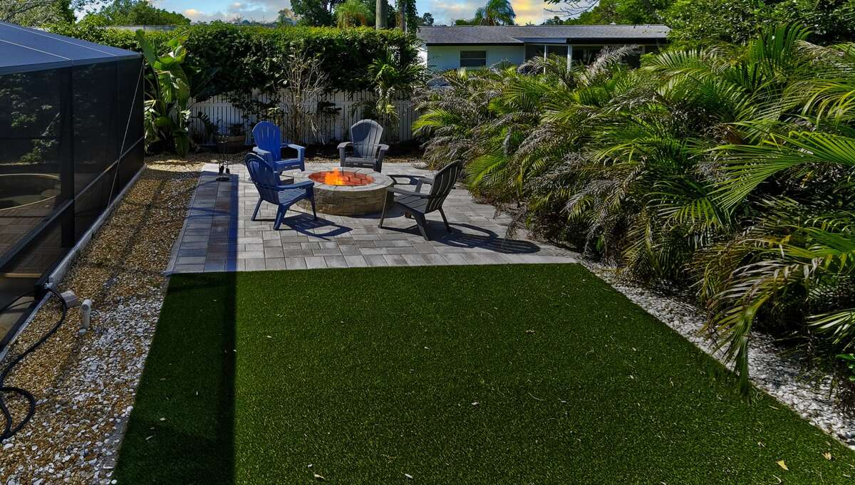 Step out the door to the welcoming screened porch with additional seating, including another table and chairs for al fresco dining and a grill. The backyard is fenced-in with a beautiful, heated pool and spa! Just outside the pool area is a private relaxing area with a fire pit.