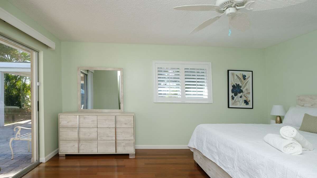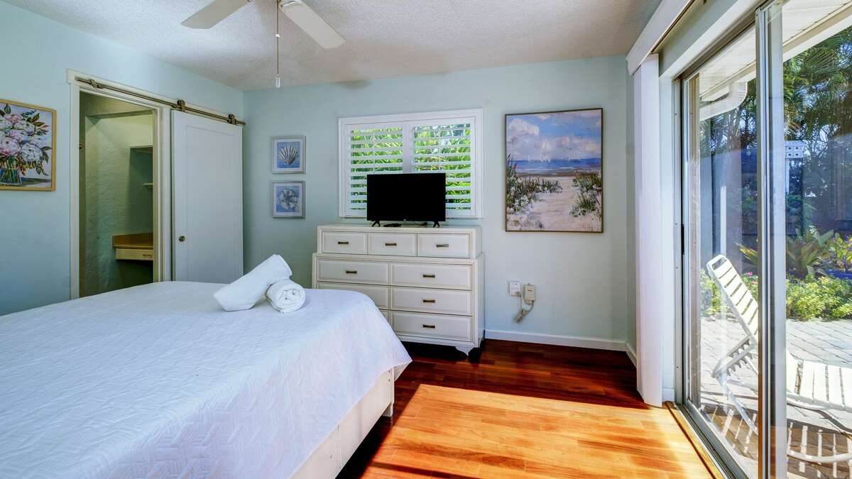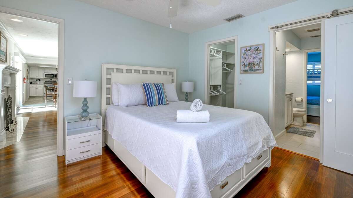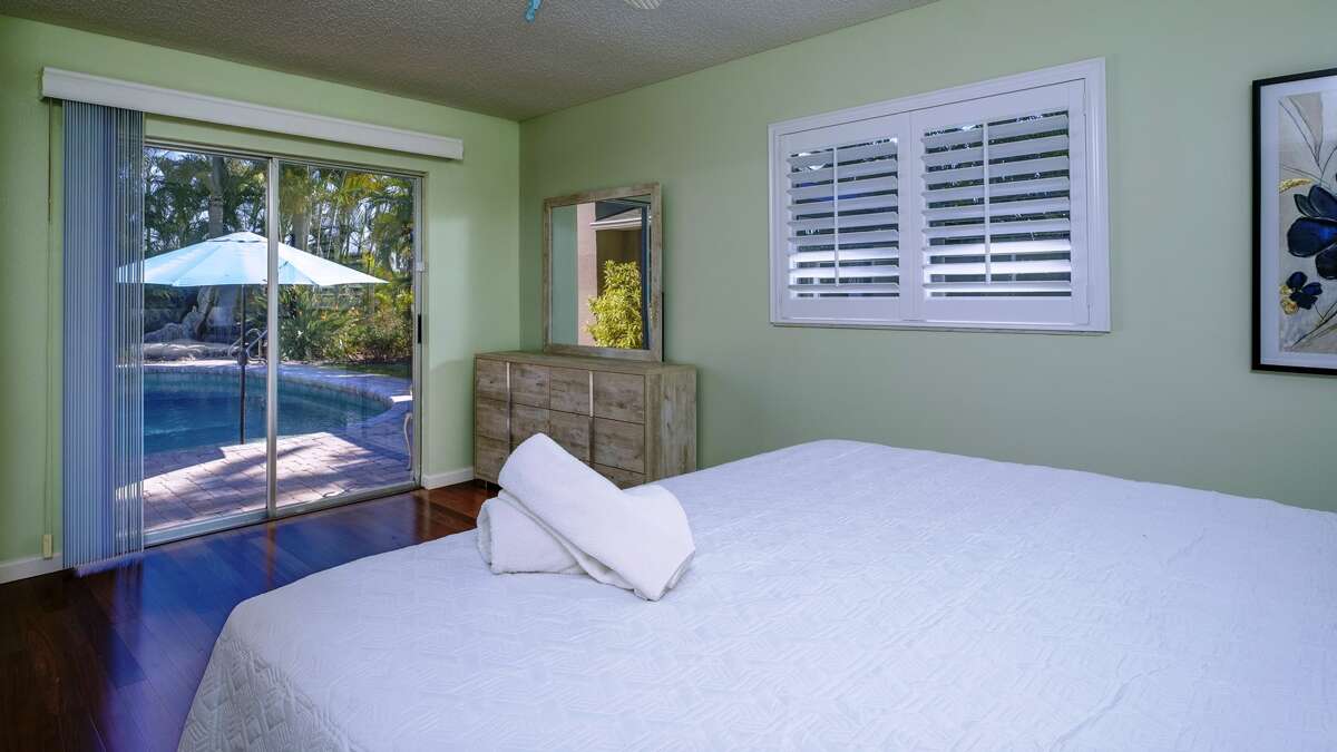 The Primary Bedroom incudes an En suite Bathroom with a double sink vanity and walk in shower. A King size bed sleeps two comfortably and the walk-in closet provides extra space for your belongings. You can step outside to the pool area right from the primary bedroom or from the Family Room.