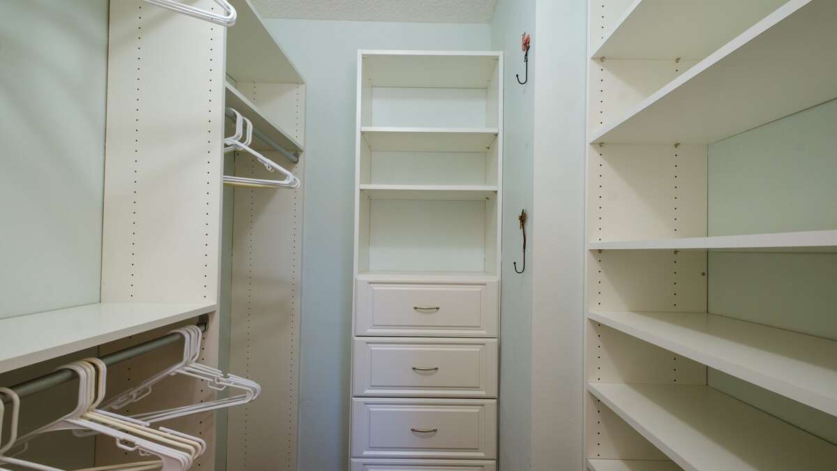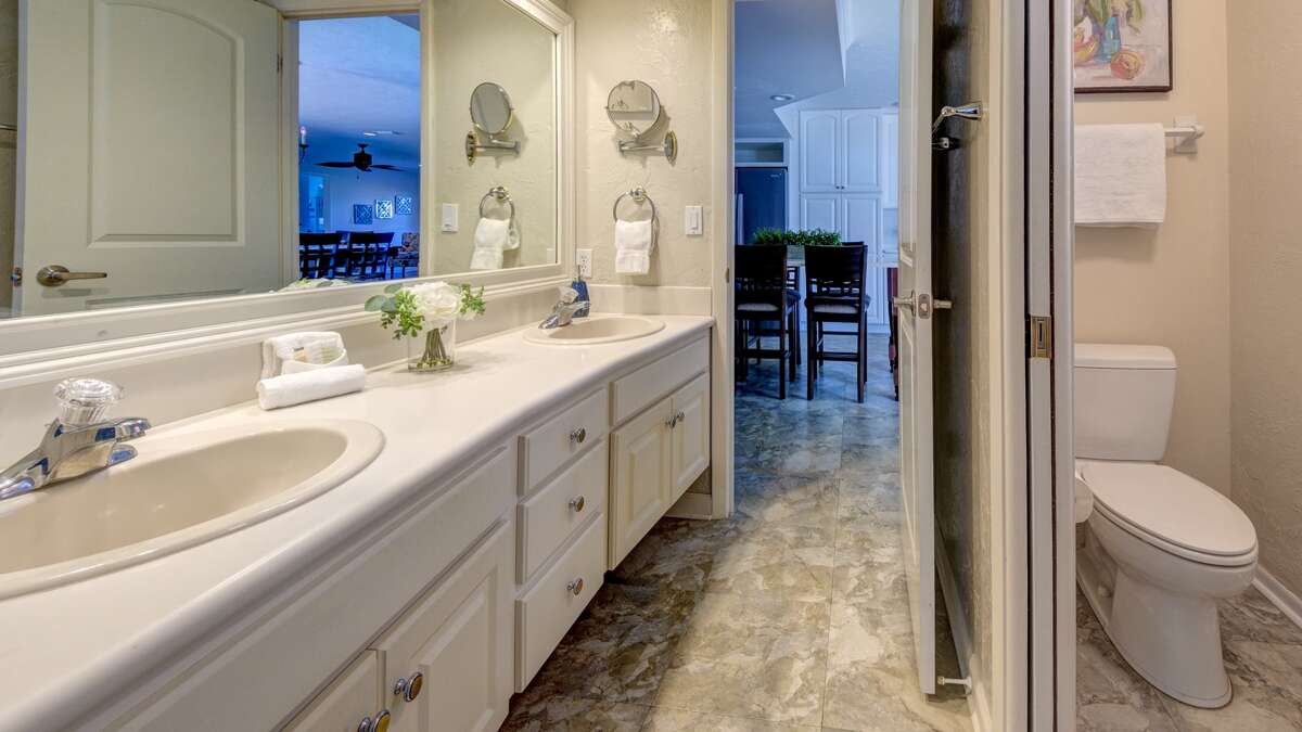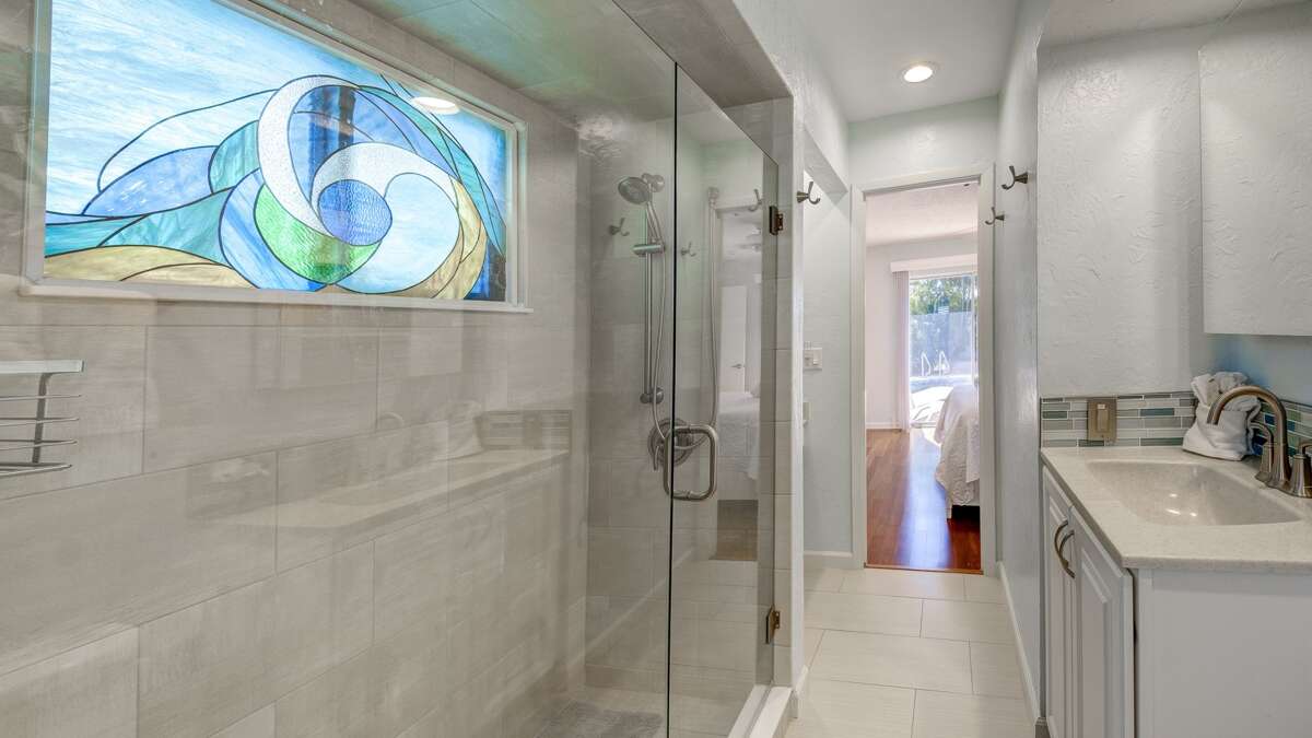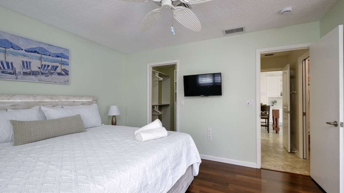 The Primary Bedroom incudes an En suite Bathroom with a double sink vanity and walk in shower. A King size bed sleeps two comfortably and the walk-in closet provides extra space for your belongings. You can step outside to the pool area right from the primary bedroom or from the Family Room.